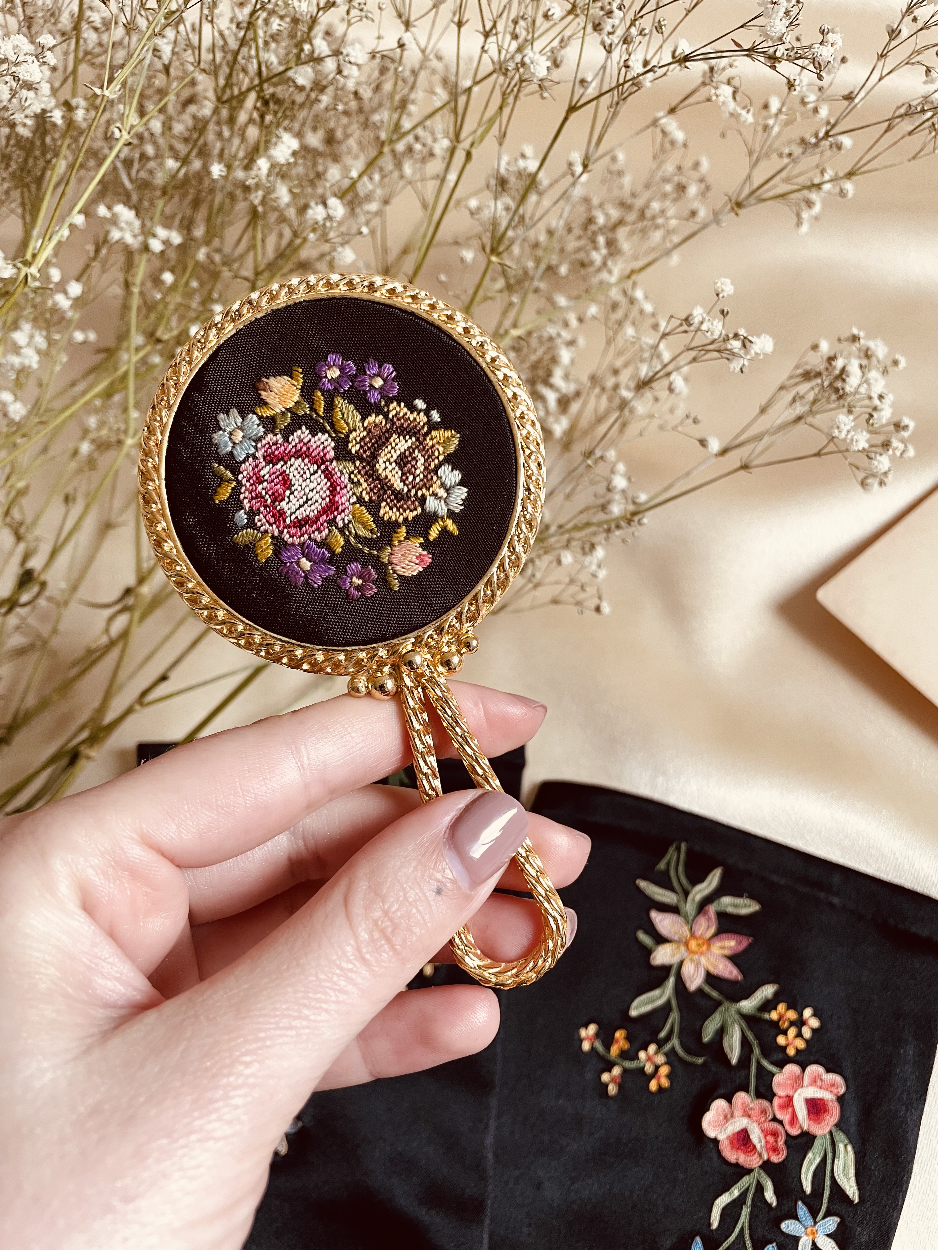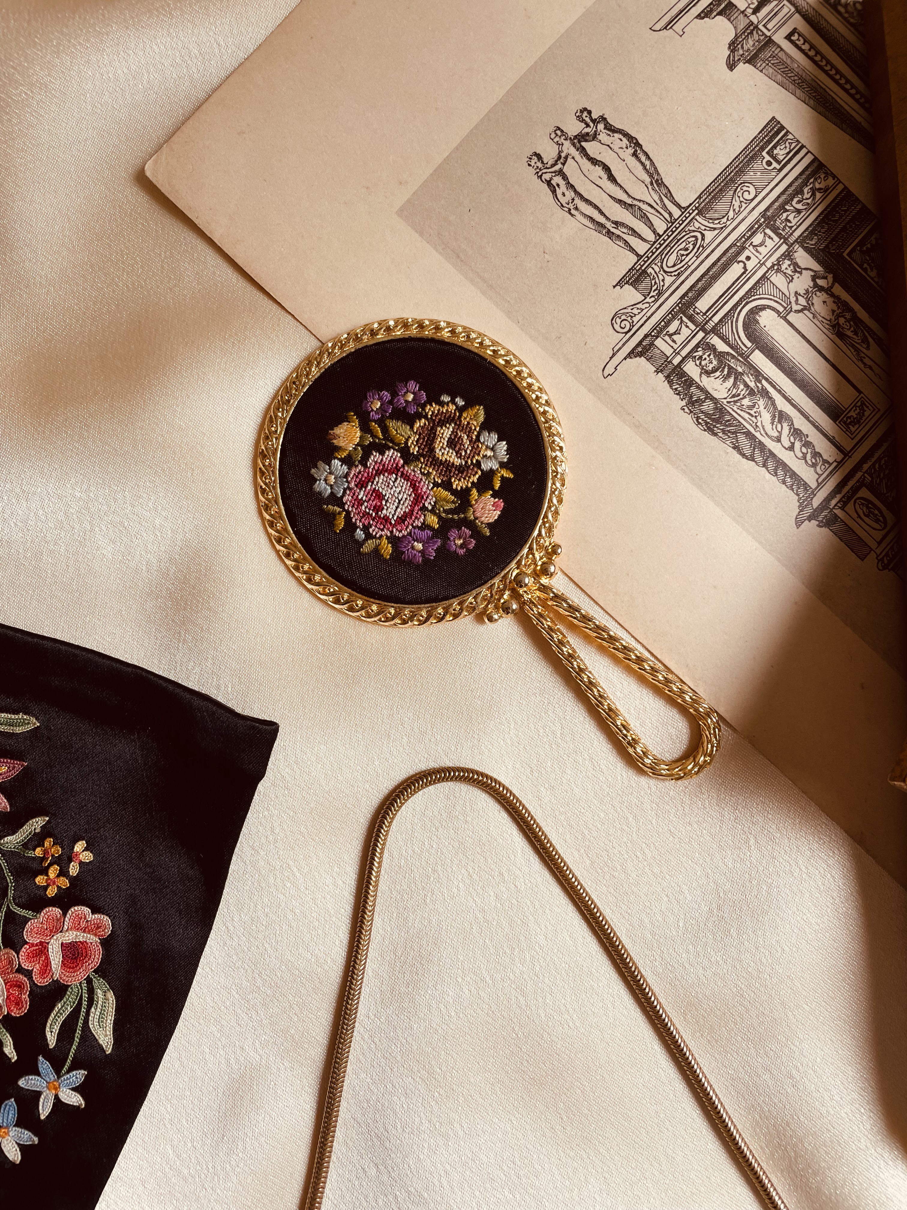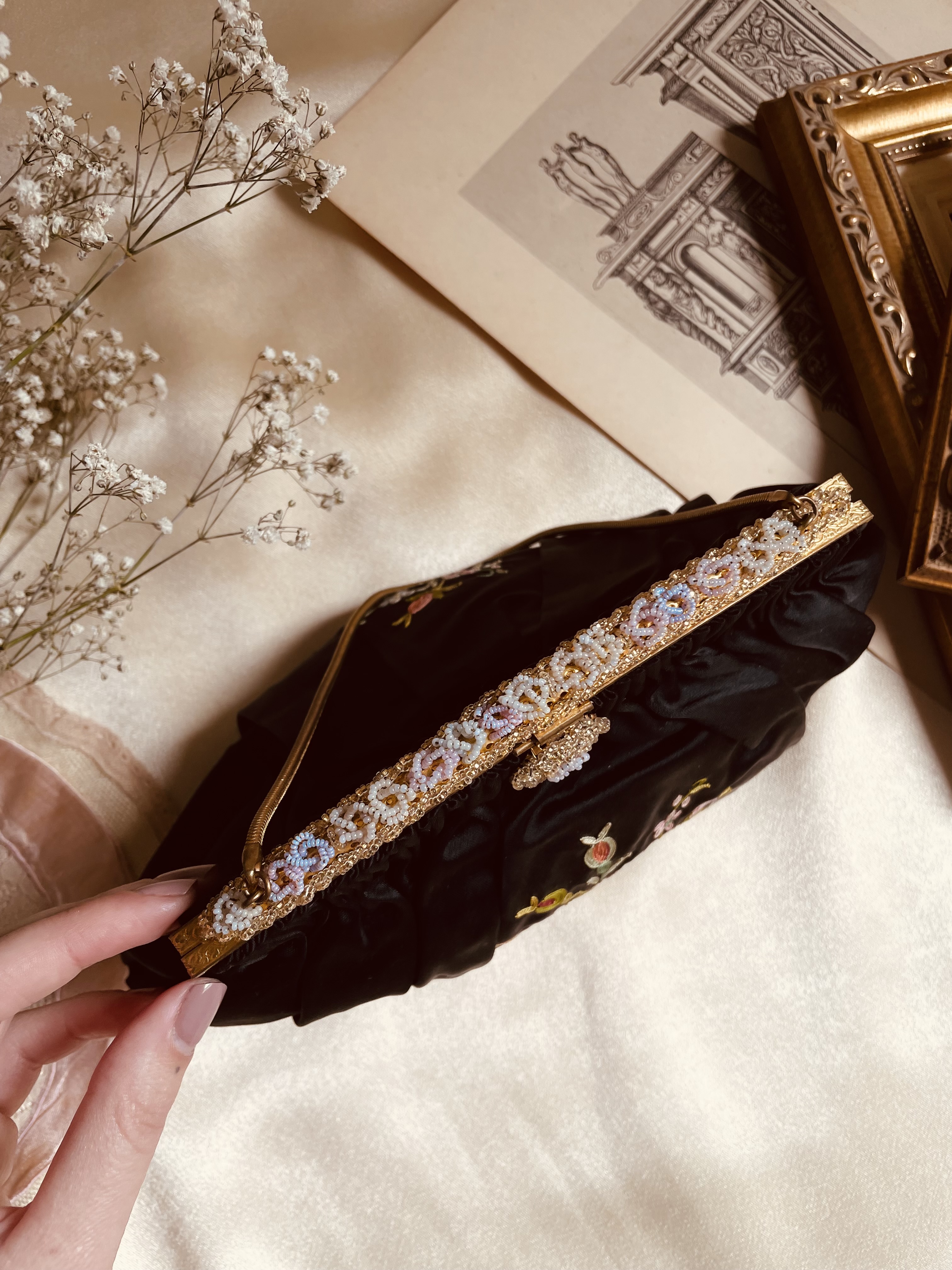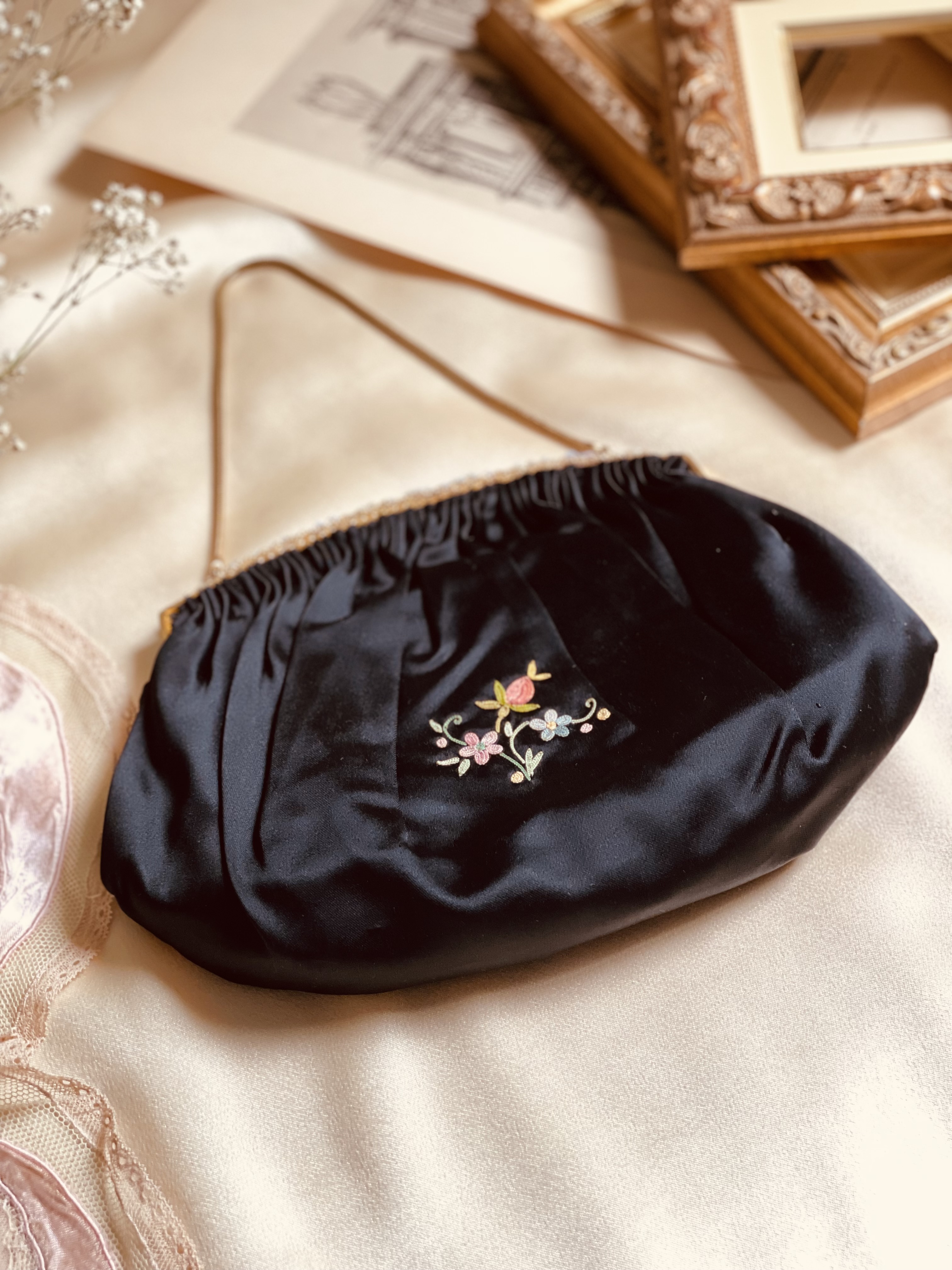 Um conjunto raro e sofisticado, composto por bolsa “Made in France” em cetim de seda preto (24 × 16 cm), ricamente bordado à mão com flores em tons suaves. Moldura dourada com detalhes artesanais e fecho com miçangas.