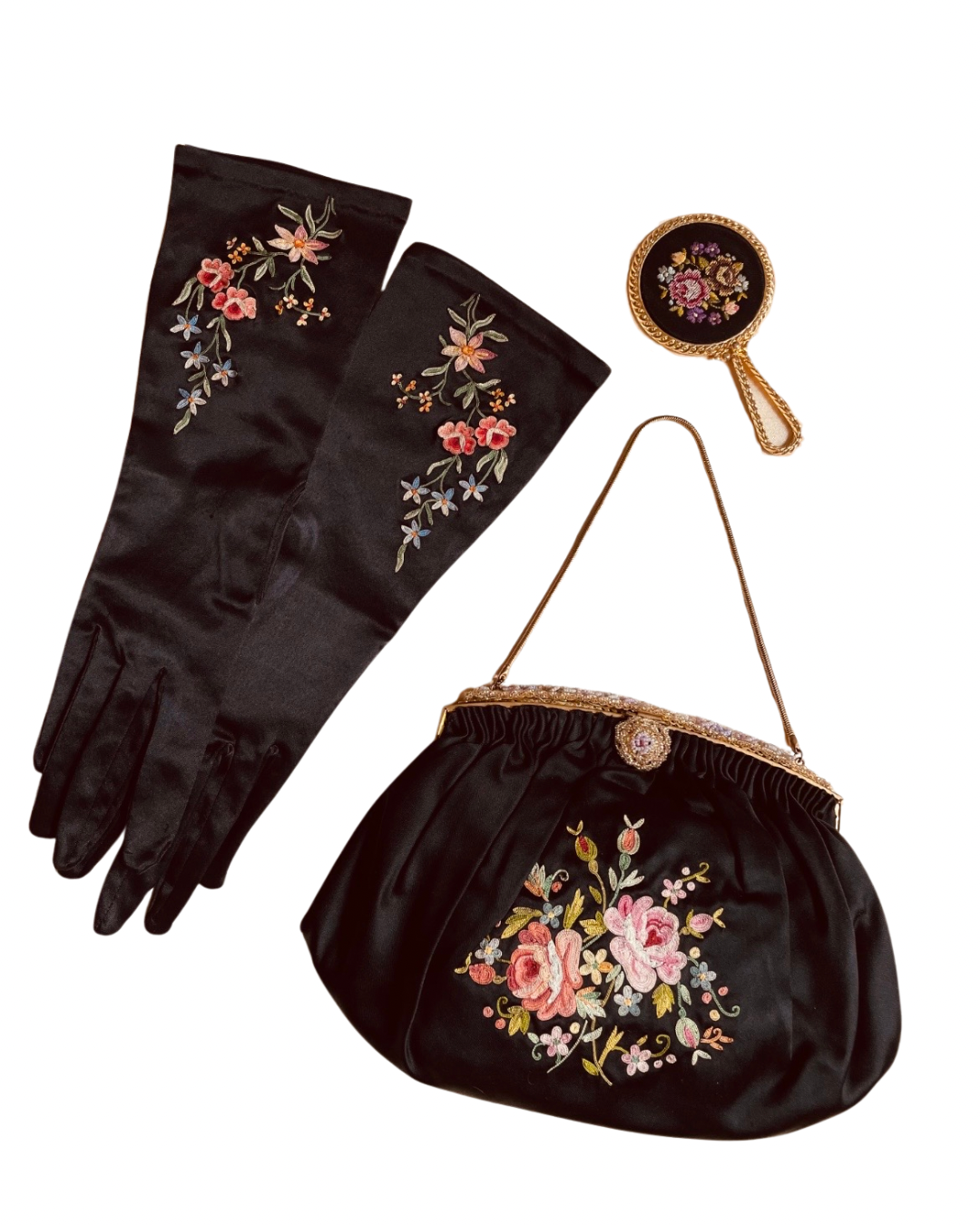 Magnífico conjunto vintage Bolsa / luvas e espelho de bolsa francesa original – 1920 – bordado floral impecável
