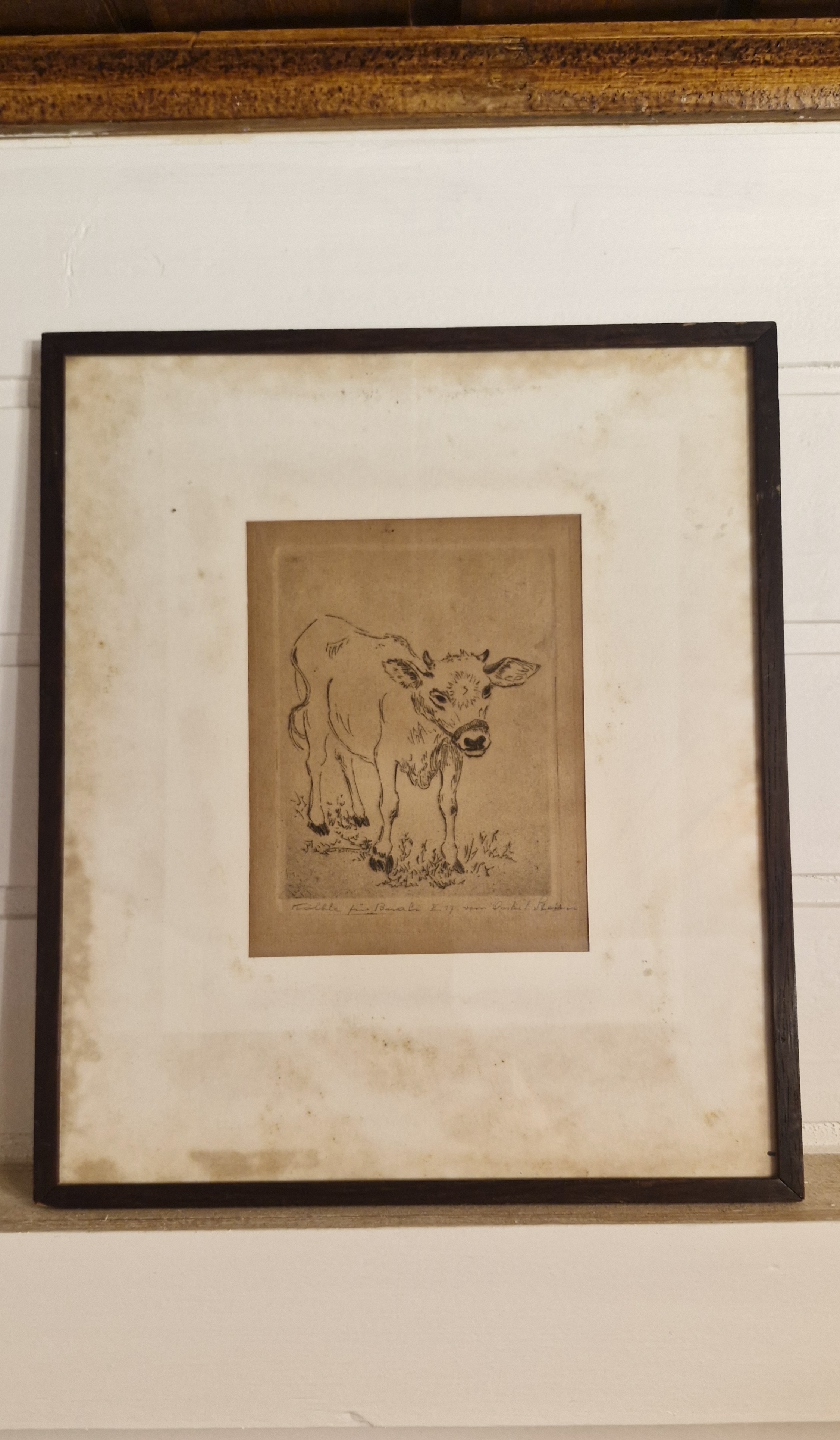 Quadro emoldurado com vidro. Gravura europeia do século XX, retratando um bezerro.