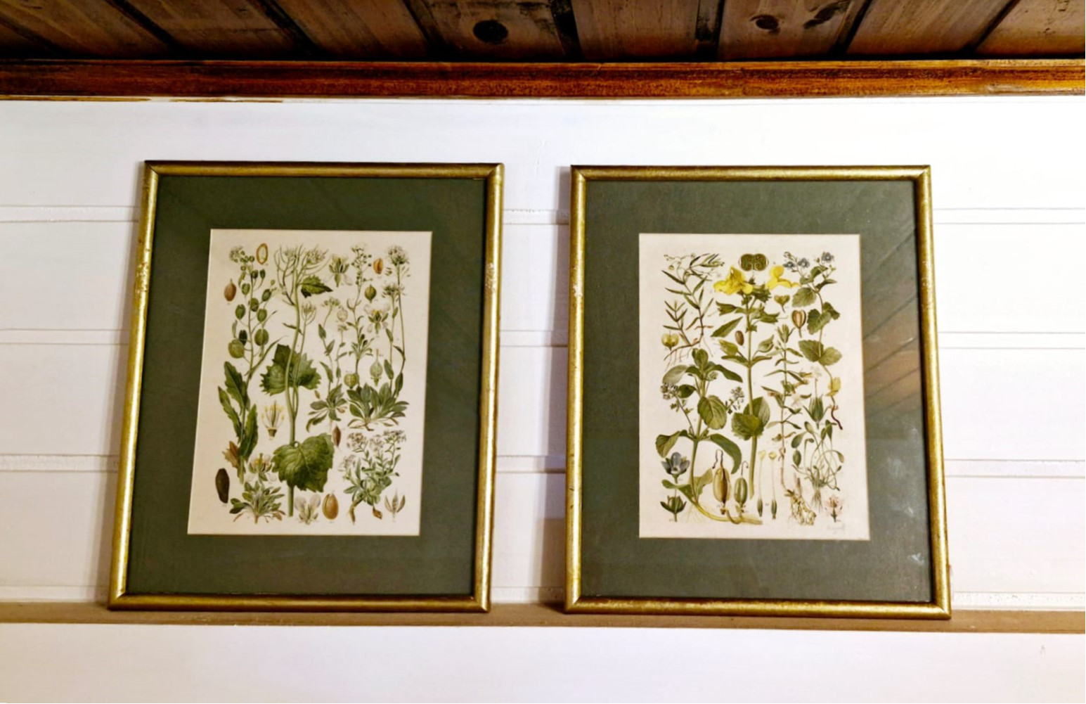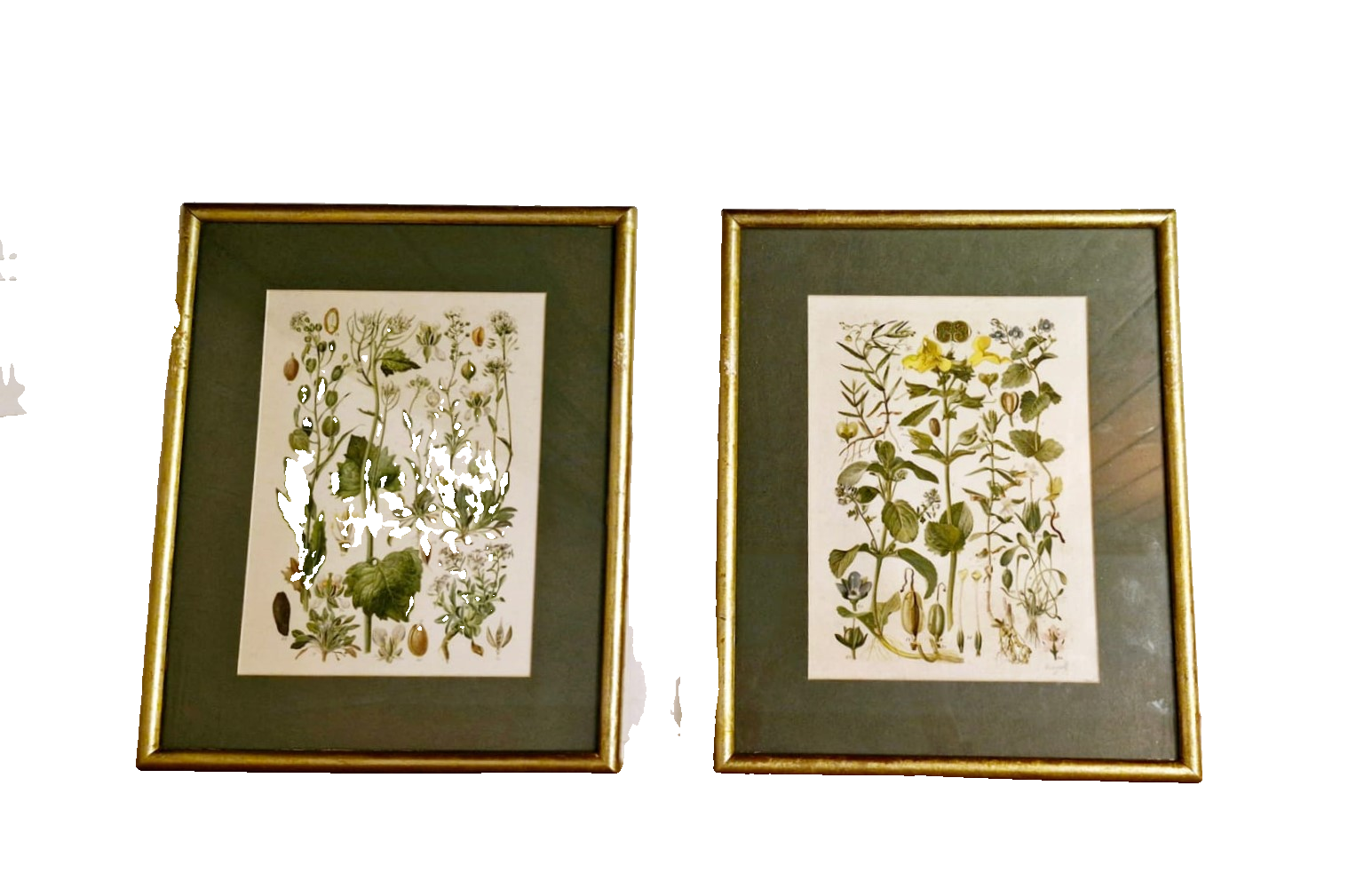 Lindas ilustrações botânicas vintage em quadro com moldura e vidro.