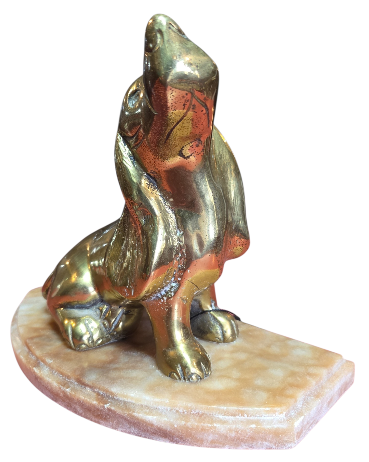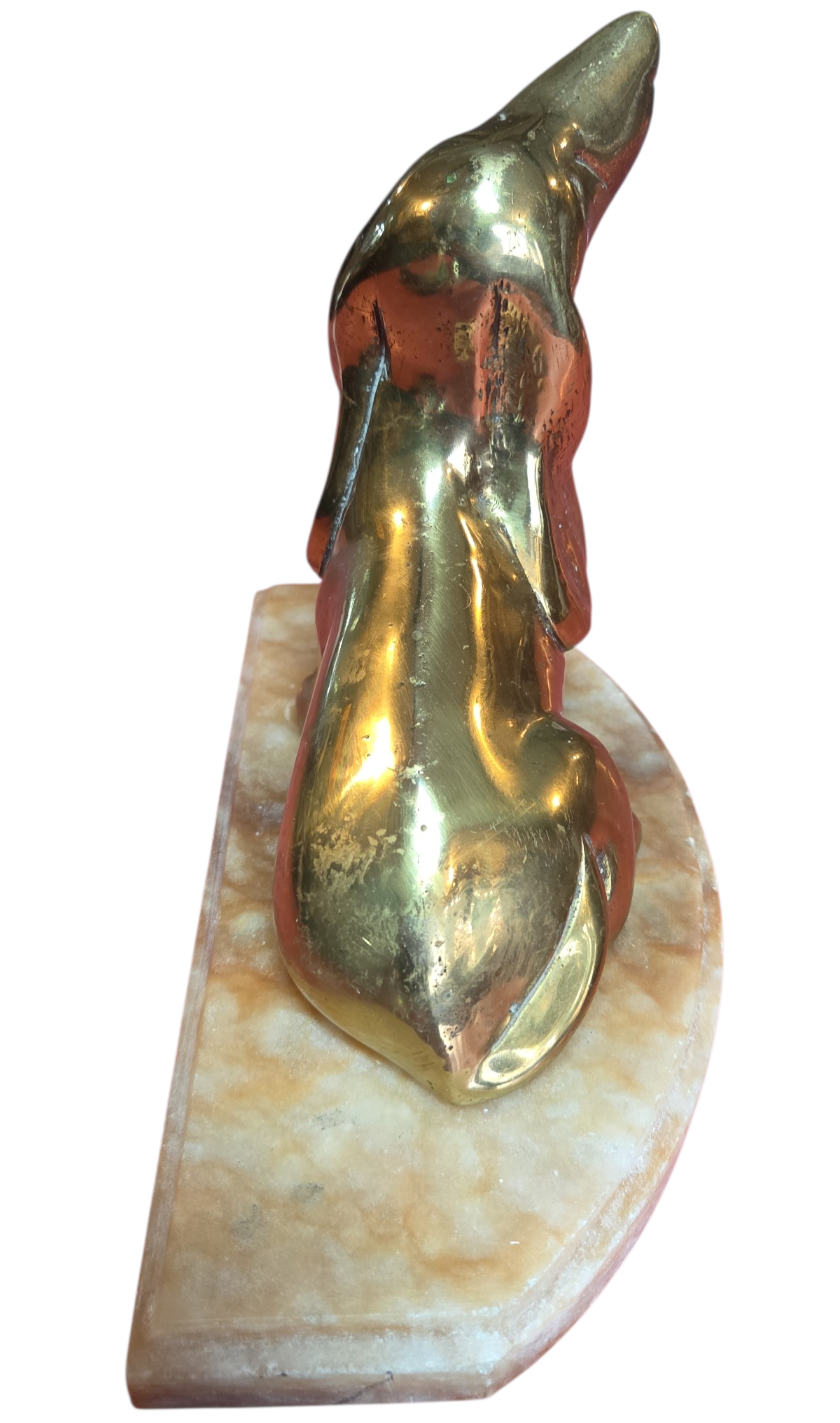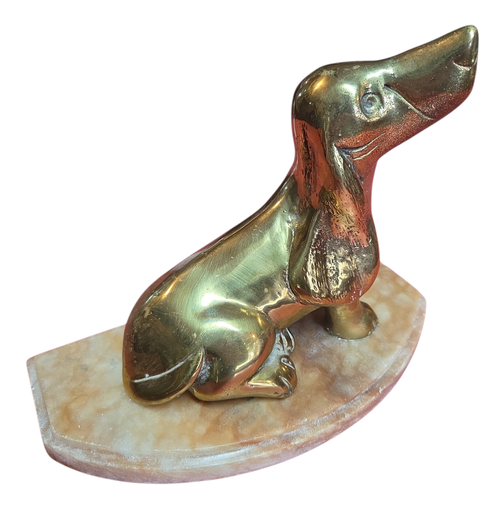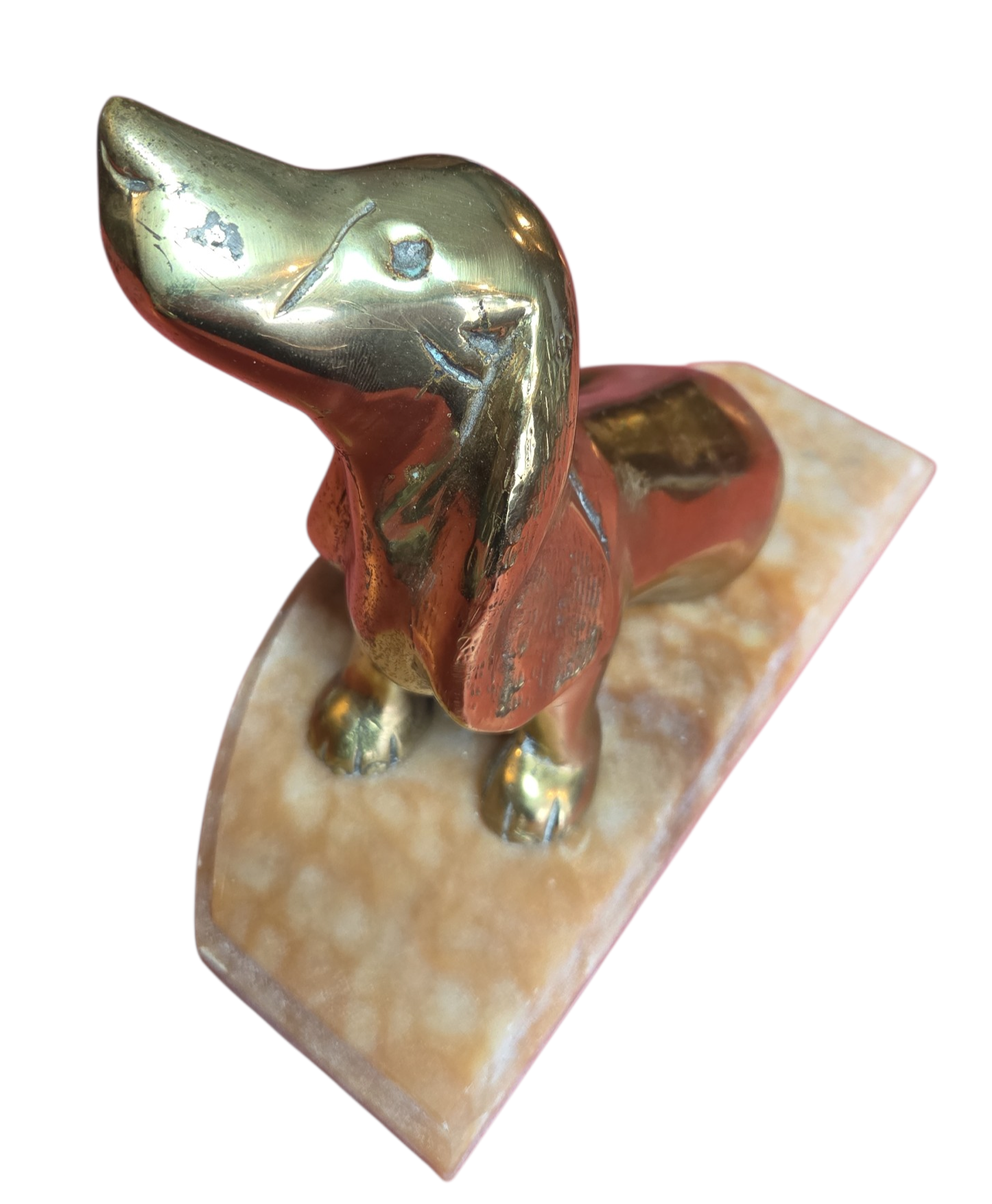 Distinta estatueta colecionável que representa, de forma estilizada e elegante, a silhueta de um cão da raça Dachshund. Esta peça é um excelente exemplo de objetos decorativos de escritório da metade do século XX, unindo a nobreza do metal fundido à solidez da pedra.