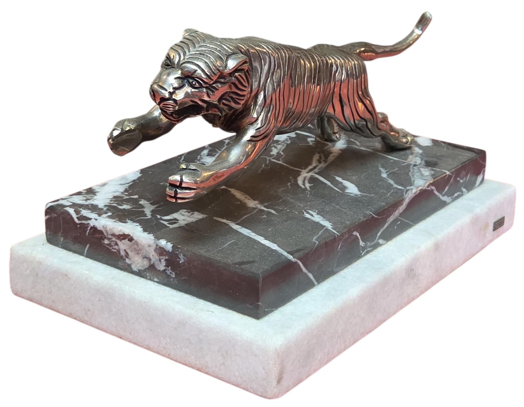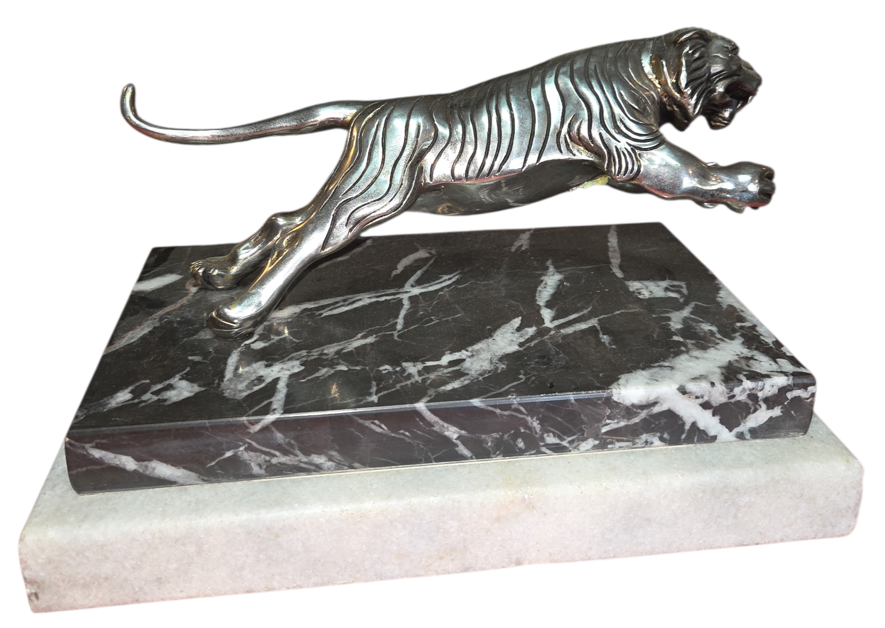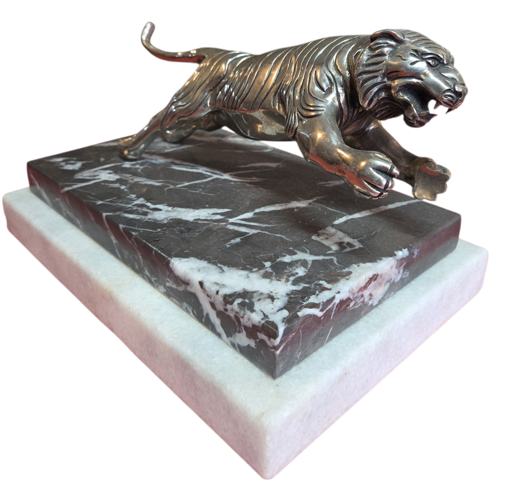 Impressionante peça decorativa vintage, esta escultura captura a força e o dinamismo de um tigre em posição de ataque. Com um trabalho de fundição detalhado e acabamento refinado, é um item de destaque para colecionadores de arte animalista e objetos de luxo.