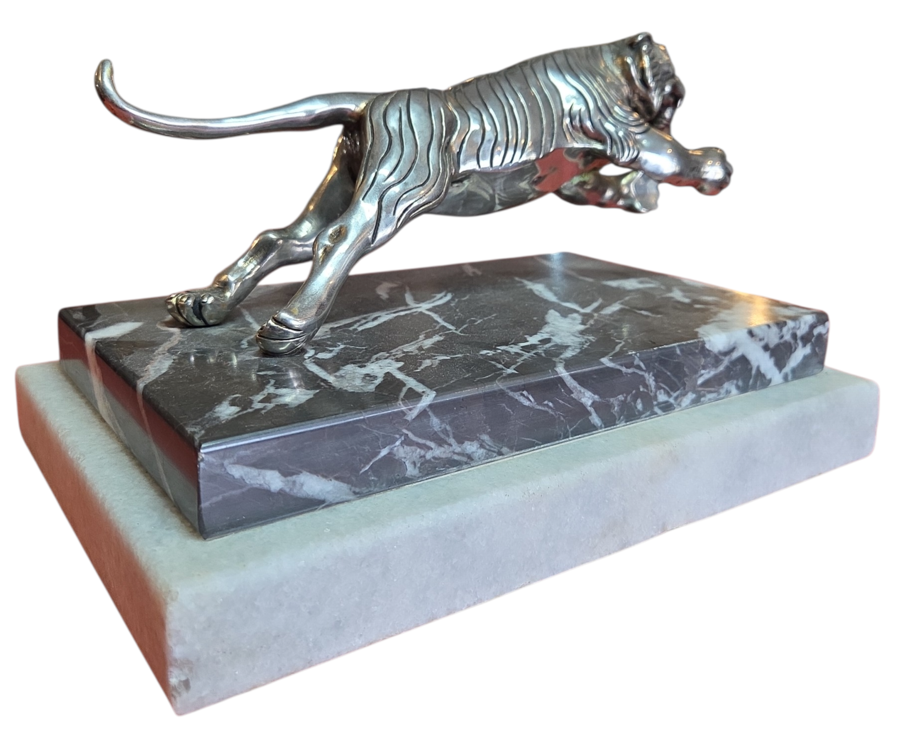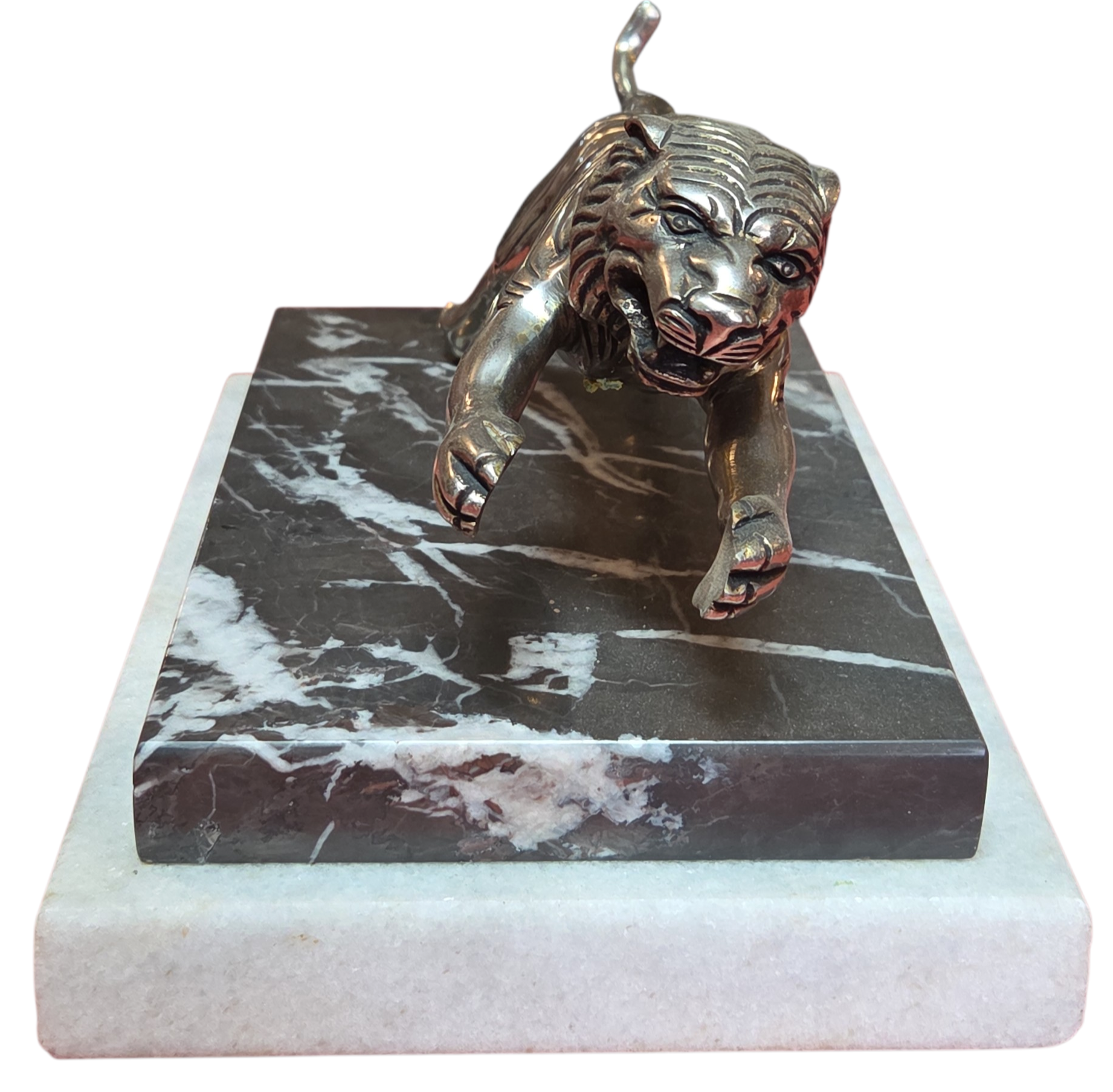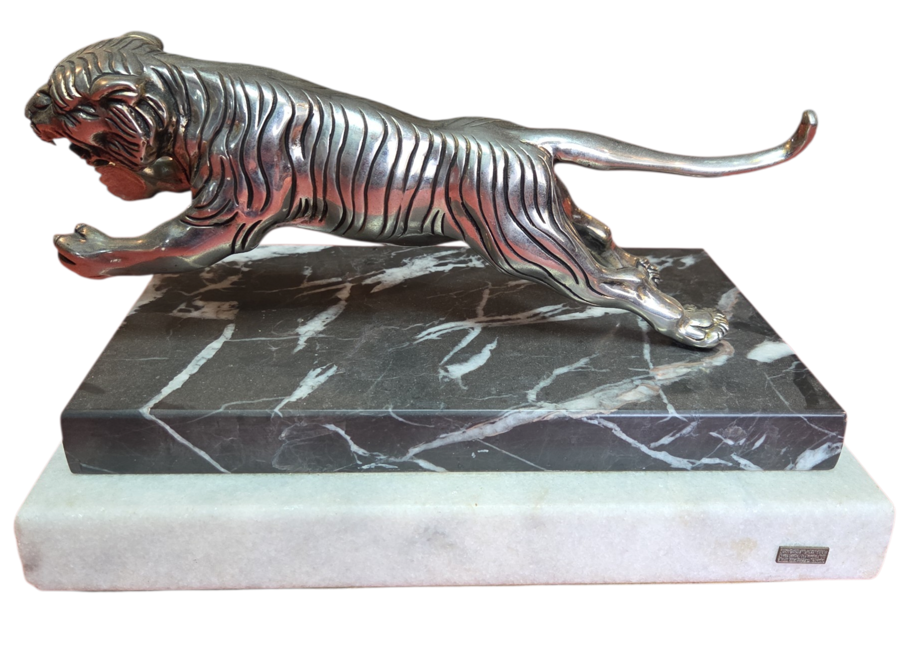 Impressionante peça decorativa vintage, esta escultura captura a força e o dinamismo de um tigre em posição de ataque. Com um trabalho de fundição detalhado e acabamento refinado, é um item de destaque para colecionadores de arte animalista e objetos de luxo.