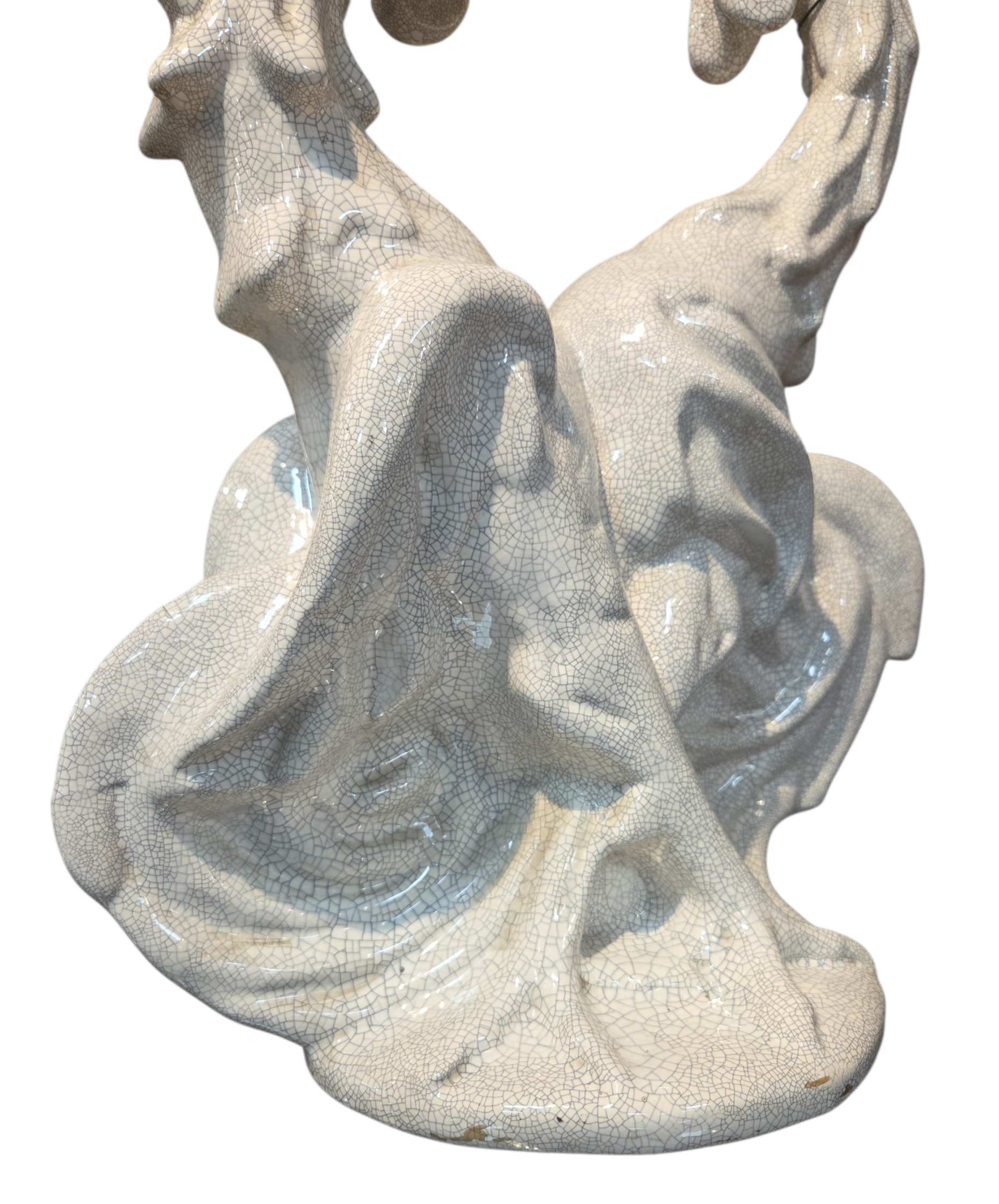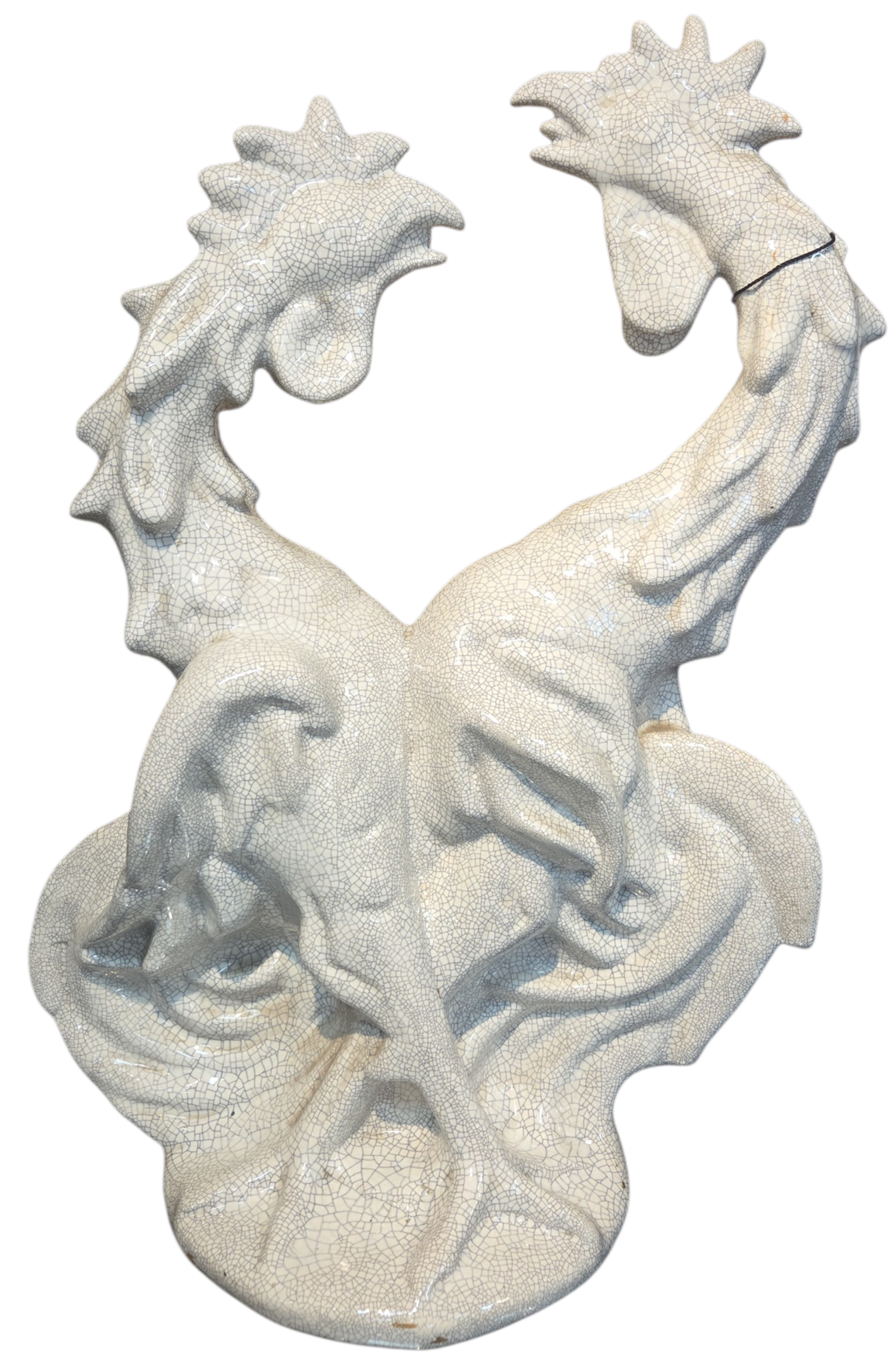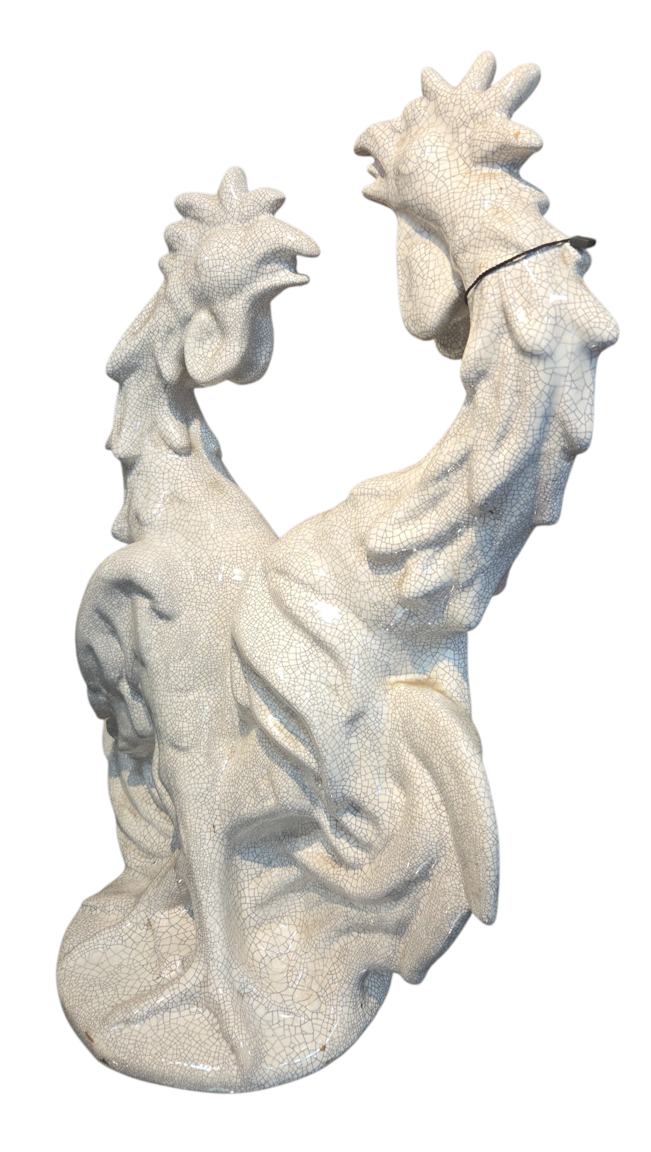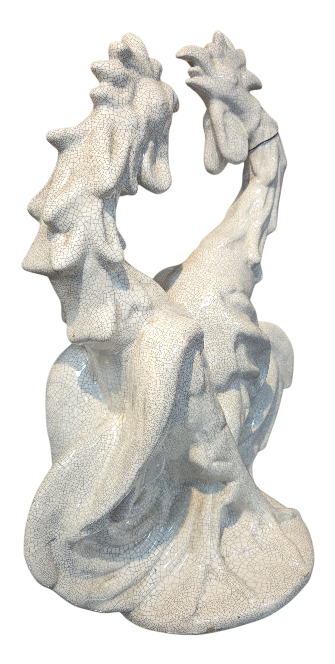 Uma peça de força e dinamismo extraordinários. Esta escultura em cerâmica representa a clássica "Briga de Galos", destacando-se pelo acabamento em esmalte craquelê que confere textura e profundidade histórica à obra. Com linhas fluidas e detalhes anatômicos marcantes, é uma peça de destaque para colecionadores de arte e entusiastas do design vintage.