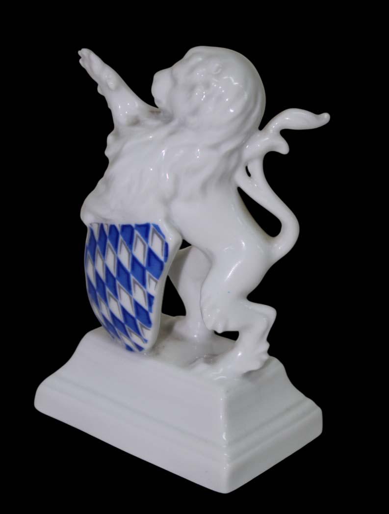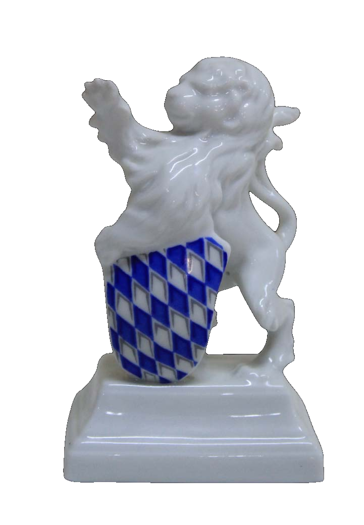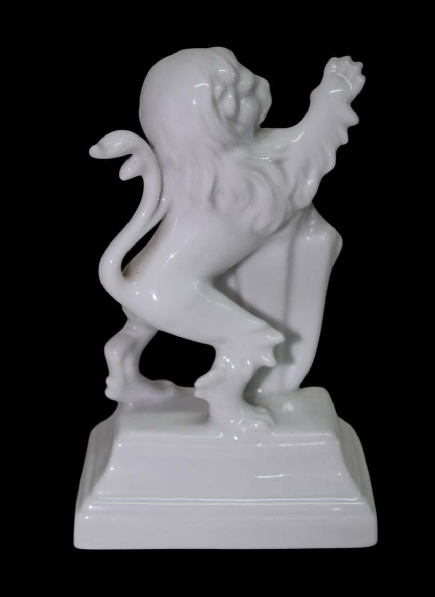 Pequena e delicada escultura de leão branco HERÁLDICO, da manufatura BAVARIA West Germany, com escudo azul.