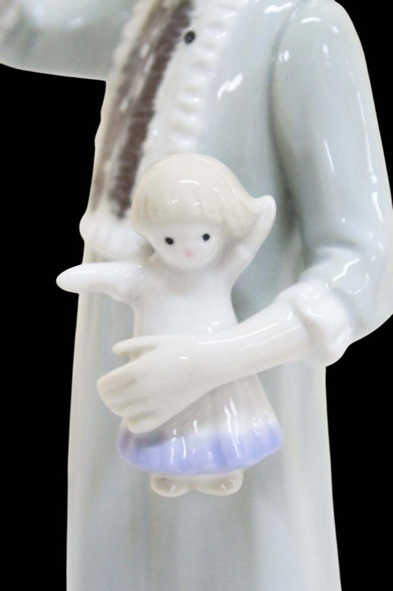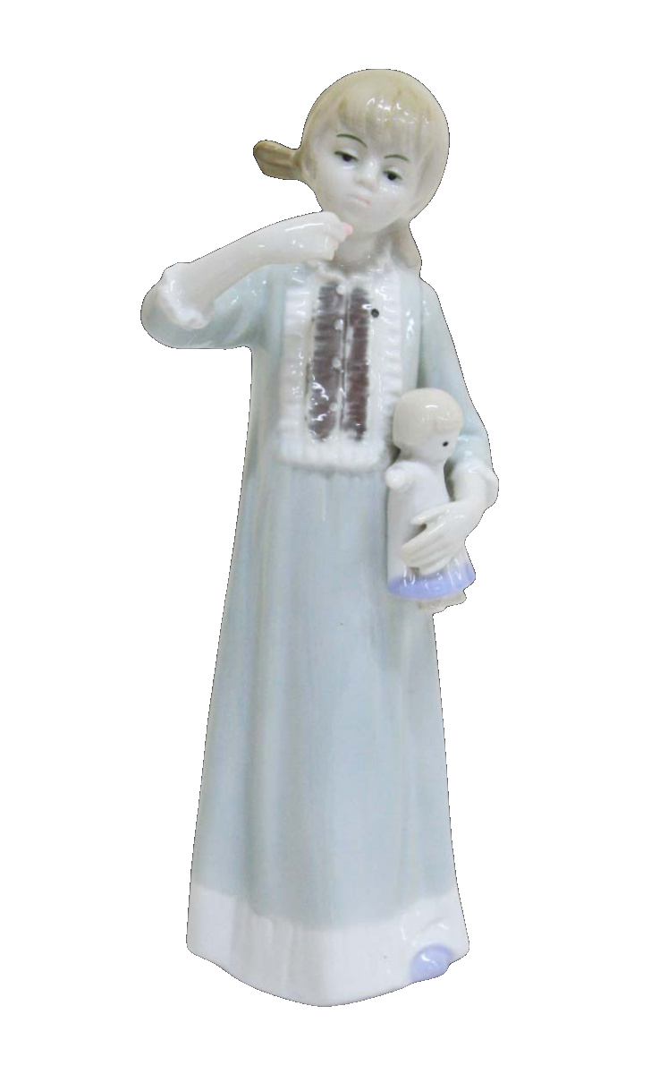 Linda escultura de porcelana vitrificada, retratando uma menina em pé com expressão delicada, segurando uma boneca nos braços, ao gosto Lladró. Apresenta pintura manual em policromia.