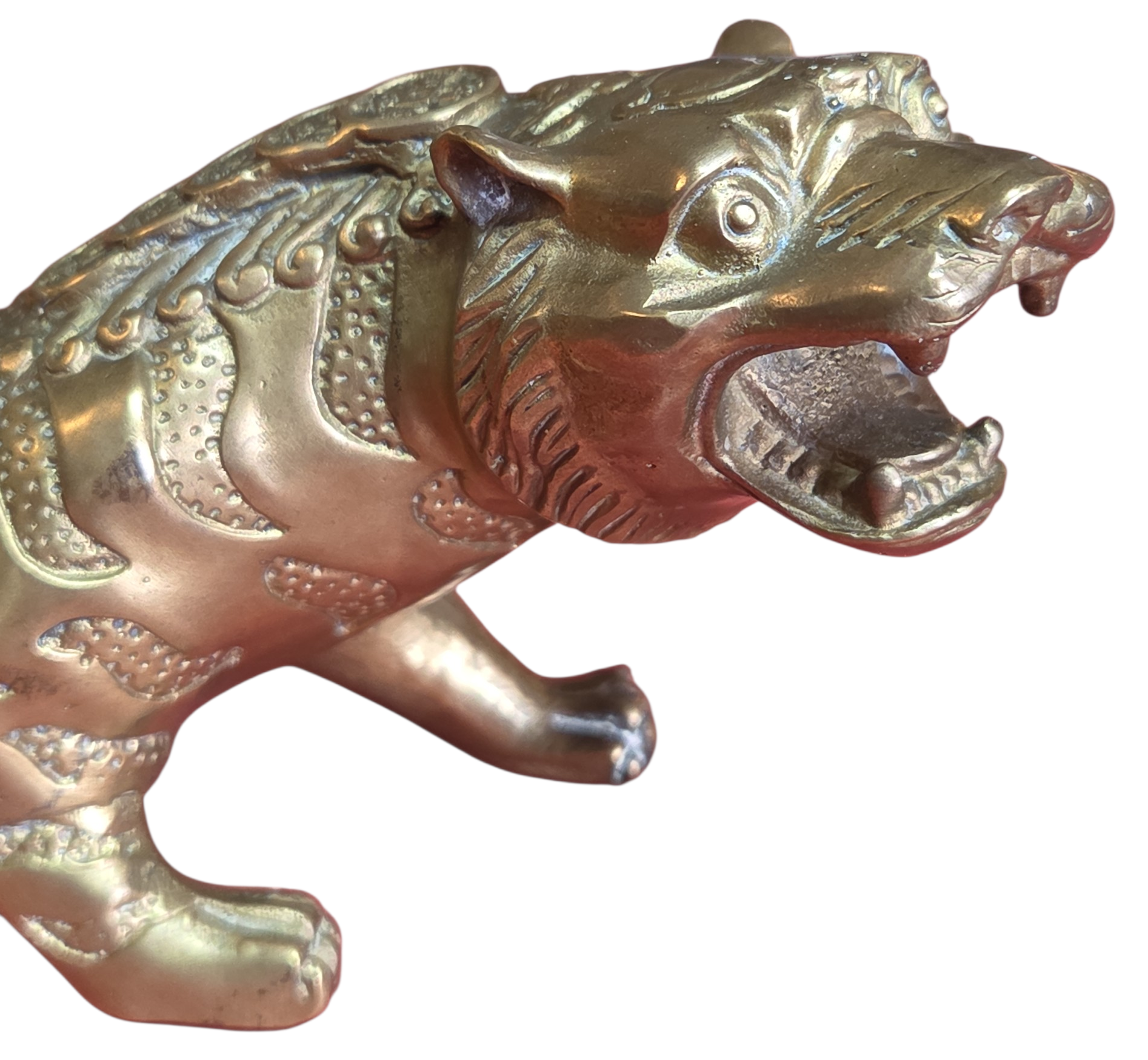 Esta é uma peça imponente e rica em detalhes, ideal para colecionadores e amantes de decoração clássica. A escultura apresenta um tigre em postura de ataque ou rugido, capturando a força e o dinamismo do animal com grande expressividade.