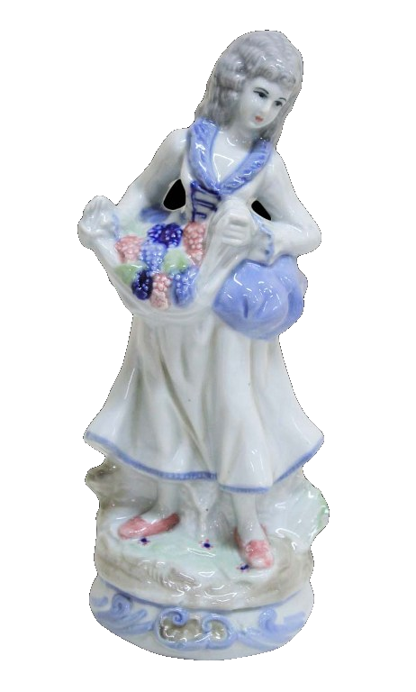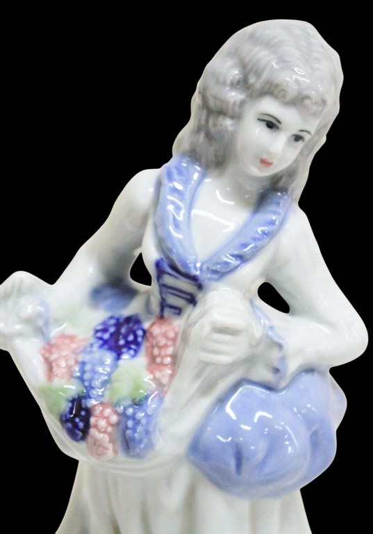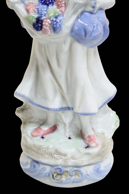 Belíssima escultura em porcelana alemã pintada a mão, dos anos 50, ricamente policromada e folheada a ouro, representando " Dama de época com buquê de flores ", peça numerada na base.