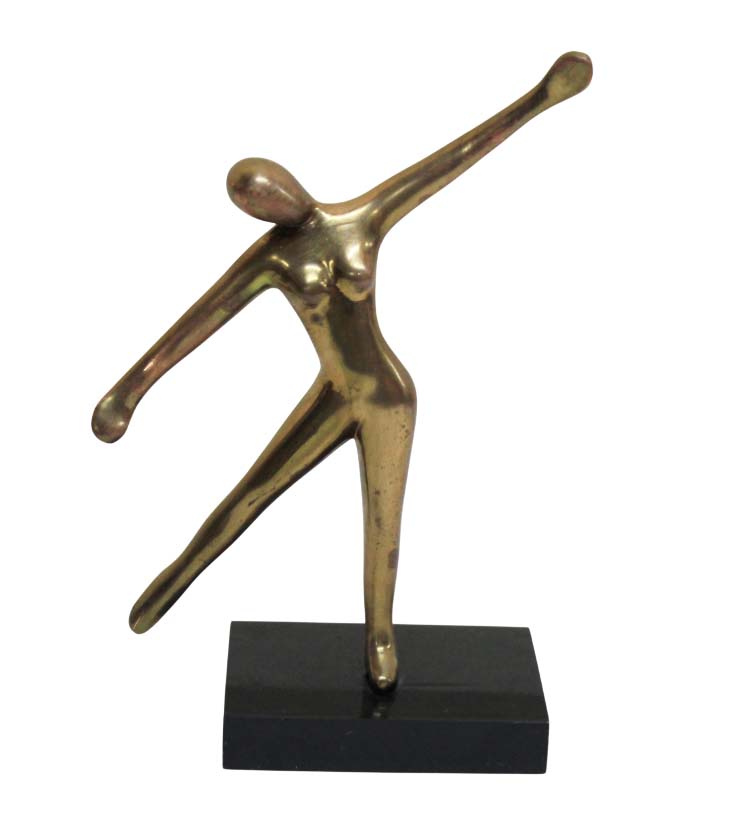Escultura em metal dourado, representando figura feminina sobre base retangular preta.