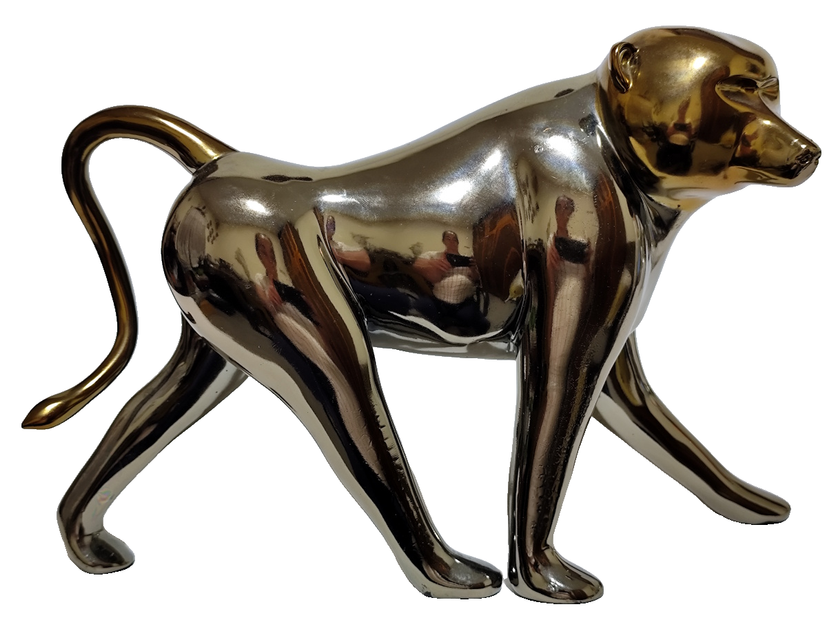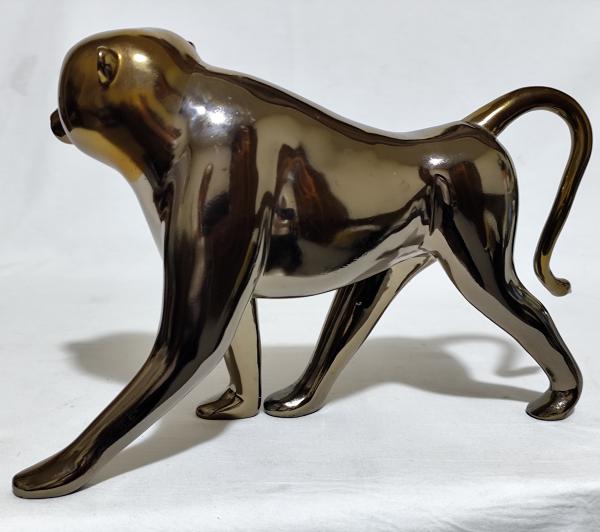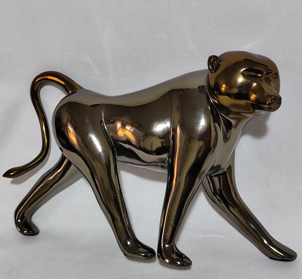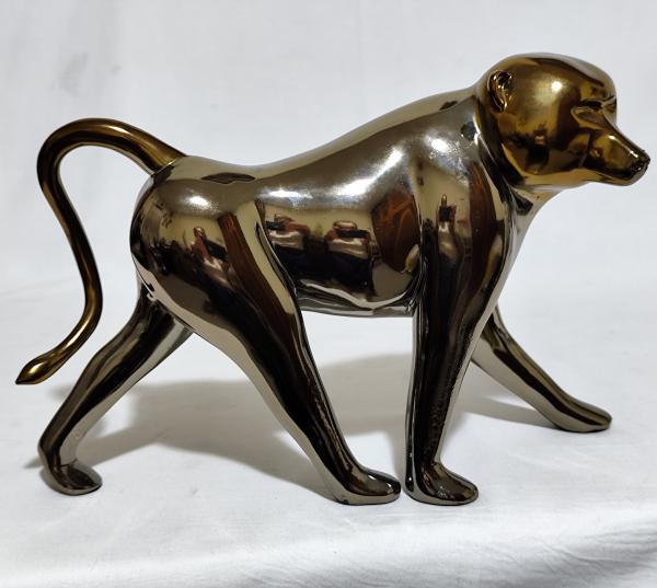 Grande escultura decorativo de babuíno em material rígido em tons dourado e fumê. Medidas 21 cm alt. X 27 cm compr.