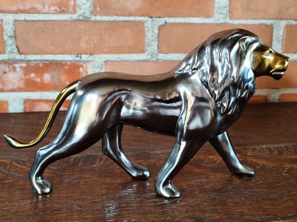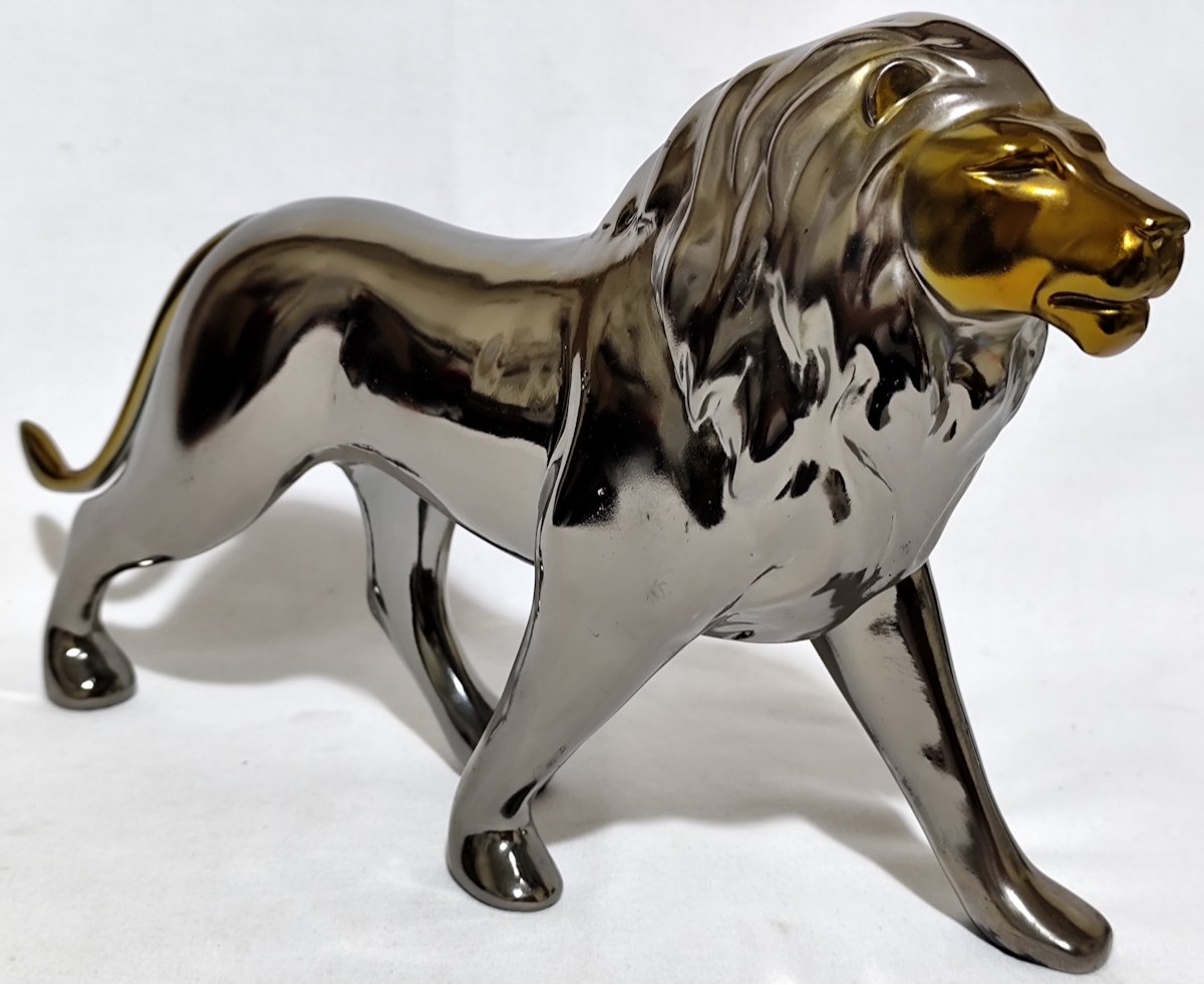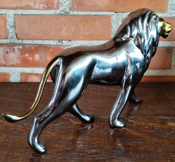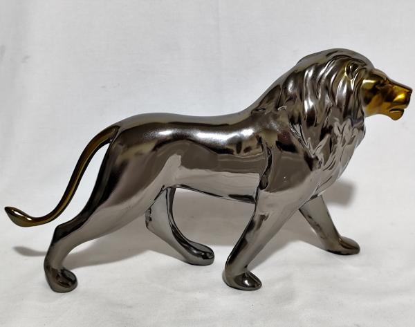 Grande escultura decorativo de leão em material rígido em tons dourado e fumê. Medidas 20,5 cm alt. X 33 cm compr.
