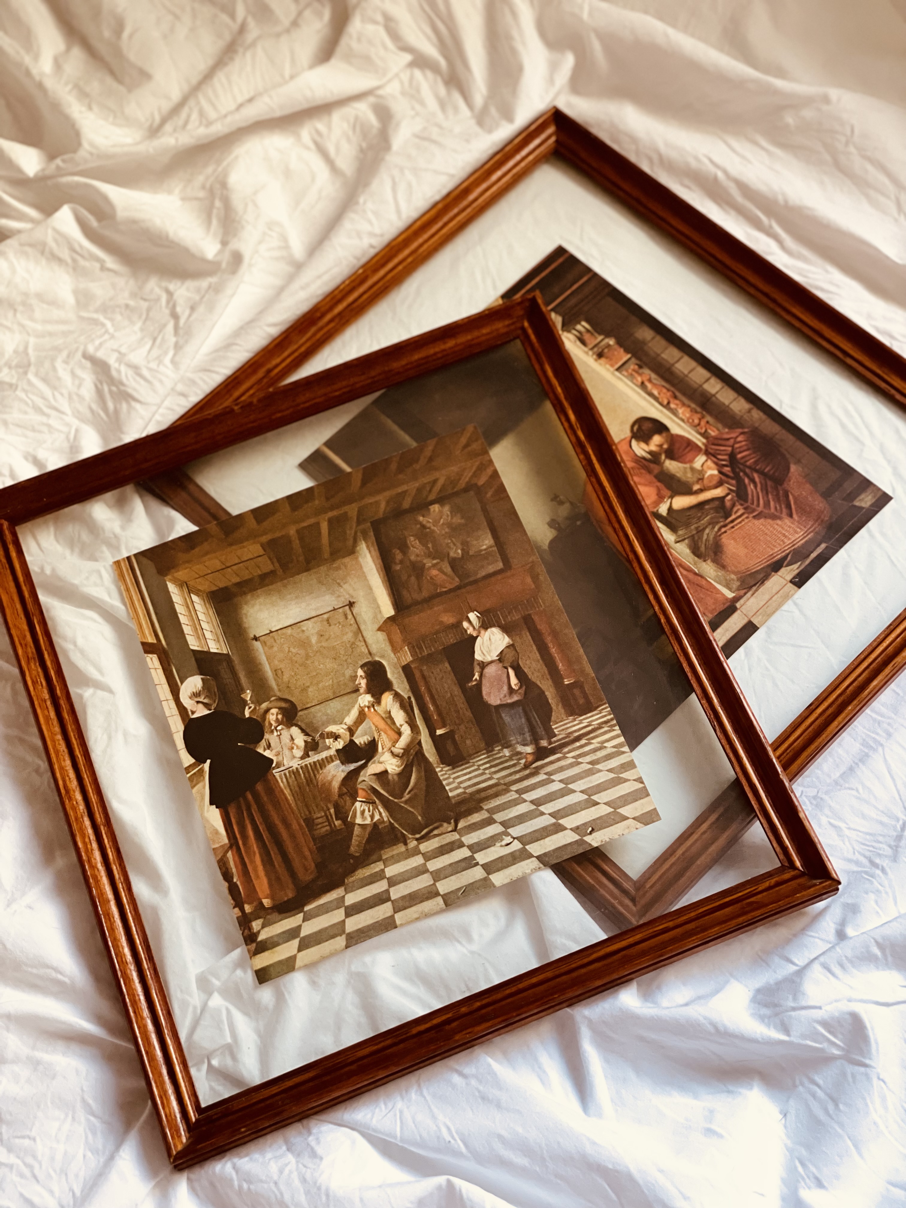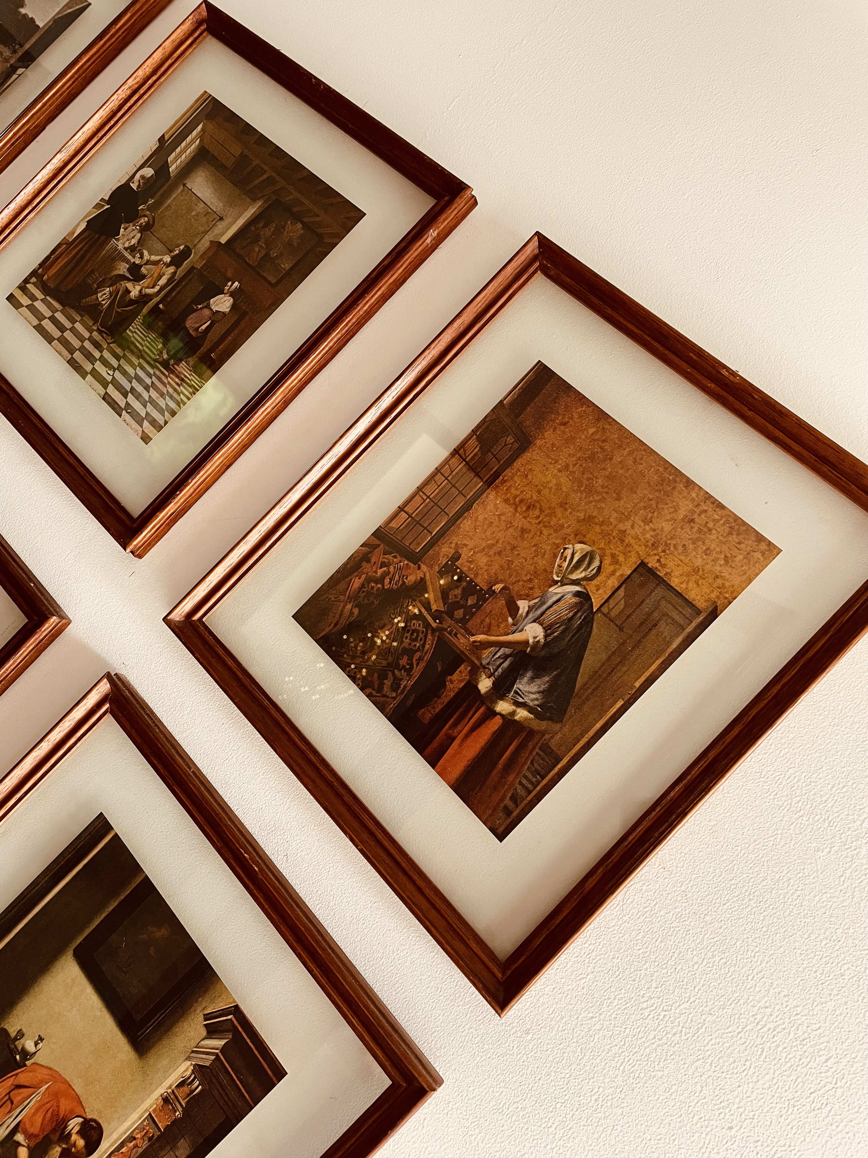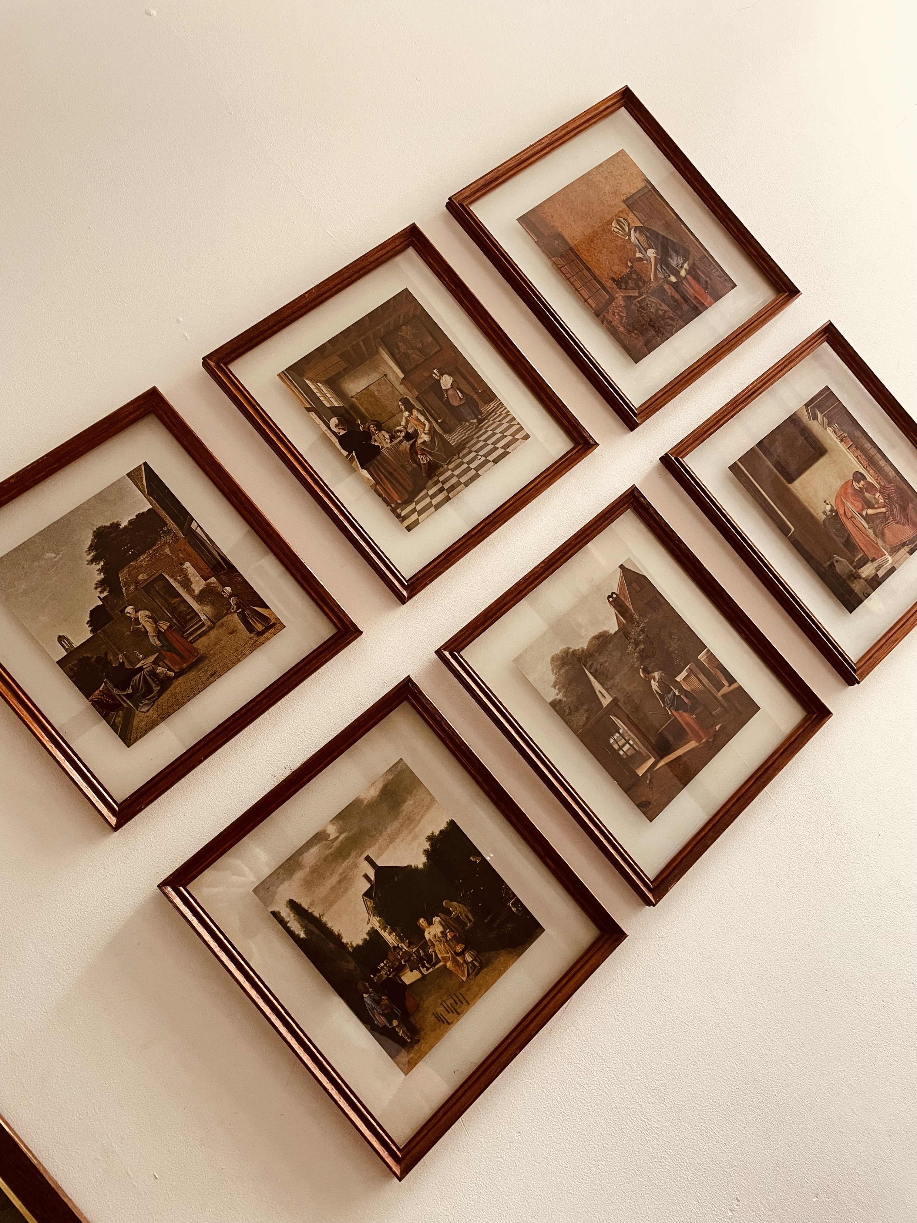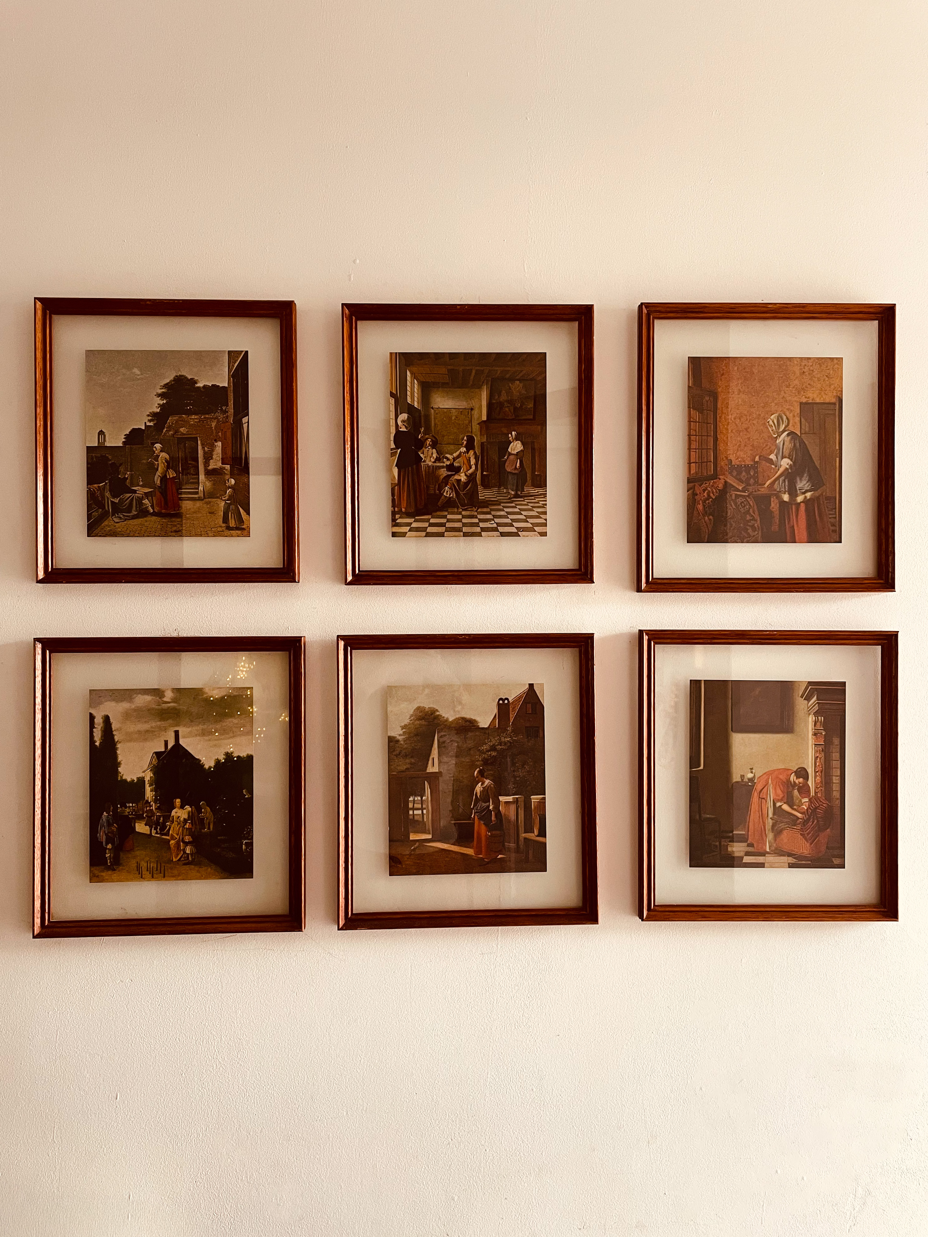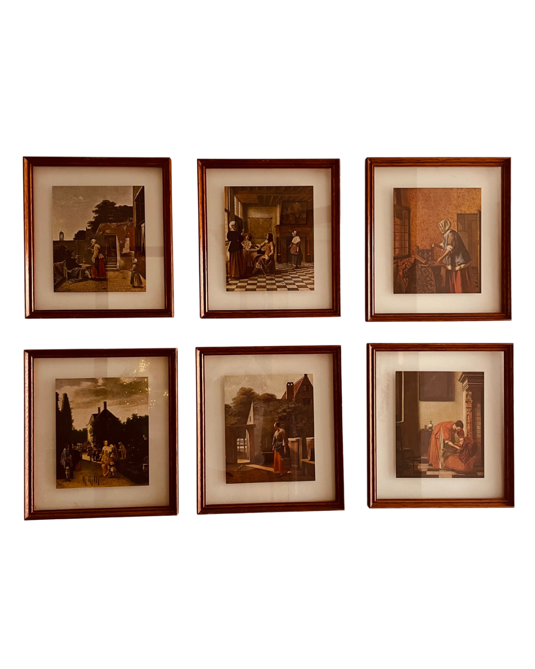 Belíssimo conjunto composto por seis quadros inspirados na pintura de gênero da chamada “Era de Ouro” holandesa (século XVII), reunindo reproduções de diferentes mestres do período.