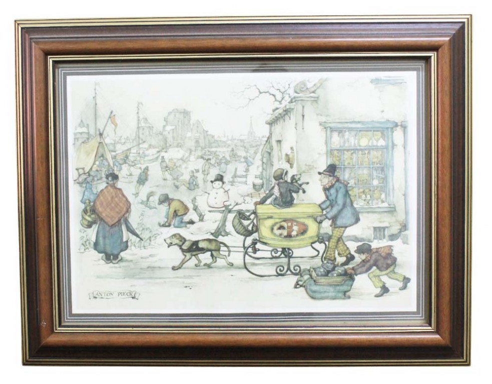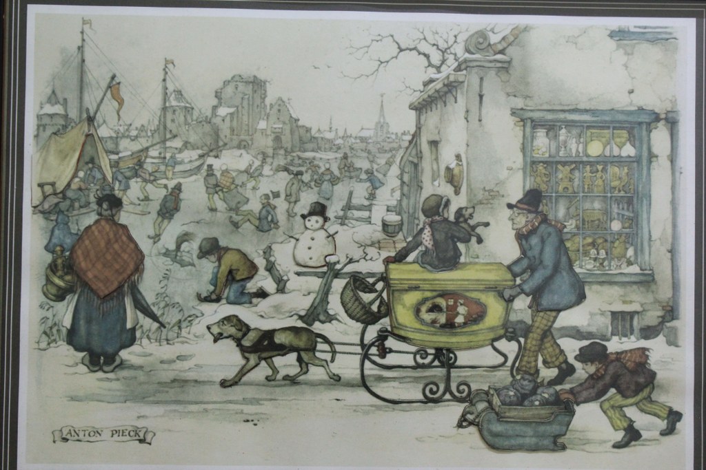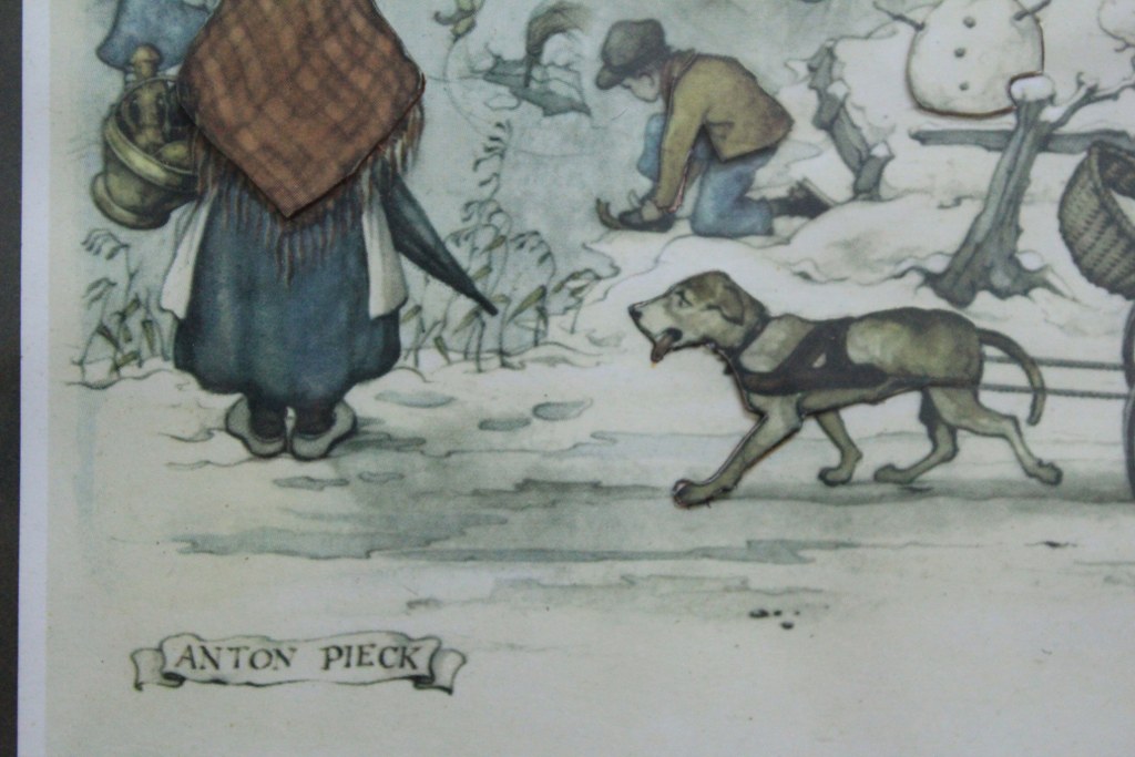 A assinatura ANTON PIECK na parte inferior da imagem identifica o renomado artista gráfico holandês 1895-1987. Conhecido por suas ilustrações nostálgicas e detalhadas de cenas da vida cotidiana.