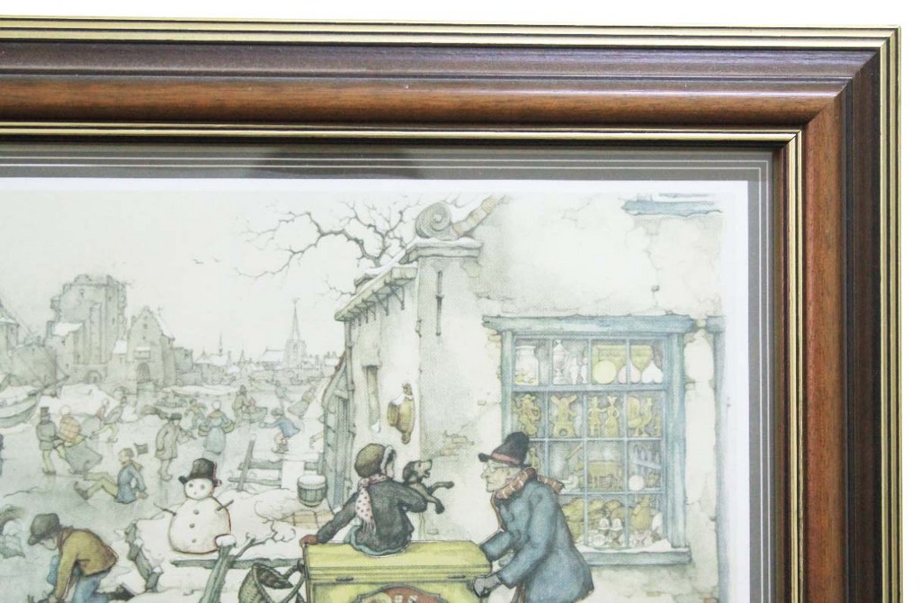 Gravura de uma cena de inverno com pessoas em atividades, caracterizada pelo estilo do artista holandês ANTON PIECK. Moldura em madeira nobre com filetes dourados.