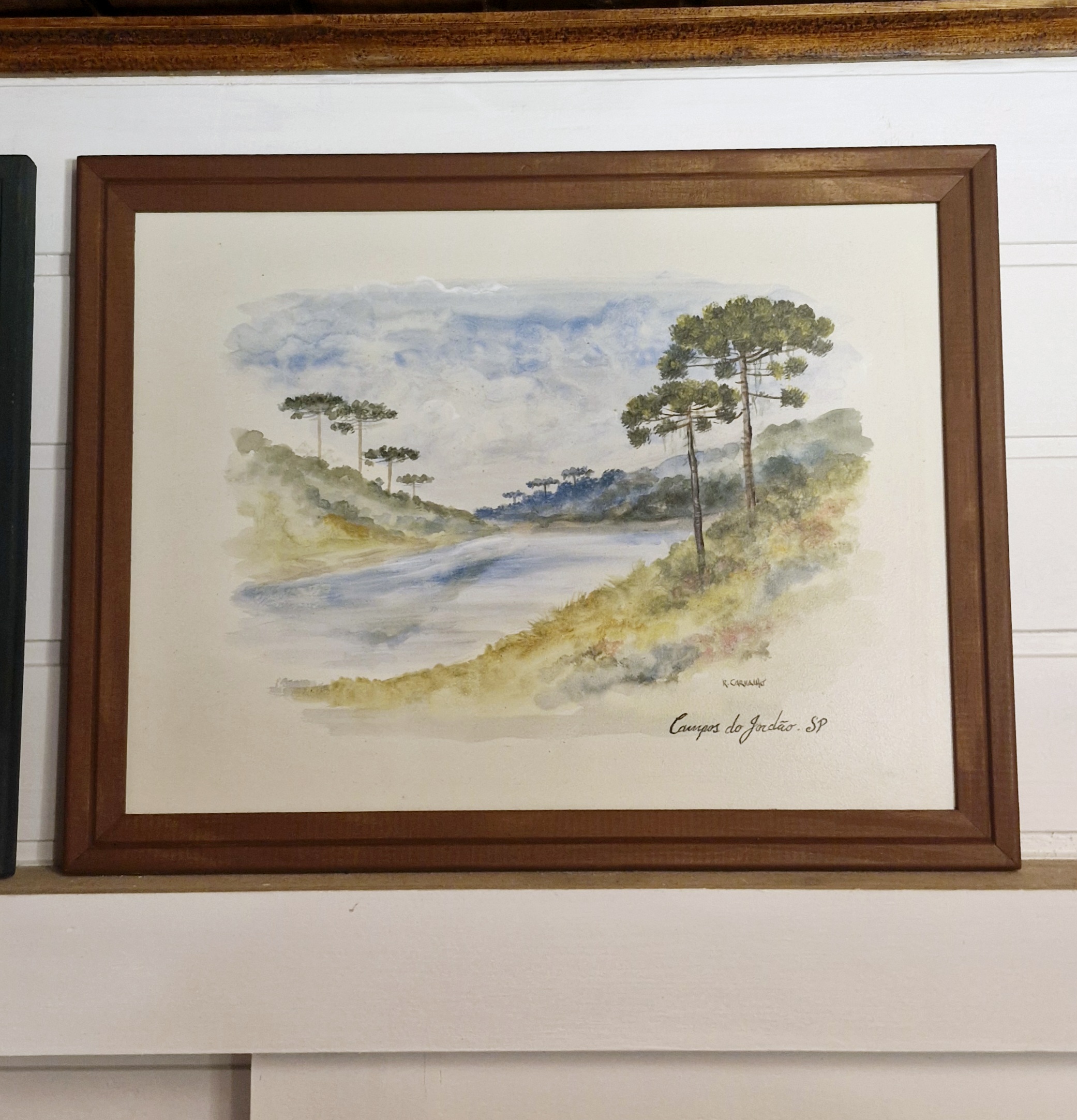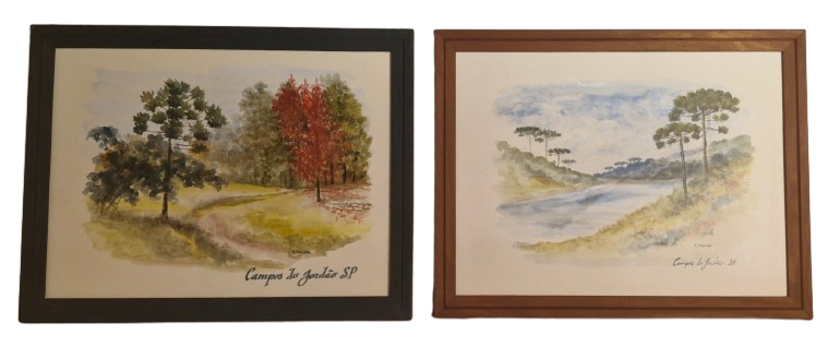 Belo par de aquarelas pintadas à mão por artista local, representando a natureza de Campos do Jordão com Araucária, Liquidâmbar e montanhas.