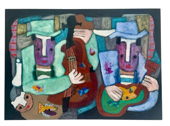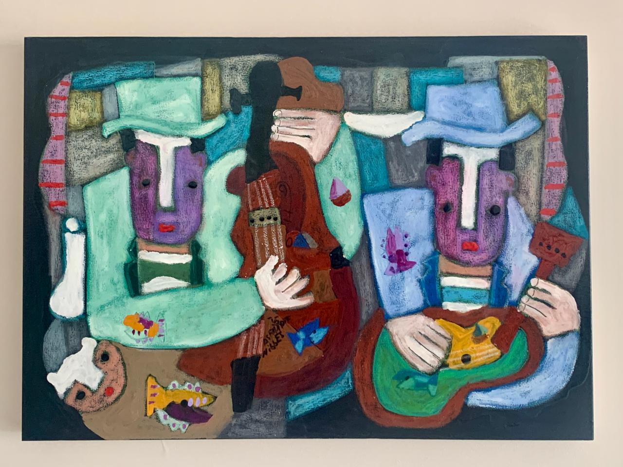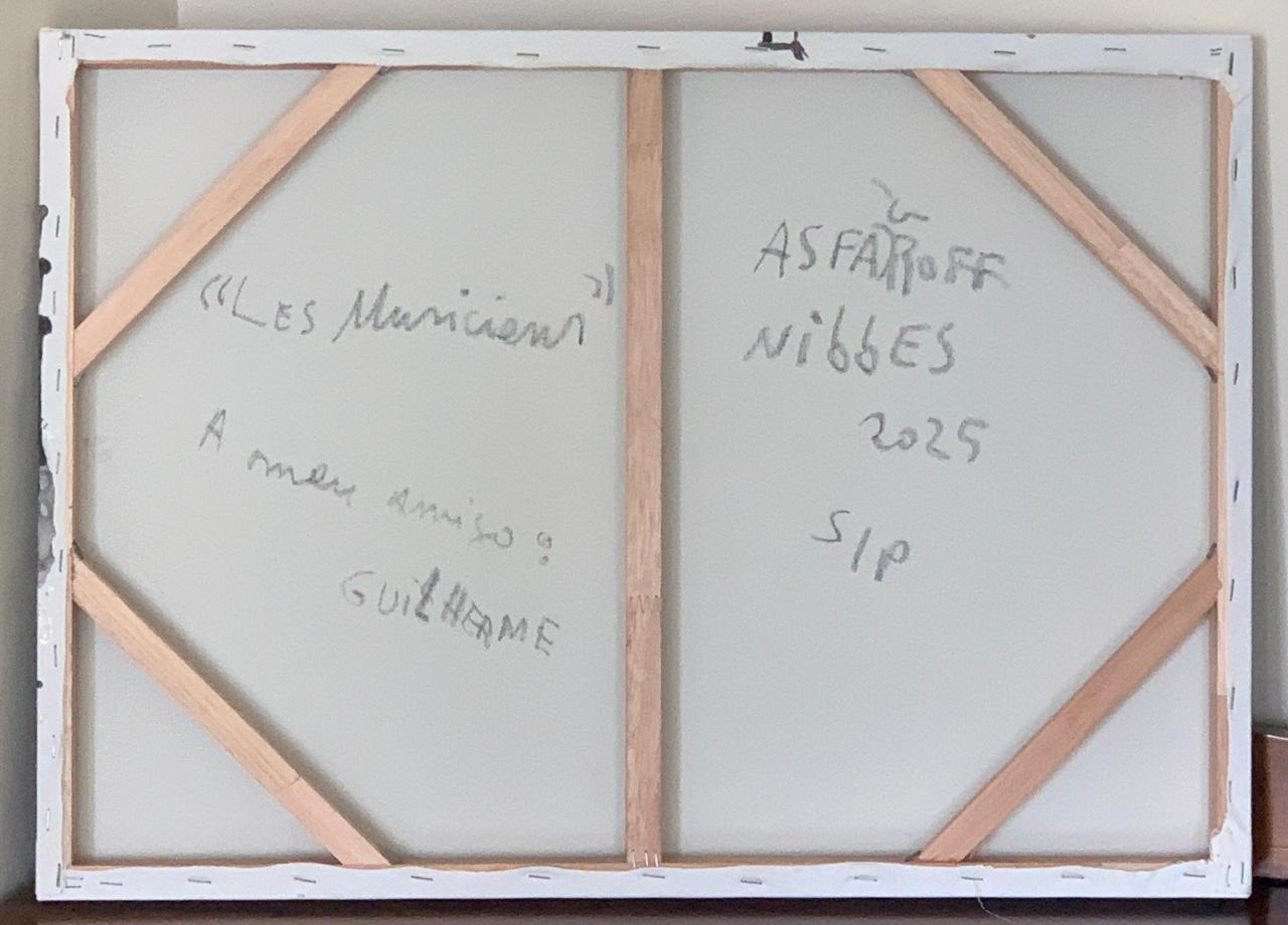 Asfaduroff Nibbes, Les Musiciens 2025, em acrílico sobre tela, AST, AC, chassis largo, dedicatória do autor.
