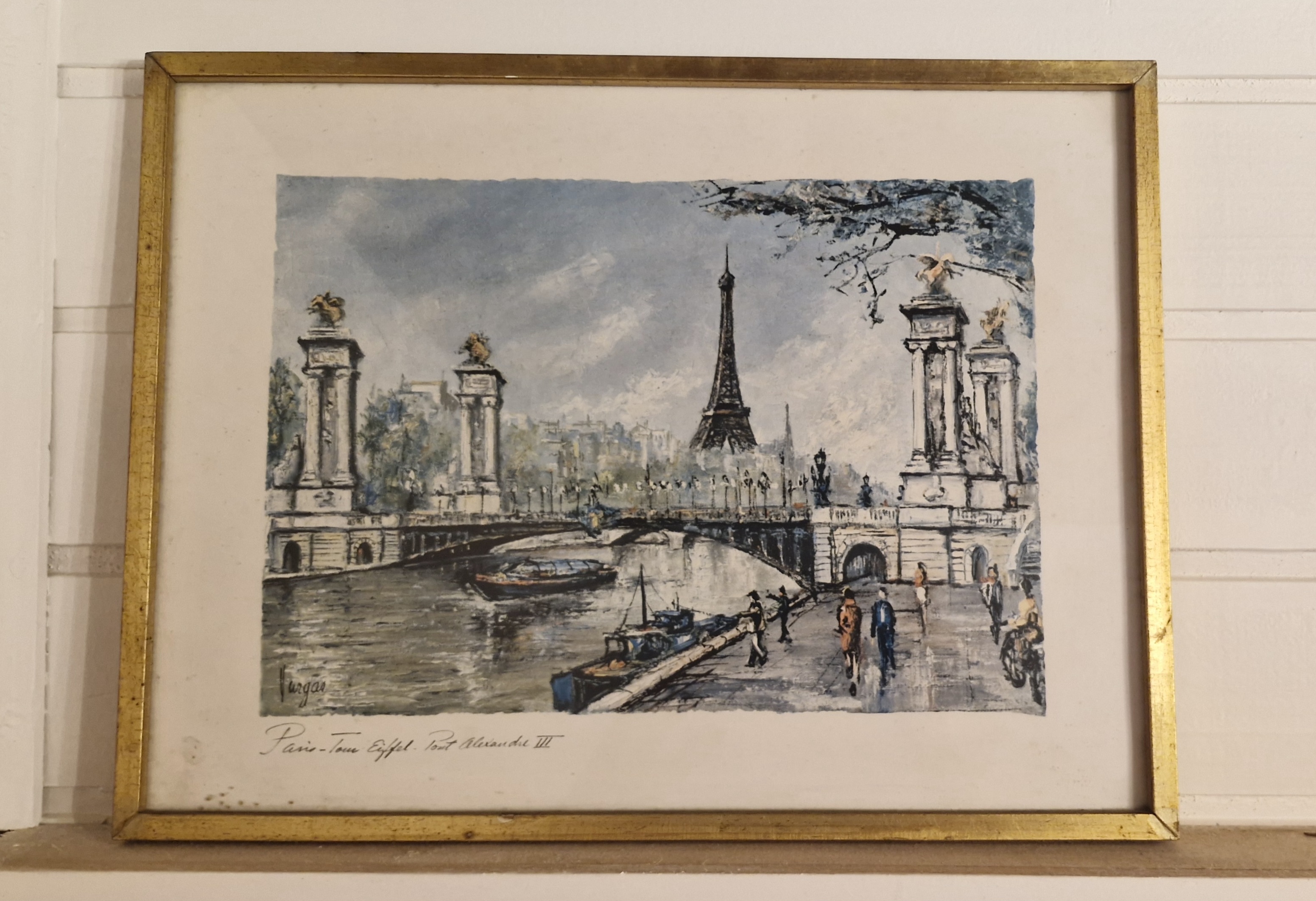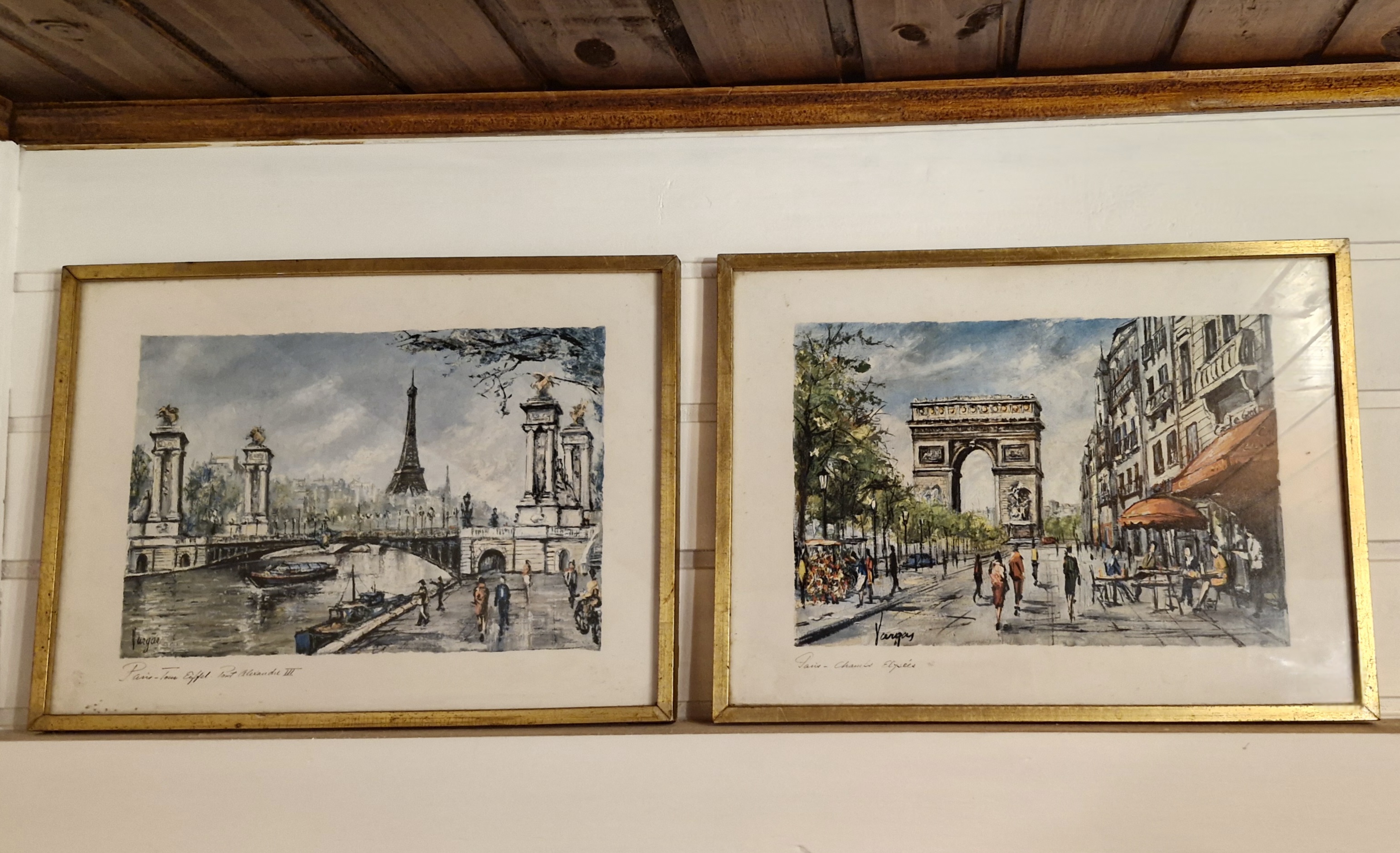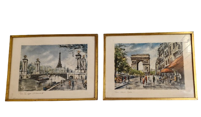 Lindo par de quadros emoldurados com vidro, com gravuras de meados do século XX retratando os principais pontos turísticos de Paris, o Arco do Triunfo, a Ponte Alexandre III e a Torre Eiffel. Artista Pedro Vargas.