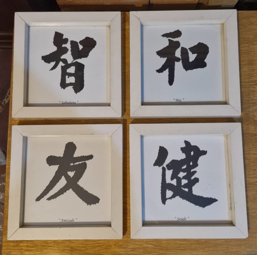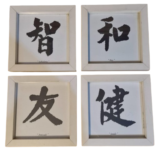 Conjunto de 4 belos quadros com ideogramas orientais representando "Paz", "Saúde", "Amizade" e "Sabedoria".