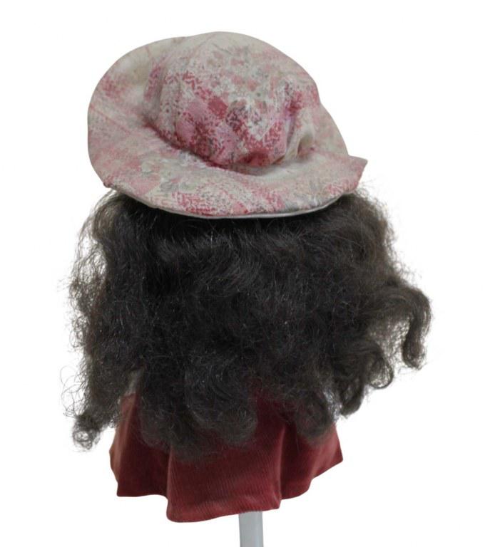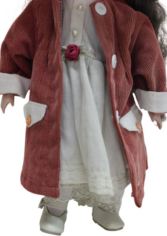 Antiga boneca em biscuit com olhos de vidro, apresenta vestimenta de época e acompanha suporte original. Em bom estado, roupas com desgastes do tempo.