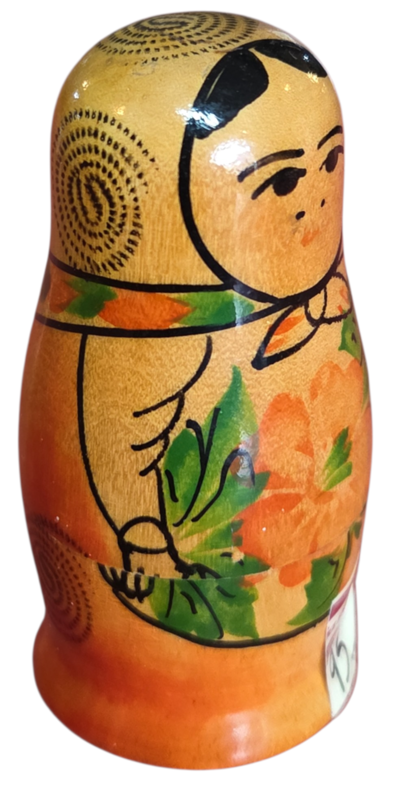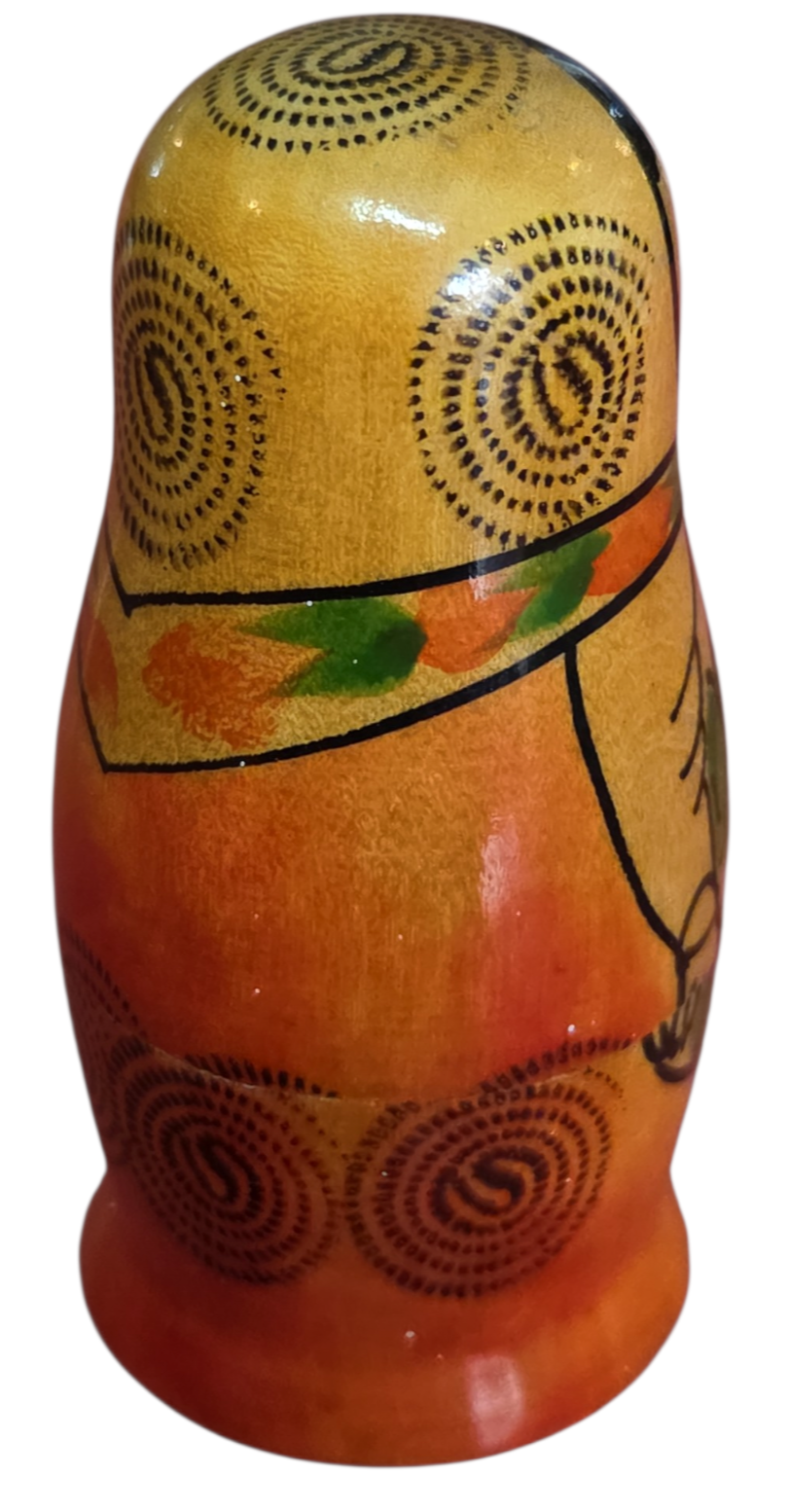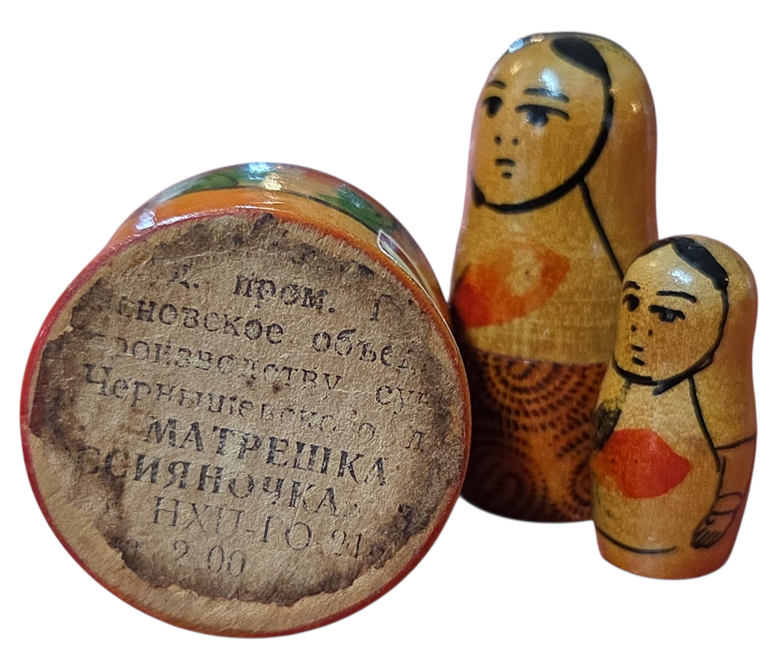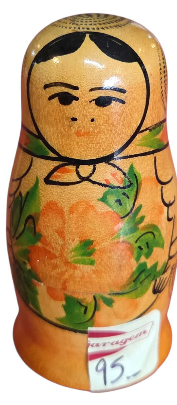 Este conjunto de Matrioskas (bonecas russas) é uma peça autêntica fabricada na antiga União Soviética (USSR/URSS). O selo na base identifica o modelo como "Rossiyanochka" (Russa), um estilo tradicional conhecido por suas pinturas vibrantes e expressivas.