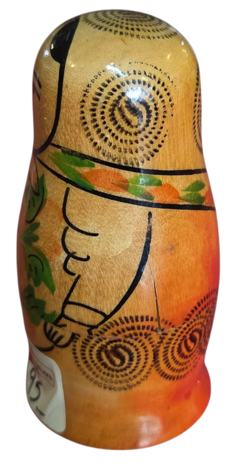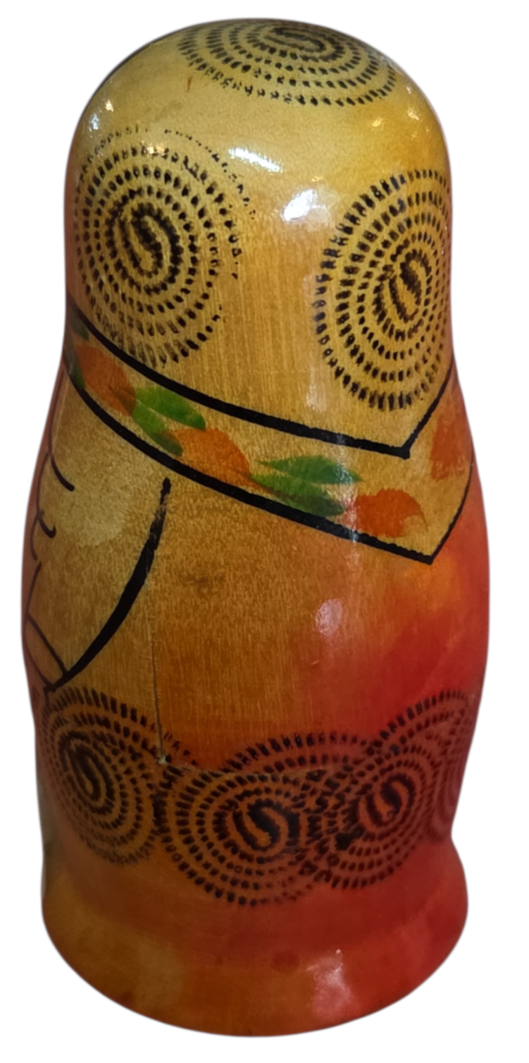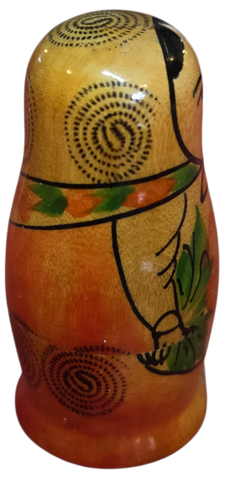 Este conjunto de Matrioskas (bonecas russas) é uma peça autêntica fabricada na antiga União Soviética (USSR/URSS). O selo na base identifica o modelo como "Rossiyanochka" (Russa), um estilo tradicional conhecido por suas pinturas vibrantes e expressivas.