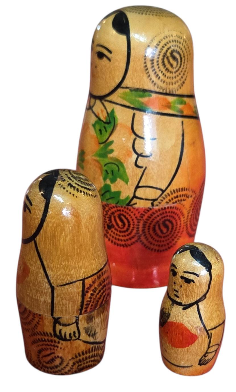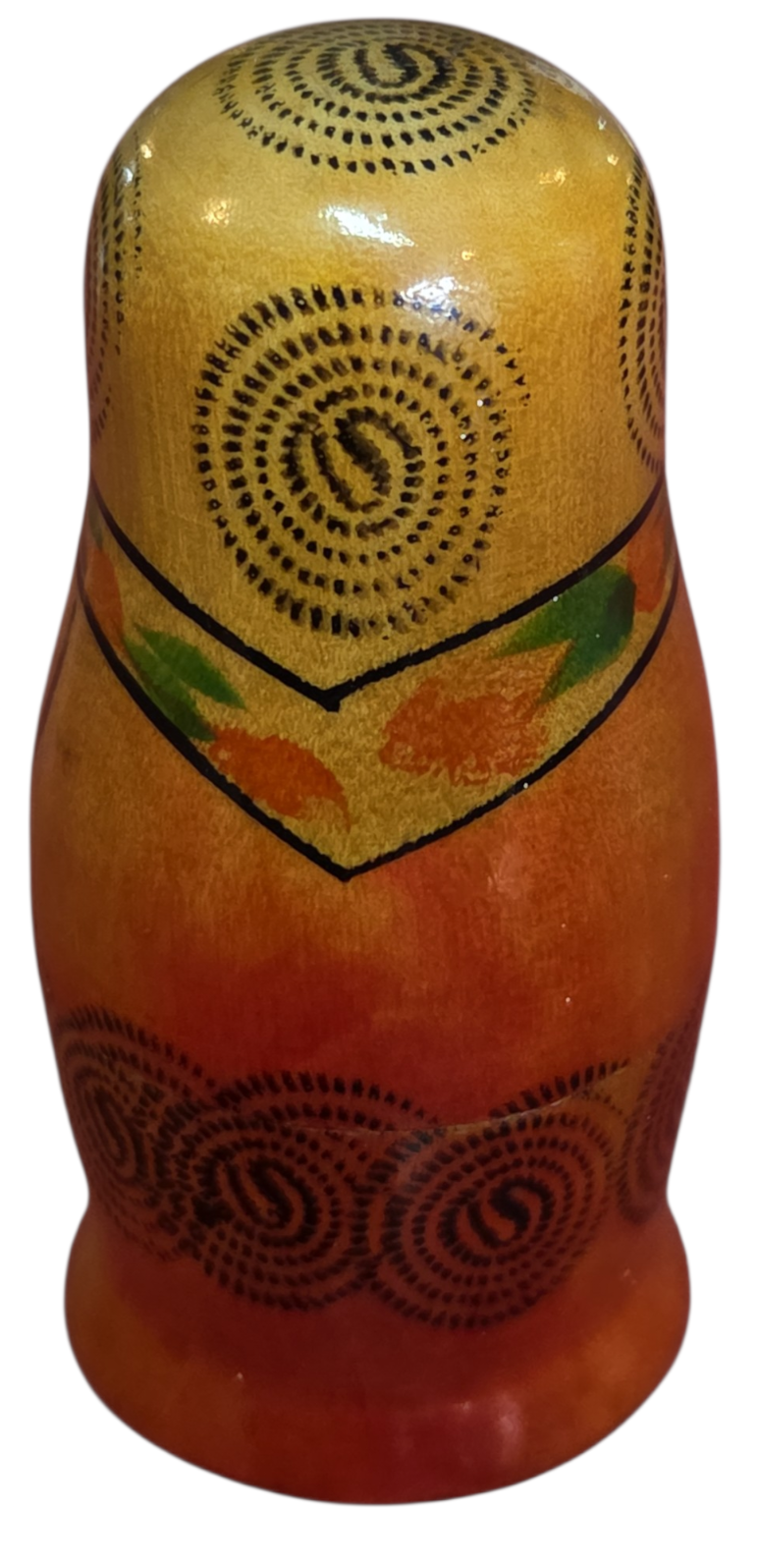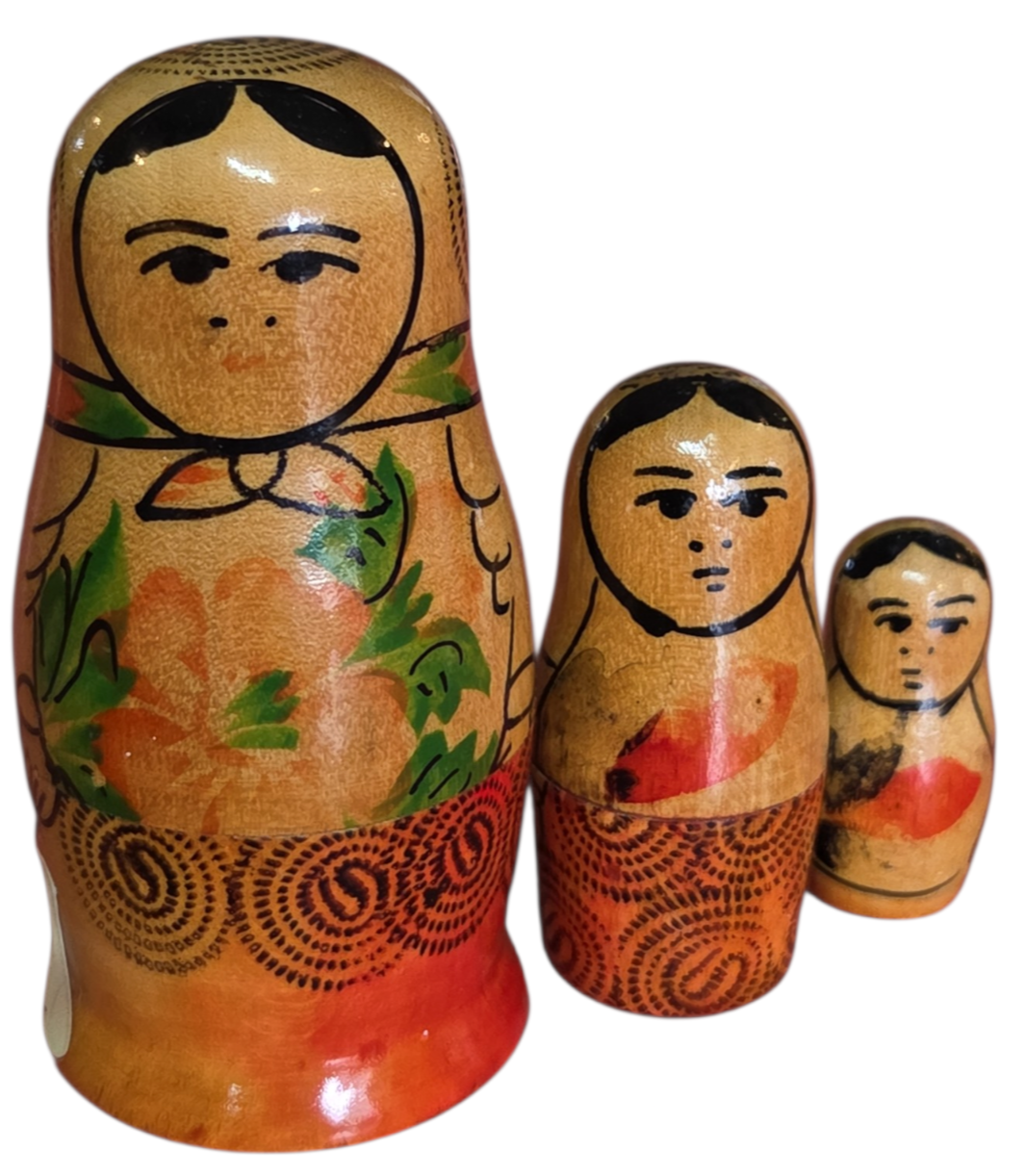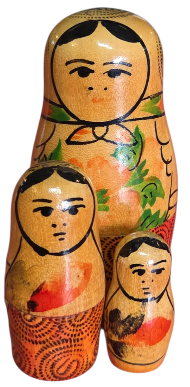 Este conjunto de Matrioskas (bonecas russas) é uma peça autêntica fabricada na antiga União Soviética (USSR/URSS). O selo na base identifica o modelo como "Rossiyanochka" (Russa), um estilo tradicional conhecido por suas pinturas vibrantes e expressivas.