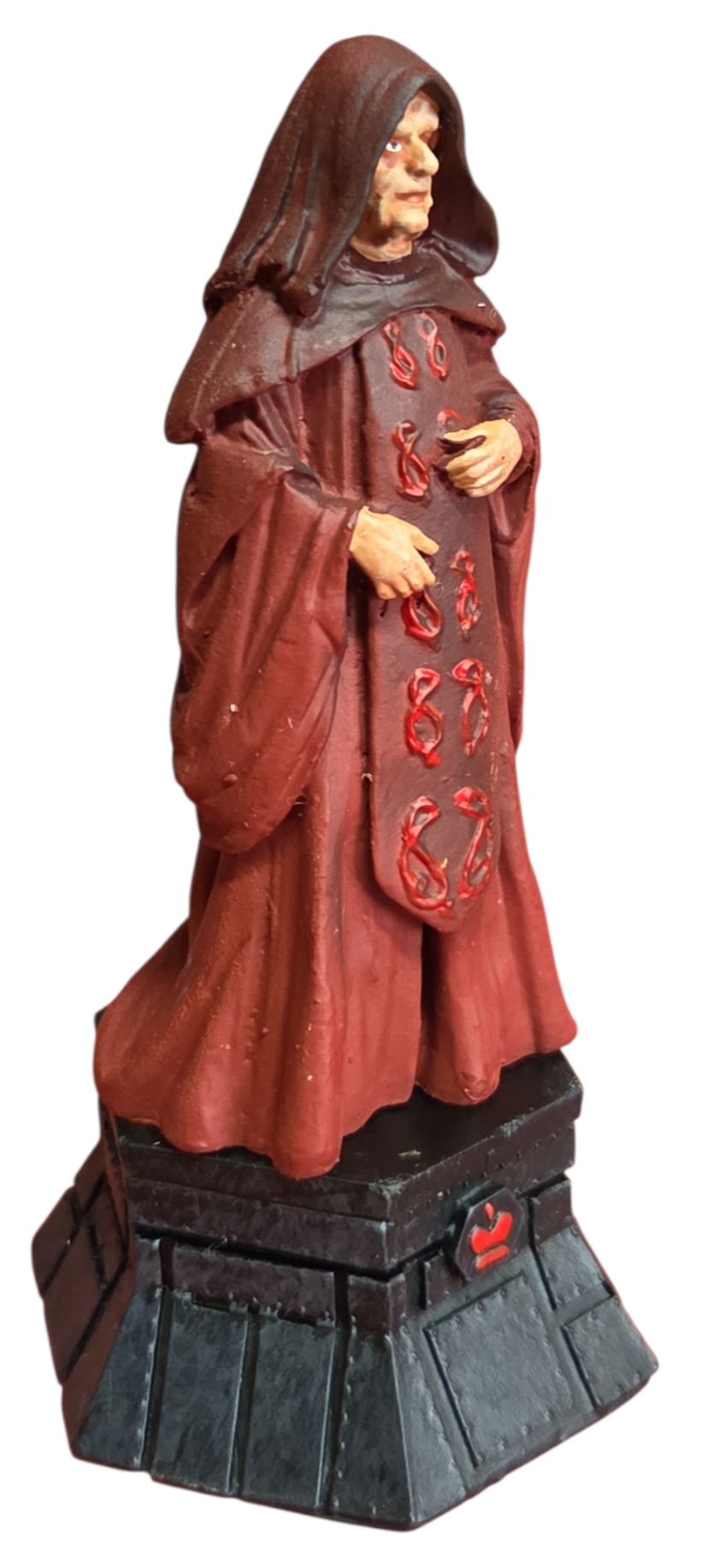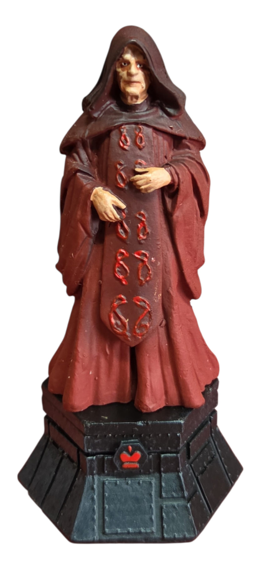 Esta peça de luxo faz parte da coleção oficial de xadrez Star Wars, representando o Rei Negro (Black King). A figura retrata o Imperador Palpatine com suas vestes cerimoniais vermelhas detalhadas, capturando a imponência e a vilania do mentor do Império Galáctico.