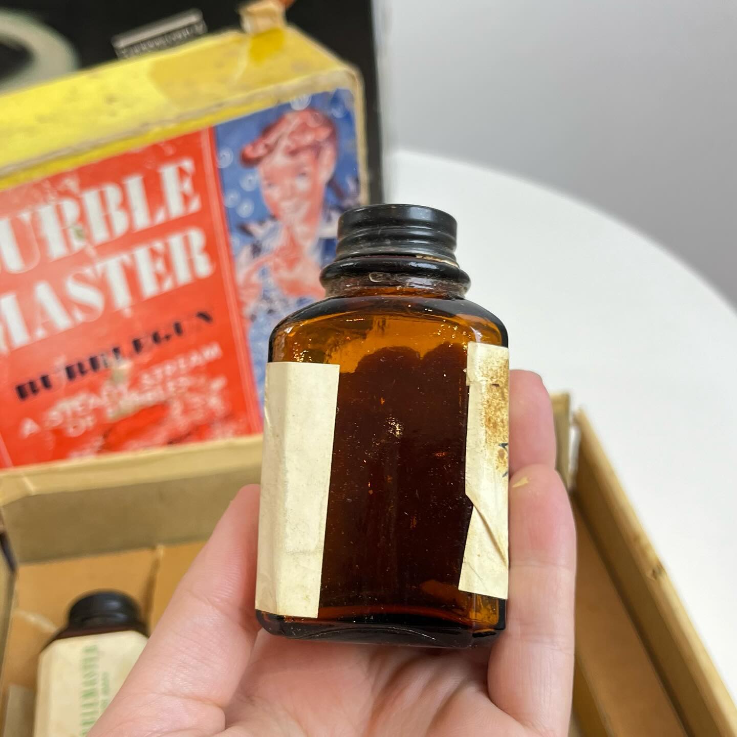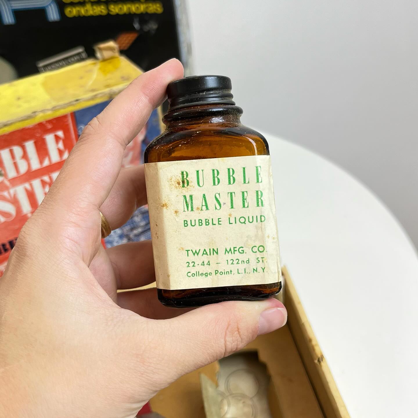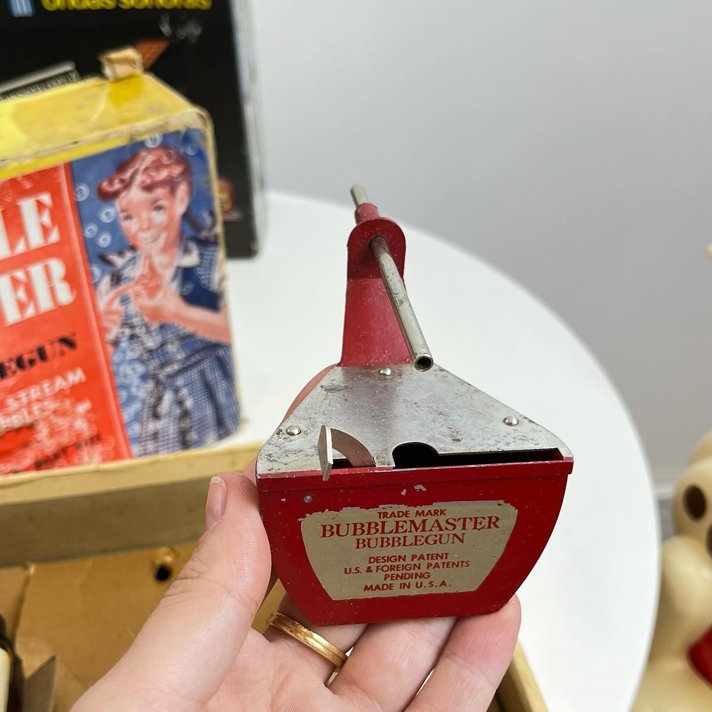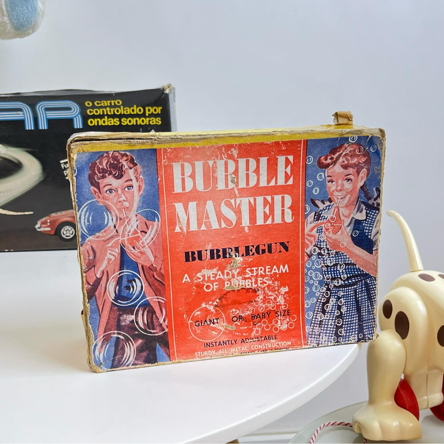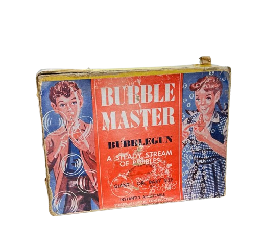 Raro brinquedo feito nos USA nos anos 50, de fazer bolhas de sabão. Acompanha todas peças originais, incluindo o manual de instruções. Apresenta marcas do tempo e uso.