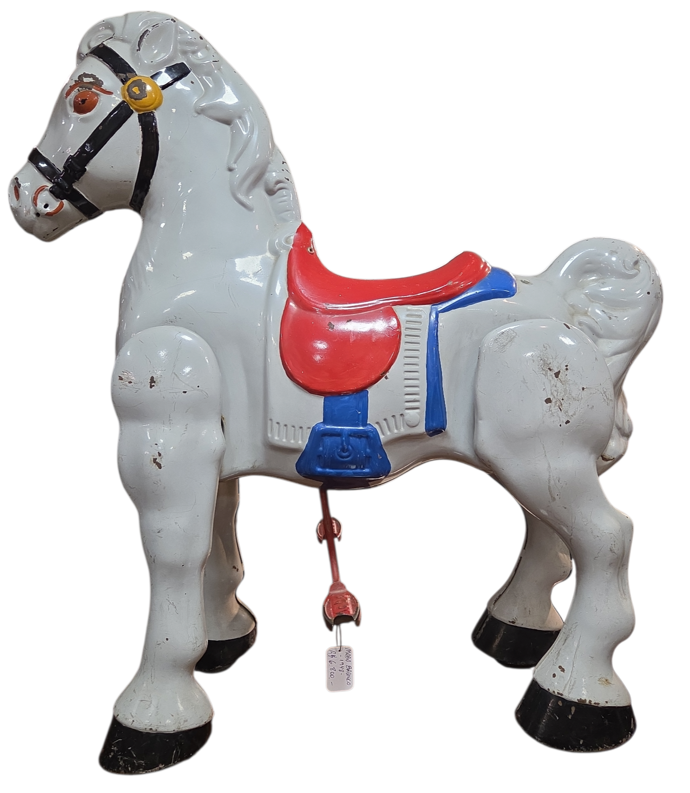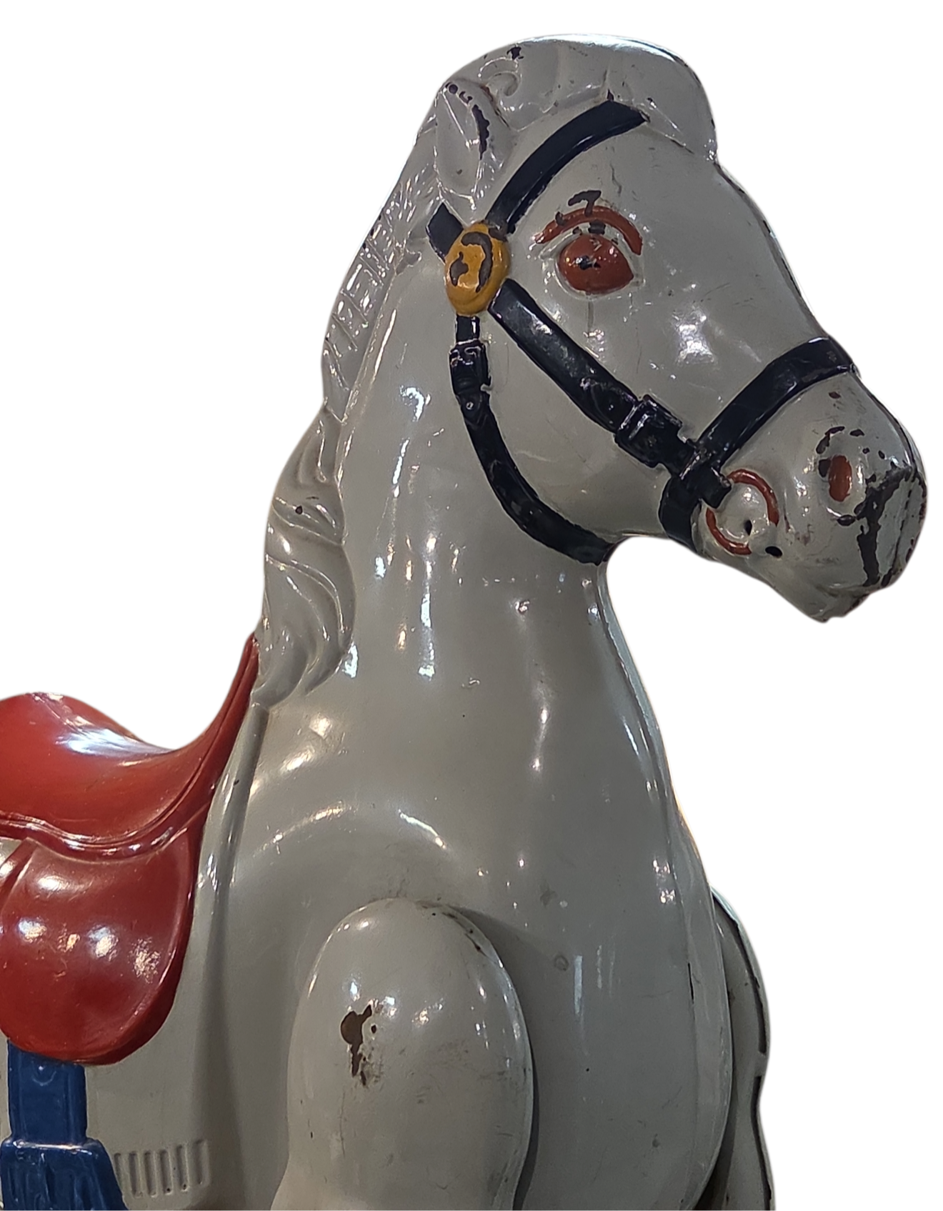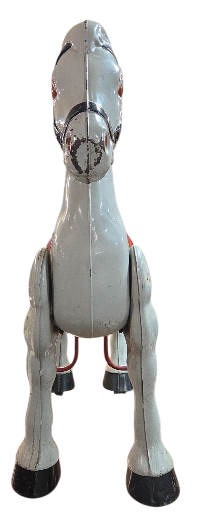 Apresentamos este magnífico cavalinho de balanço de metal da renomada marca inglesa Mobo, um verdadeiro ícone da infância de meados do século passado. Este exemplar, fabricado na década de 1940, é uma peça de colecionador excepcional e um item de decoração vintage cheio de caráter.