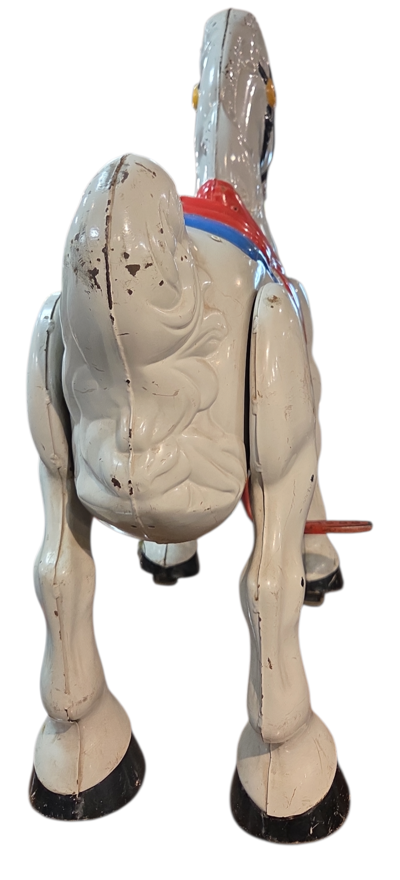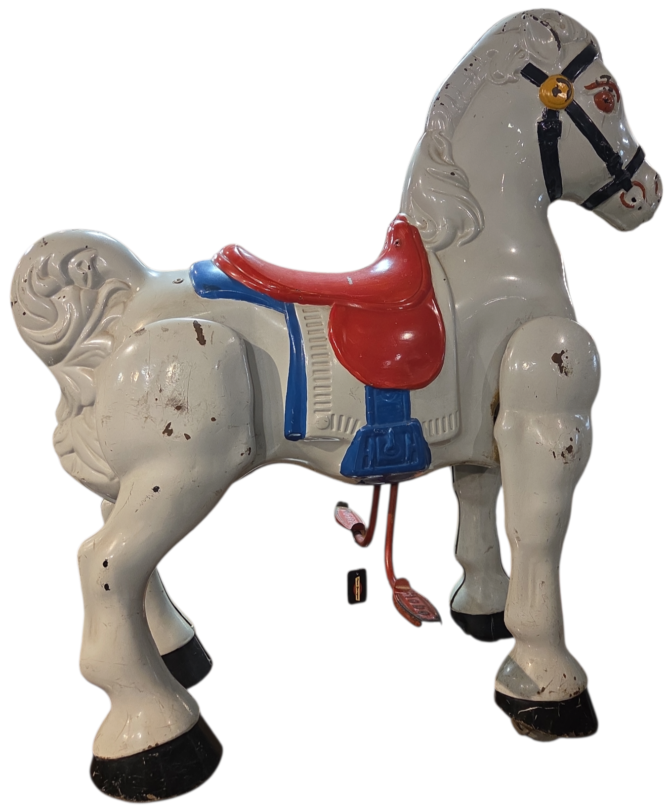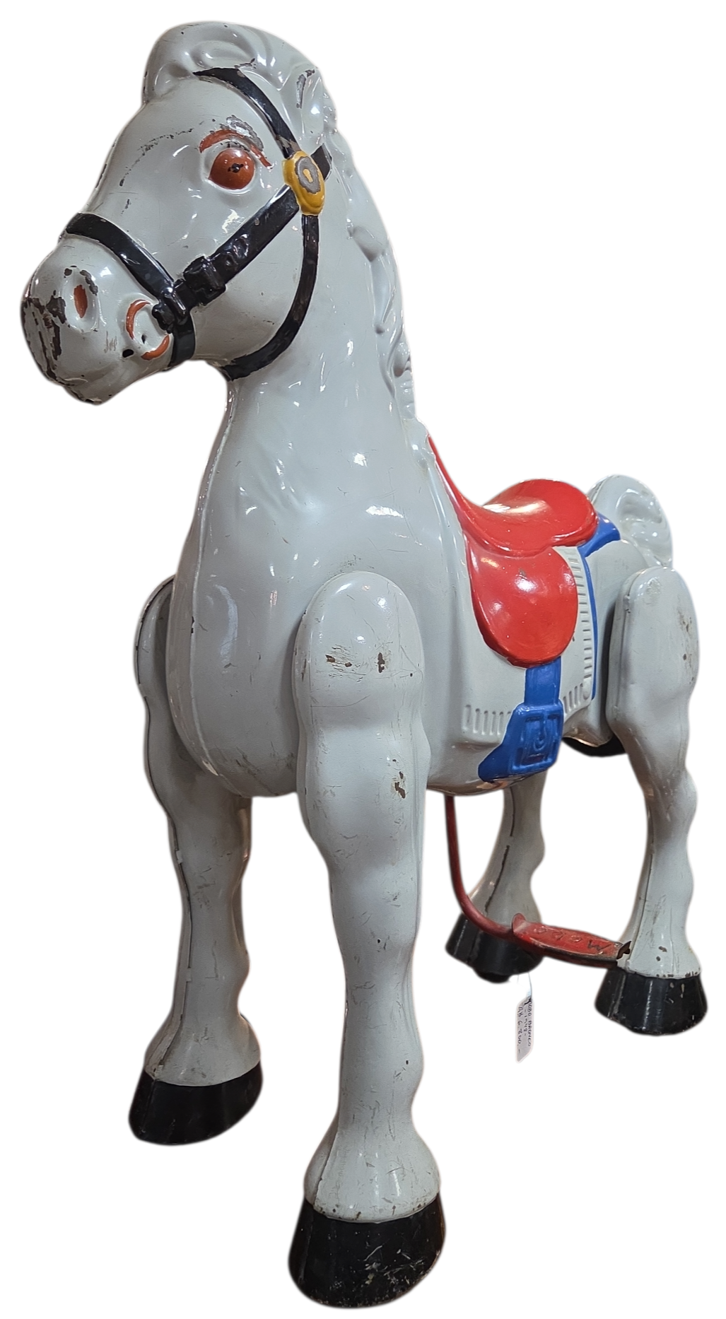 Apresentamos este magnífico cavalinho de balanço de metal da renomada marca inglesa Mobo, um verdadeiro ícone da infância de meados do século passado. Este exemplar, fabricado na década de 1940, é uma peça de colecionador excepcional e um item de decoração vintage cheio de caráter.