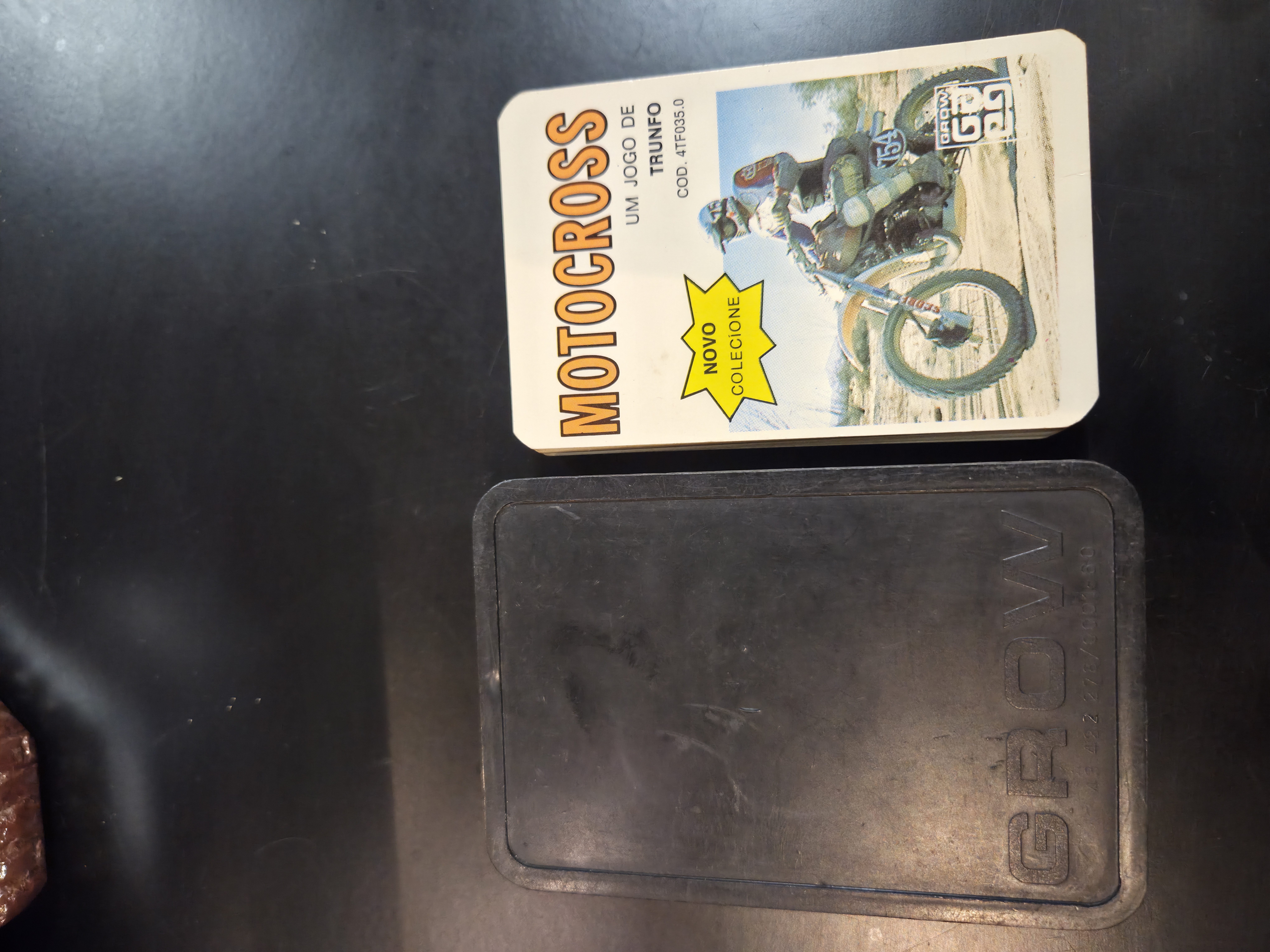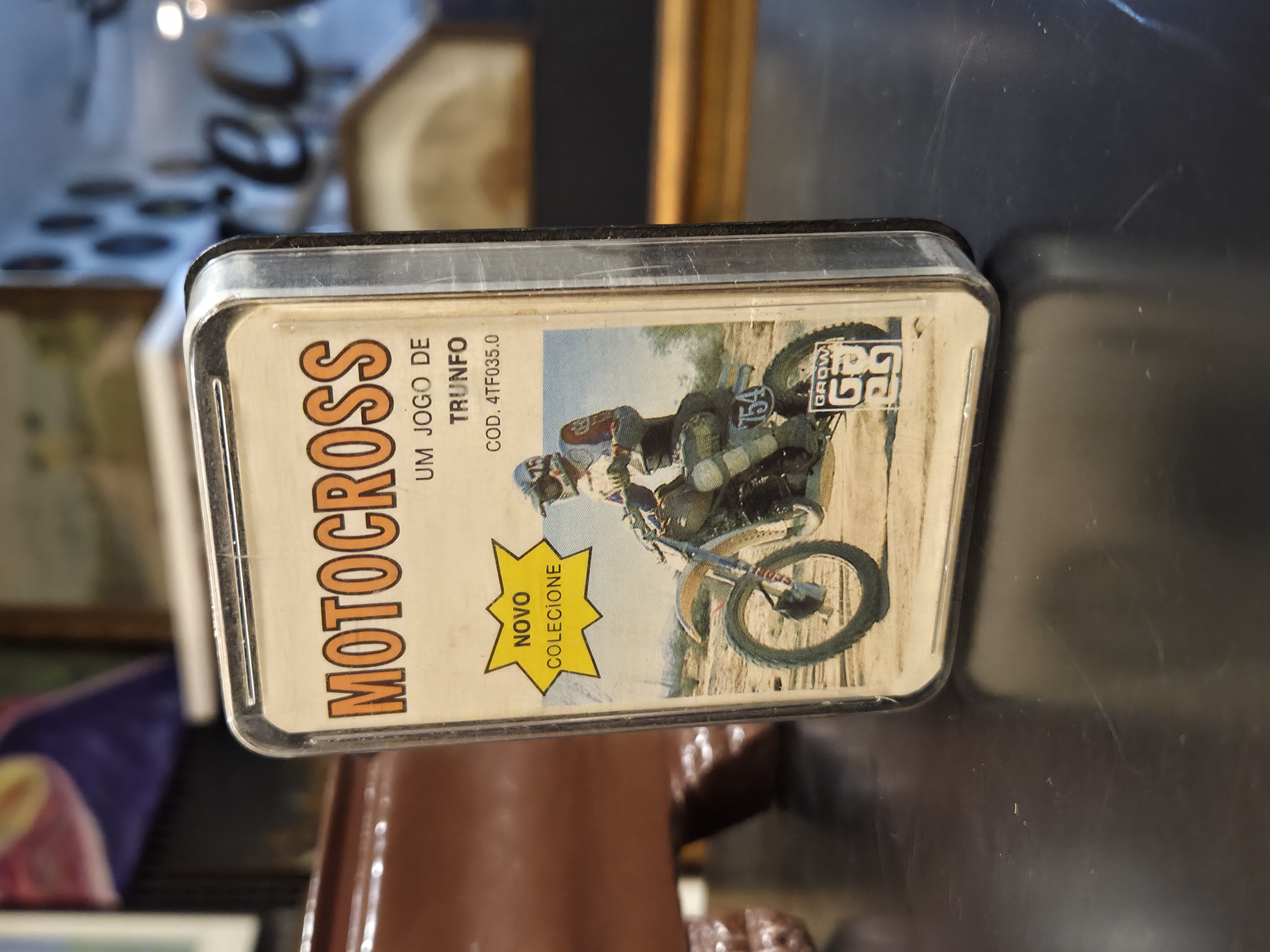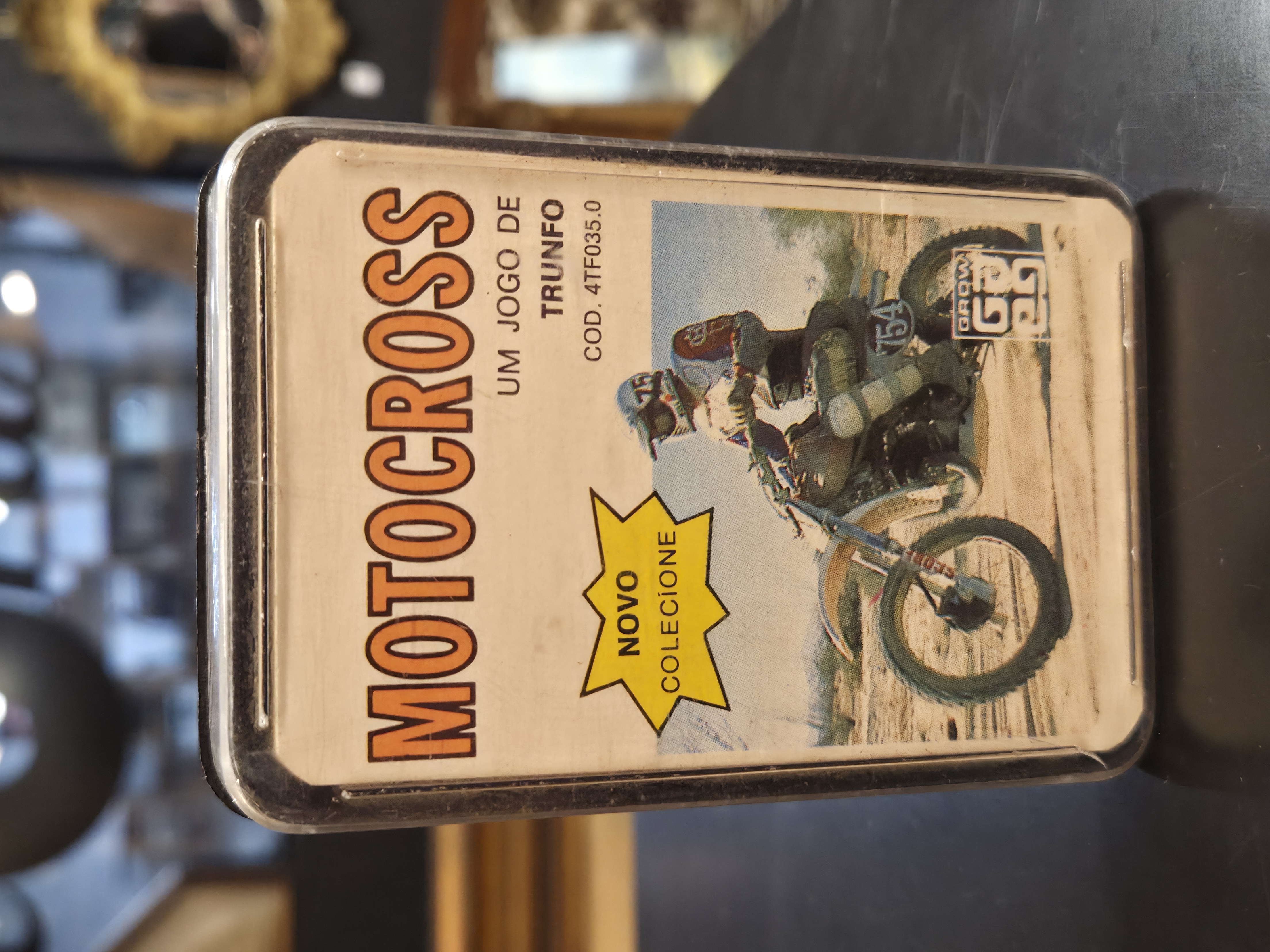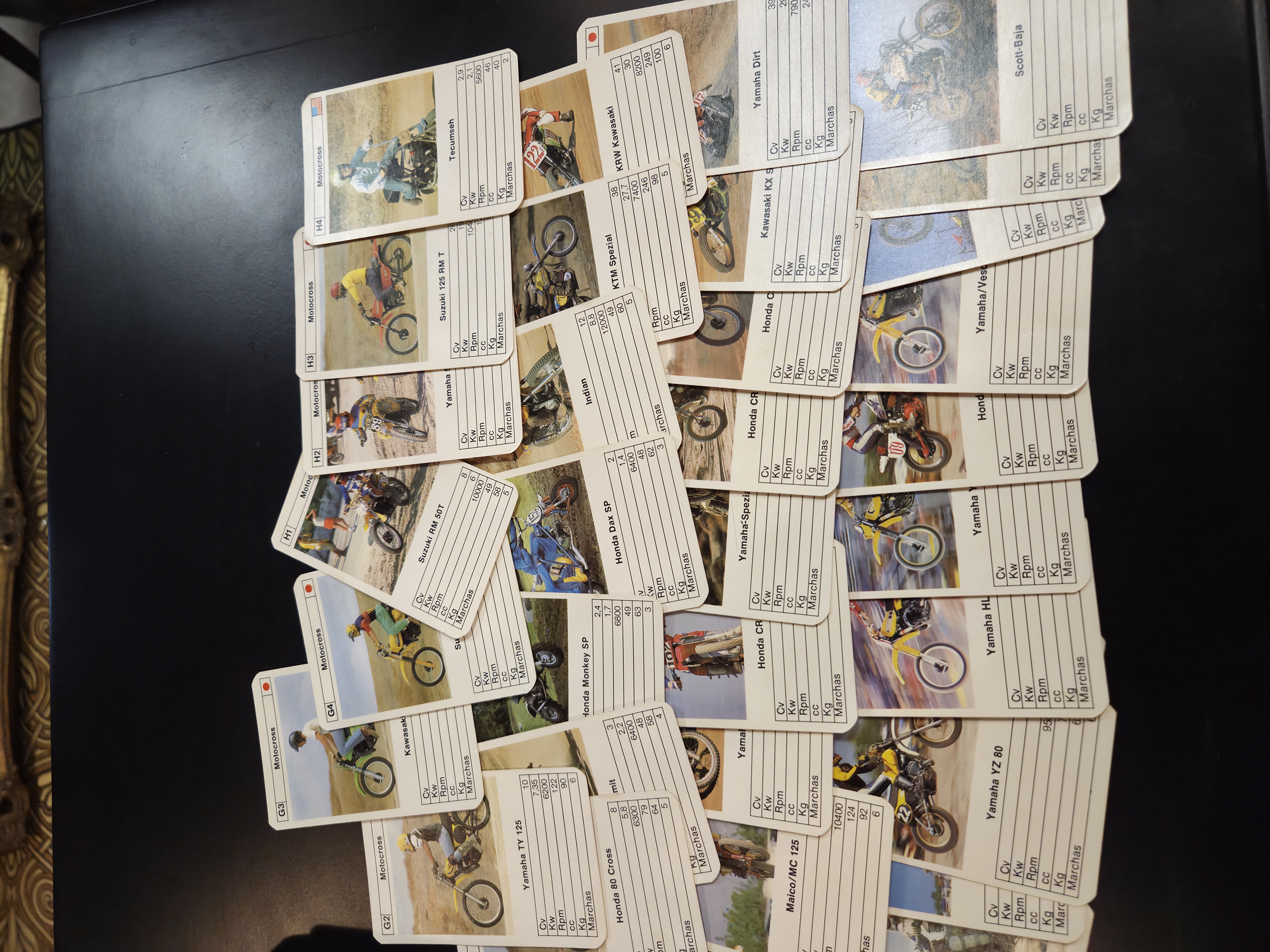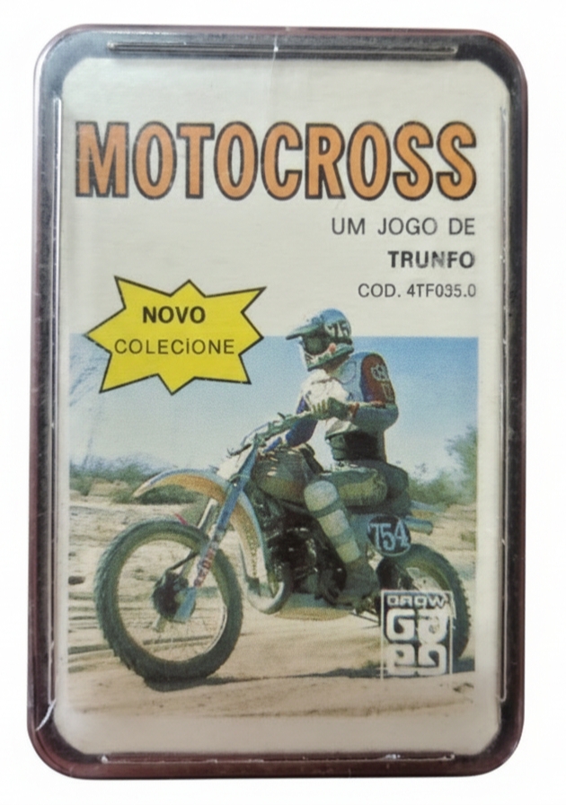 Clássico jogo de trunfo Motocross, composto por cartas colecionáveis com ilustrações e informações técnicas de motos off-road, ideal para fãs de motocross e colecionadores de jogos antigos.
