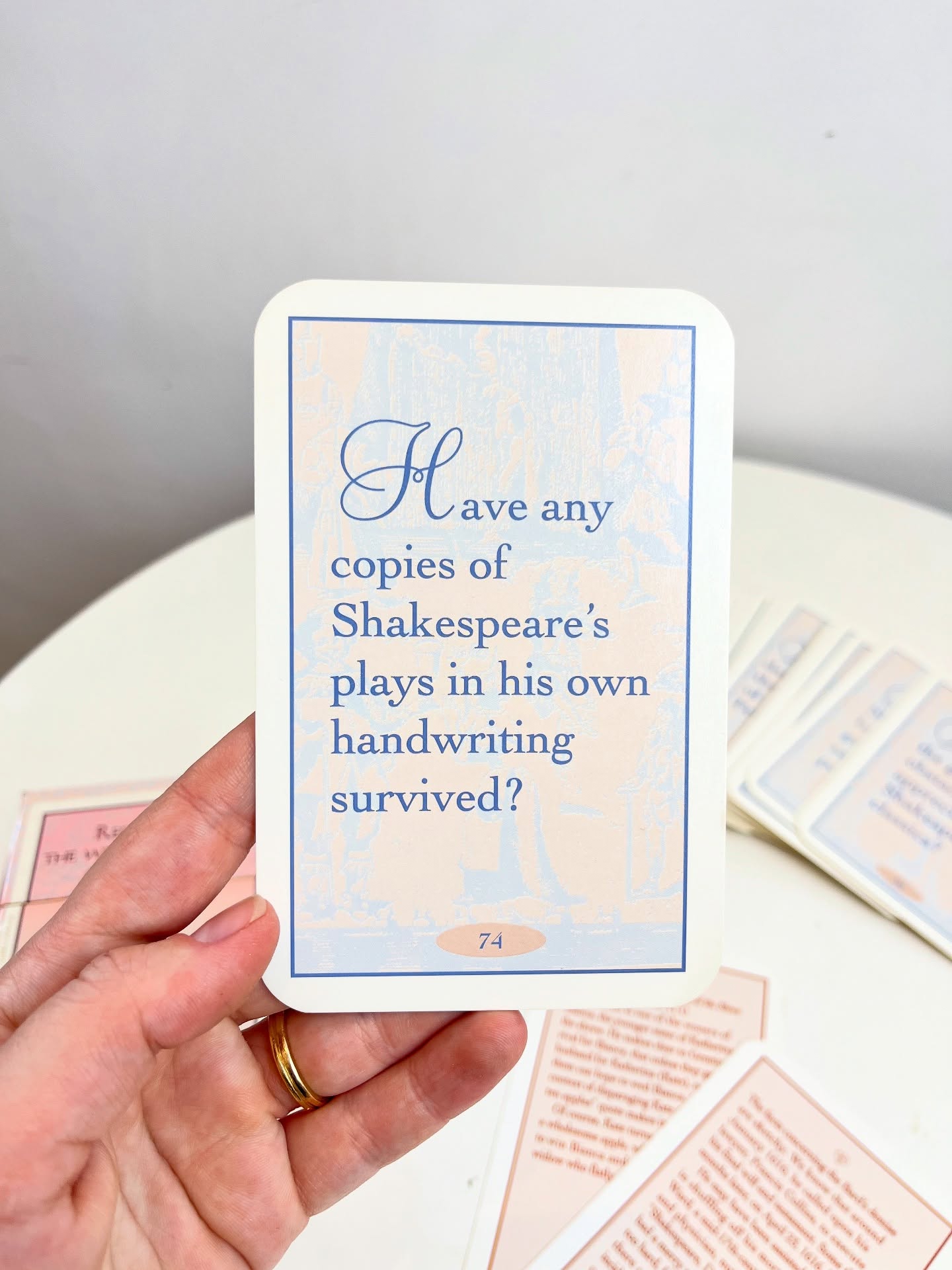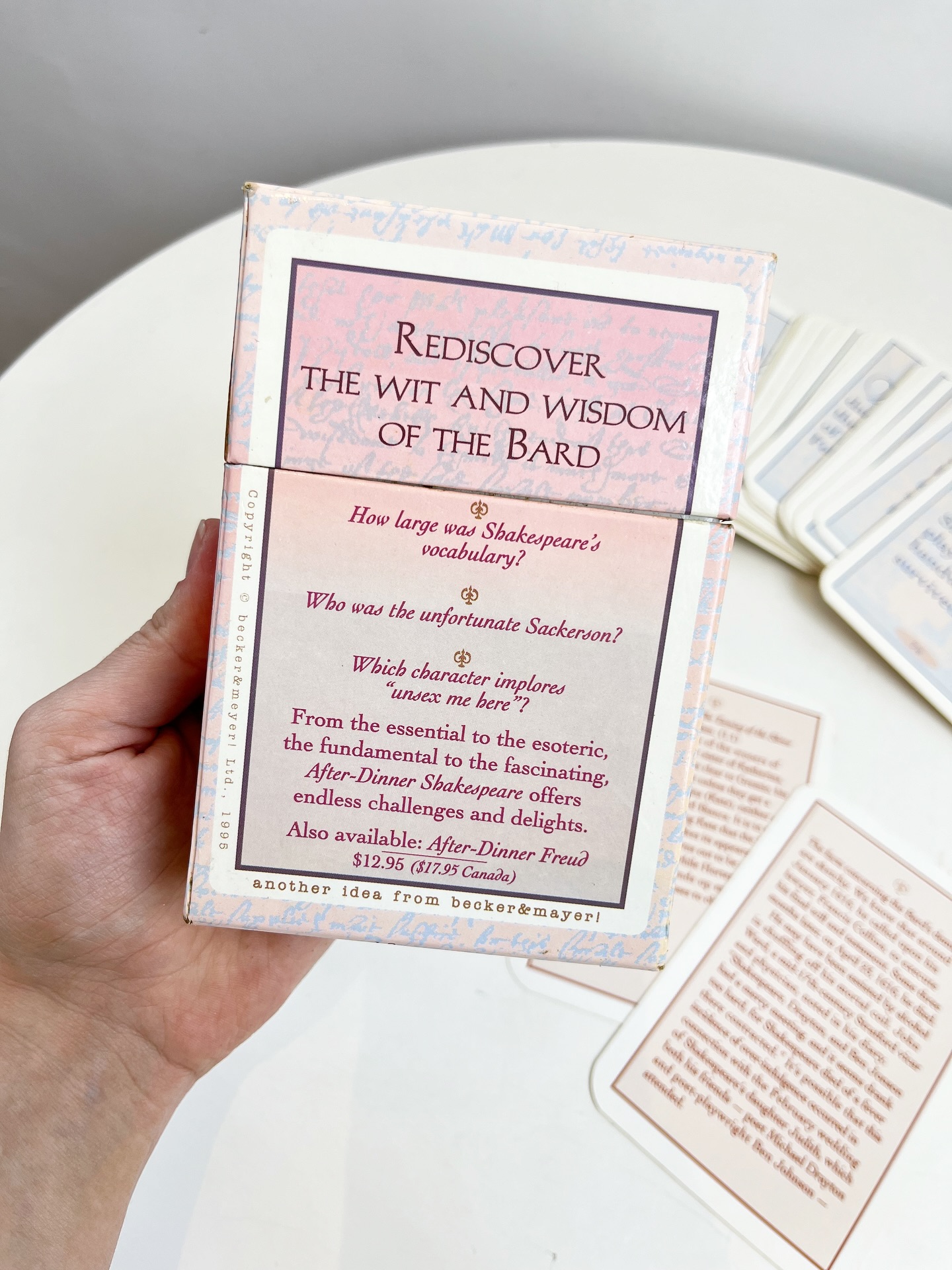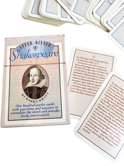Cards em inglês com 100 perguntas e respostas sobre Willian Shakespeare e suas obras, para estimular a mente e provocar vivas discussões e conversas sobre o tema. De 1995. Leves marcas do tempo.