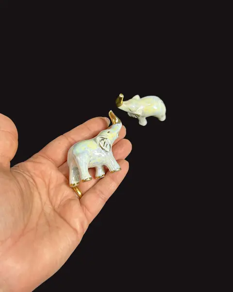 Mimoso par de elefantes miniatura em porcelana branca, esmaltação furta cor e detalhes em ouro.