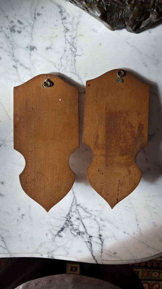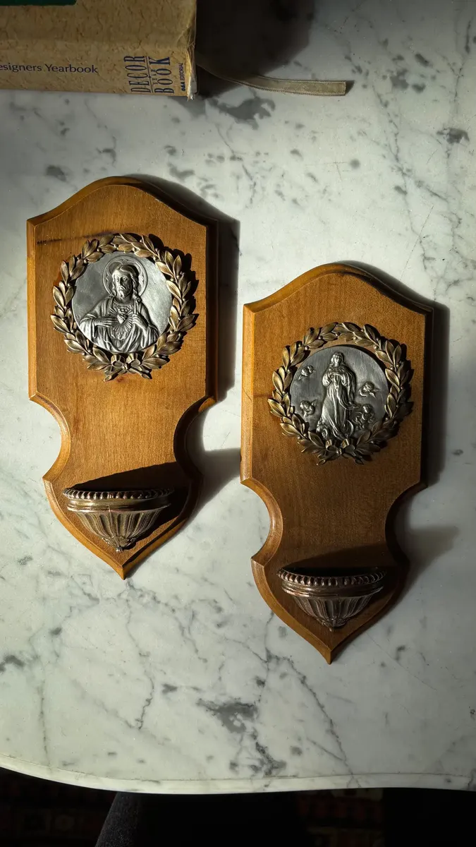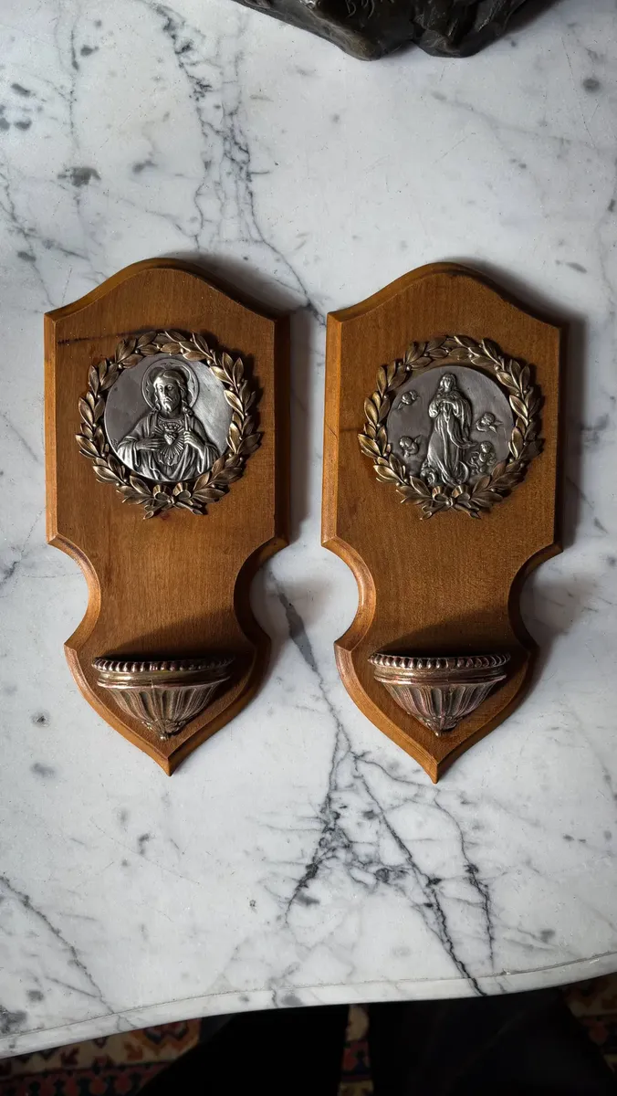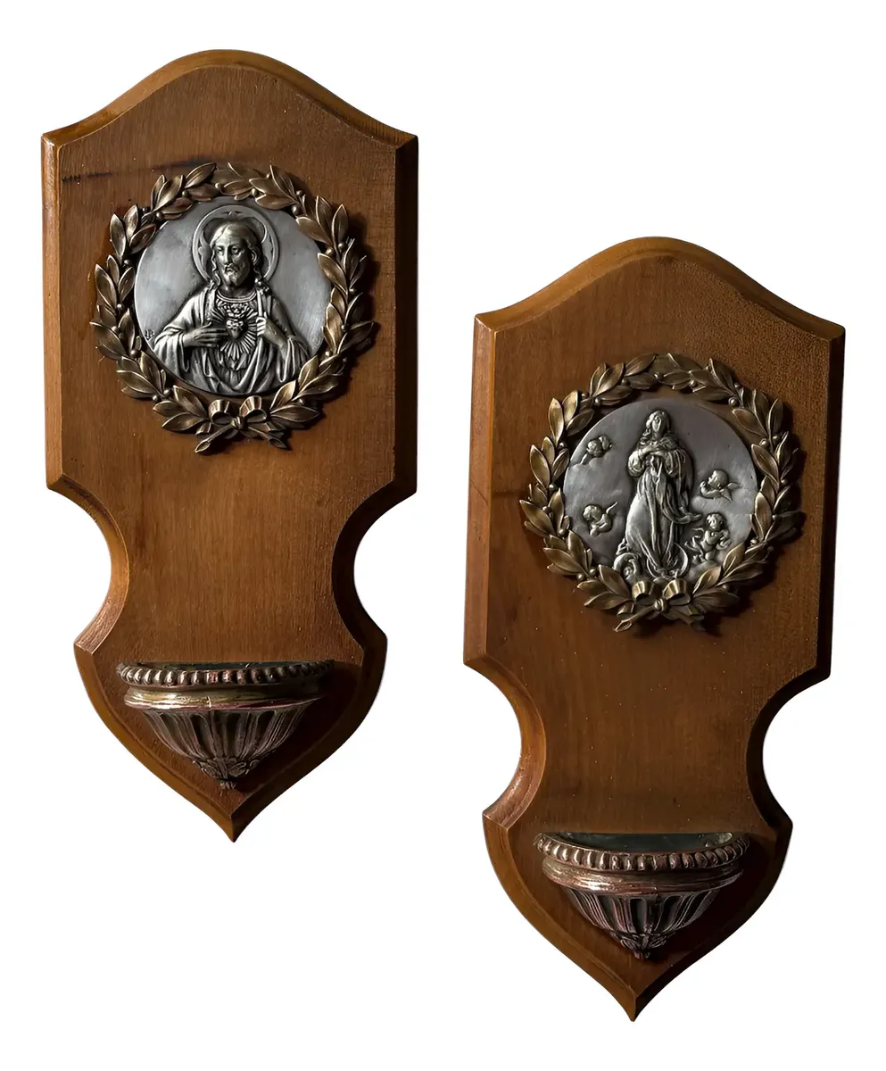 ~ Arte Sacra ~ Antigo e raro par de pias de água benta em madeira de lei, com medalhões em prata com detalhes em bronze. Peças francesas, assinadas no canto inferior direito. Meados do século XX.