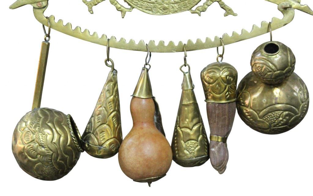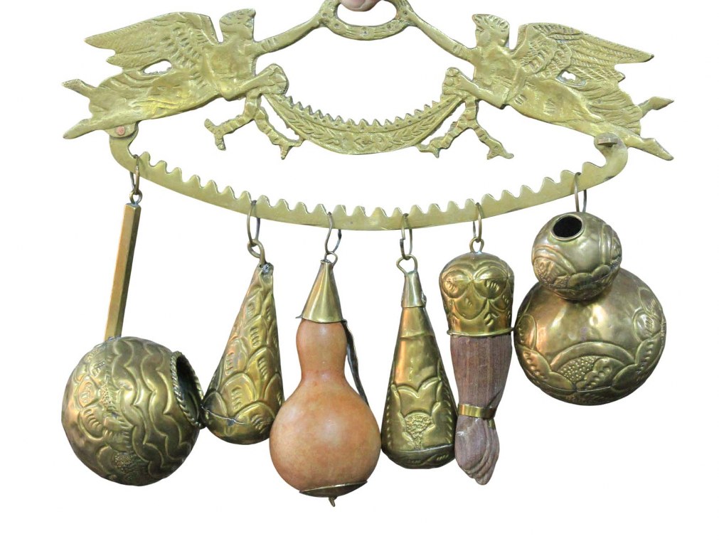 Antigo balangandã em metal dourado, com cenas de anjo trabalhado em relevos e acompanham 06 penduricalhos incluindo uma figa em jacarandá da Bahia.