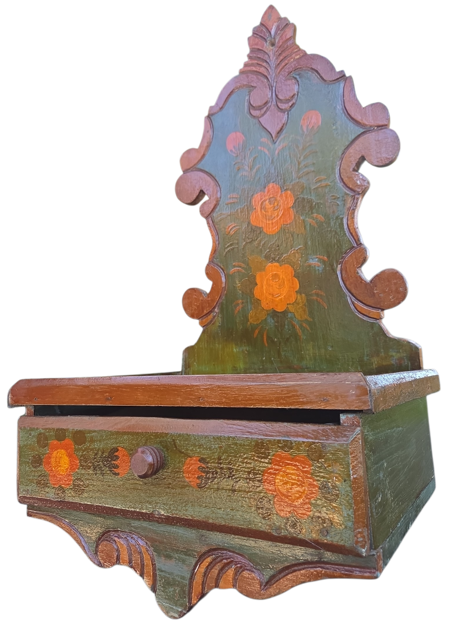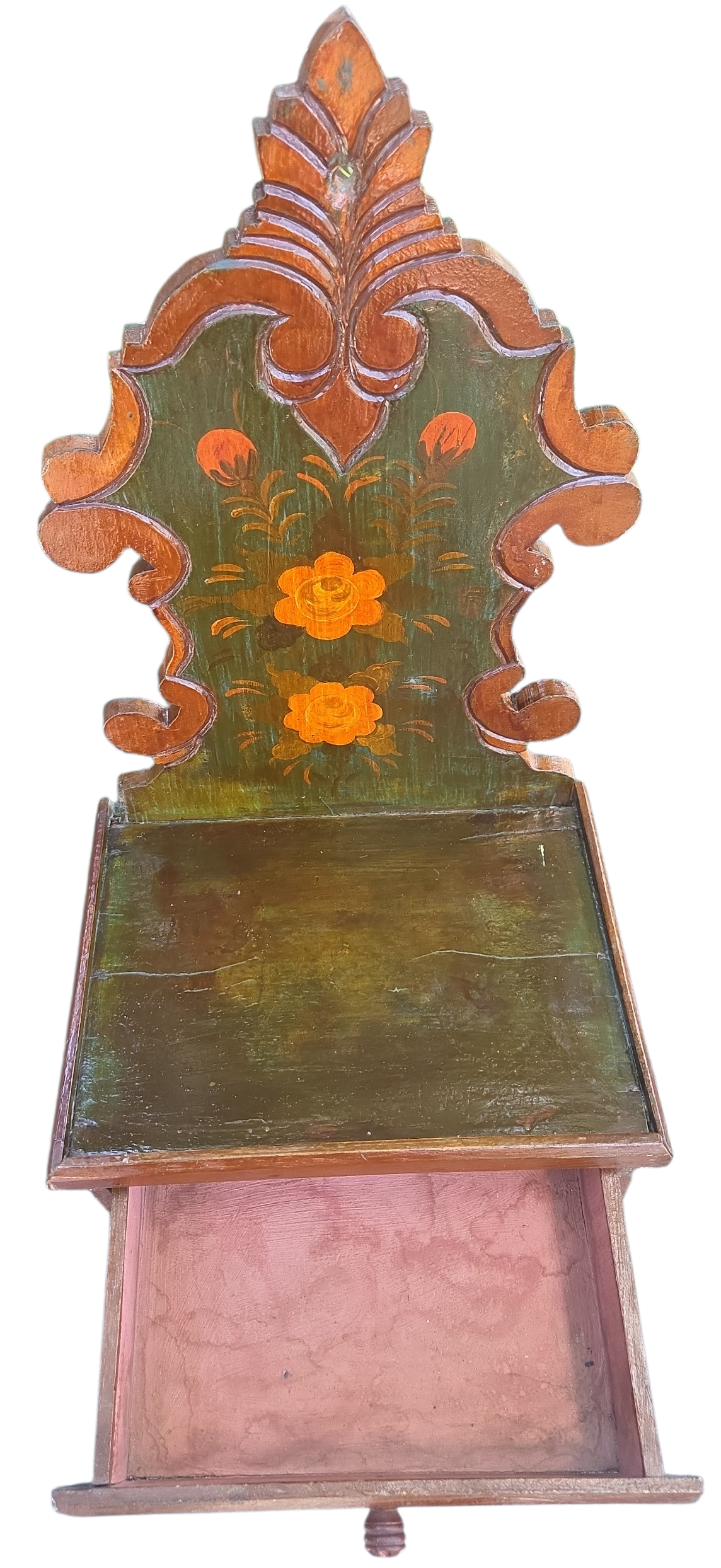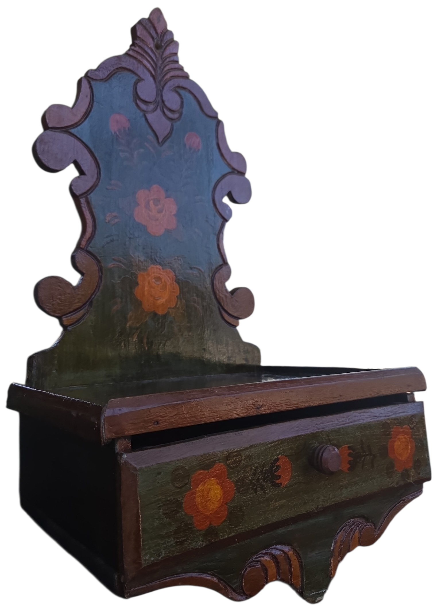 Este é um oratório de parede singular, que une a tradição da fé com a delicadeza da arte popular. Produzido em madeira maciça, ele apresenta um design clássico com recortes ornamentais, ideal para criar um espaço de devoção e serenidade em sua casa.