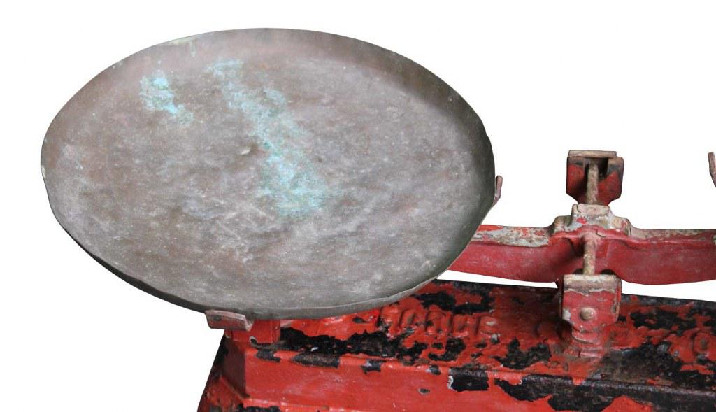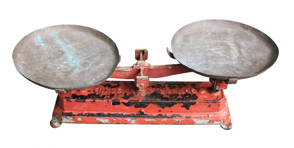 Antiga balança em ferro (com resquício de pintura na cor vermelho) de armazém, da manufatura FORÇA 40KG. Apresenta dois pratos de cobre. Medidas 20A X 55C X 15L e pratos 28D cada.