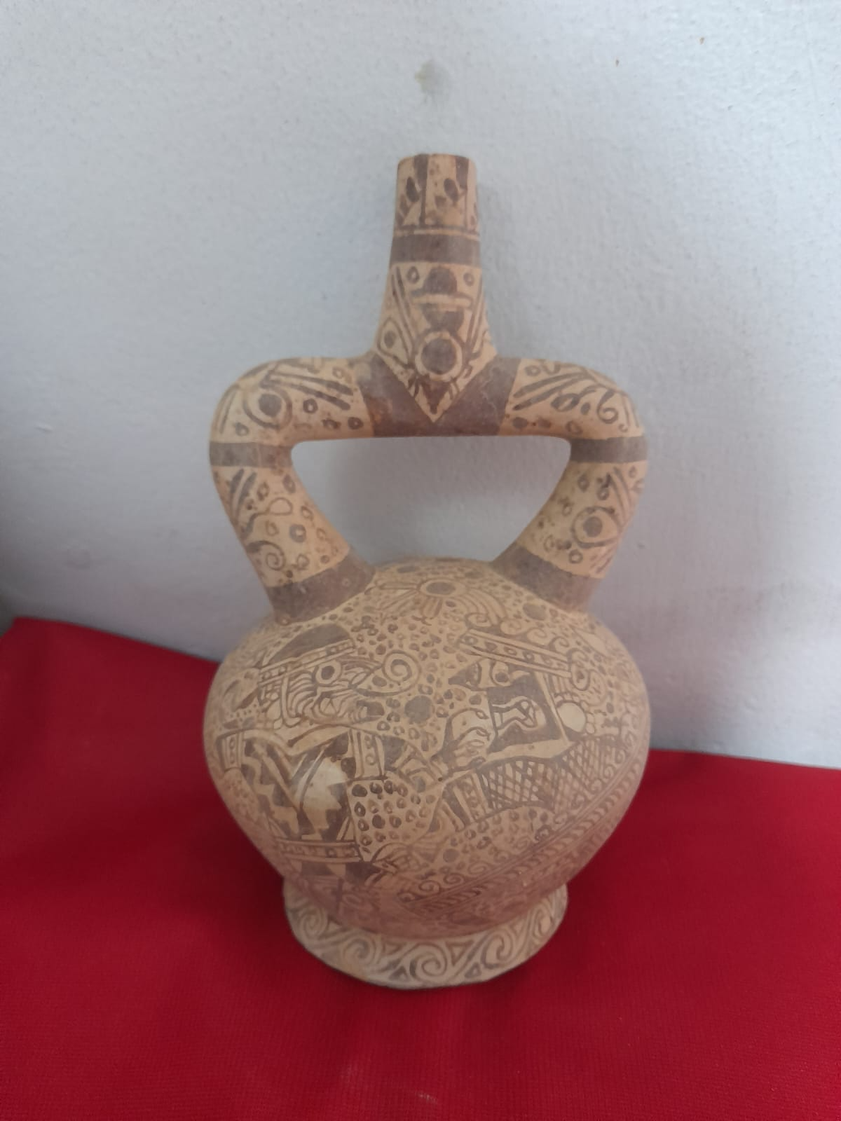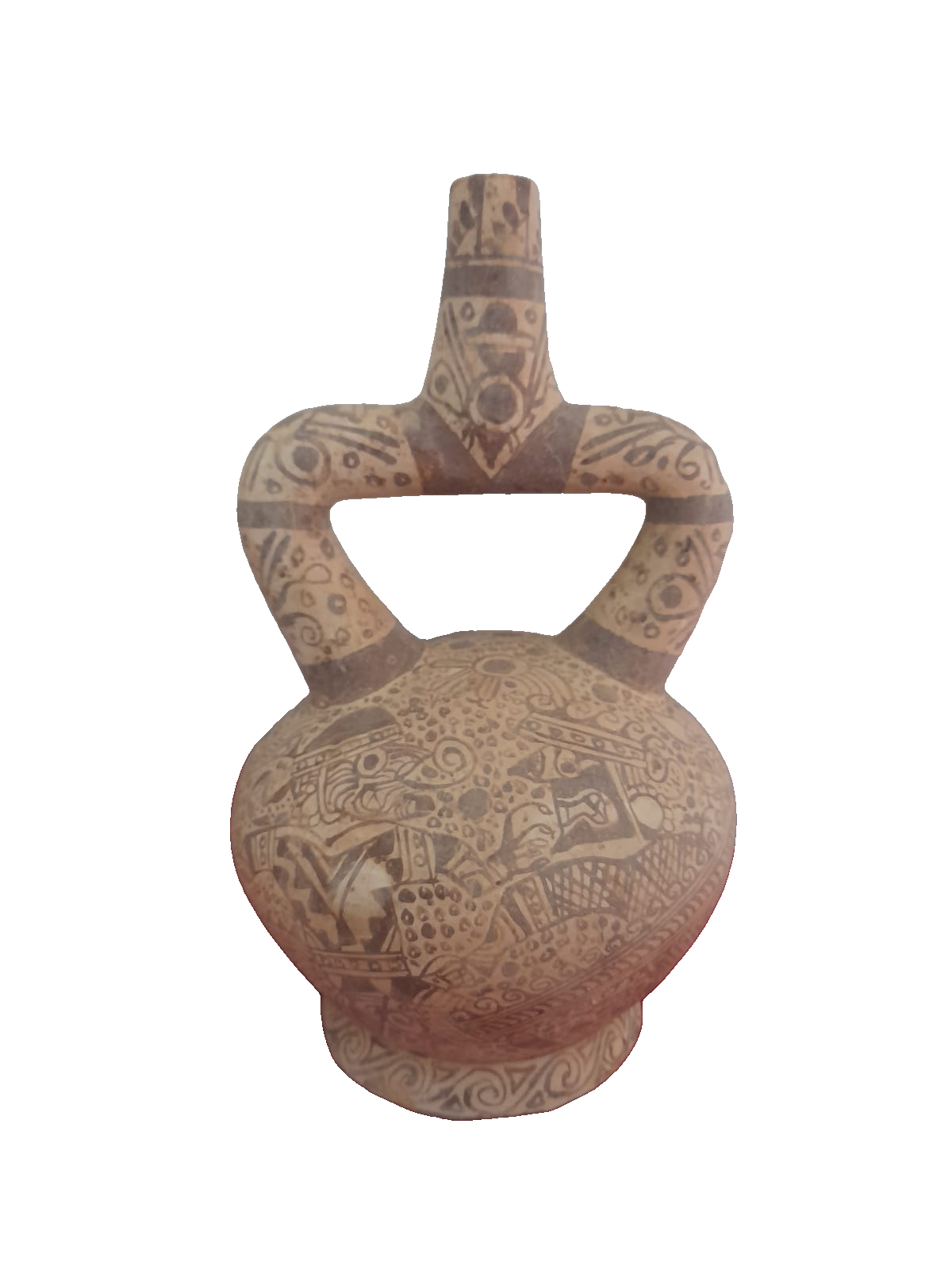 Jarro cerimonial, Cultura Mochica, costa norte do Peru, aproximadamente século II d.C. Essa cultura, caracterizada por guerreiros, agricultores e pescadores, desenvolveu uma grande técnica em ourivesaria e cerâmica. Este jarro cerimonial continha líquidos usados pelo sumo sacerdote em cerimônias. Apresenta um guerreiro na base e outras figuras antropomórficas.
