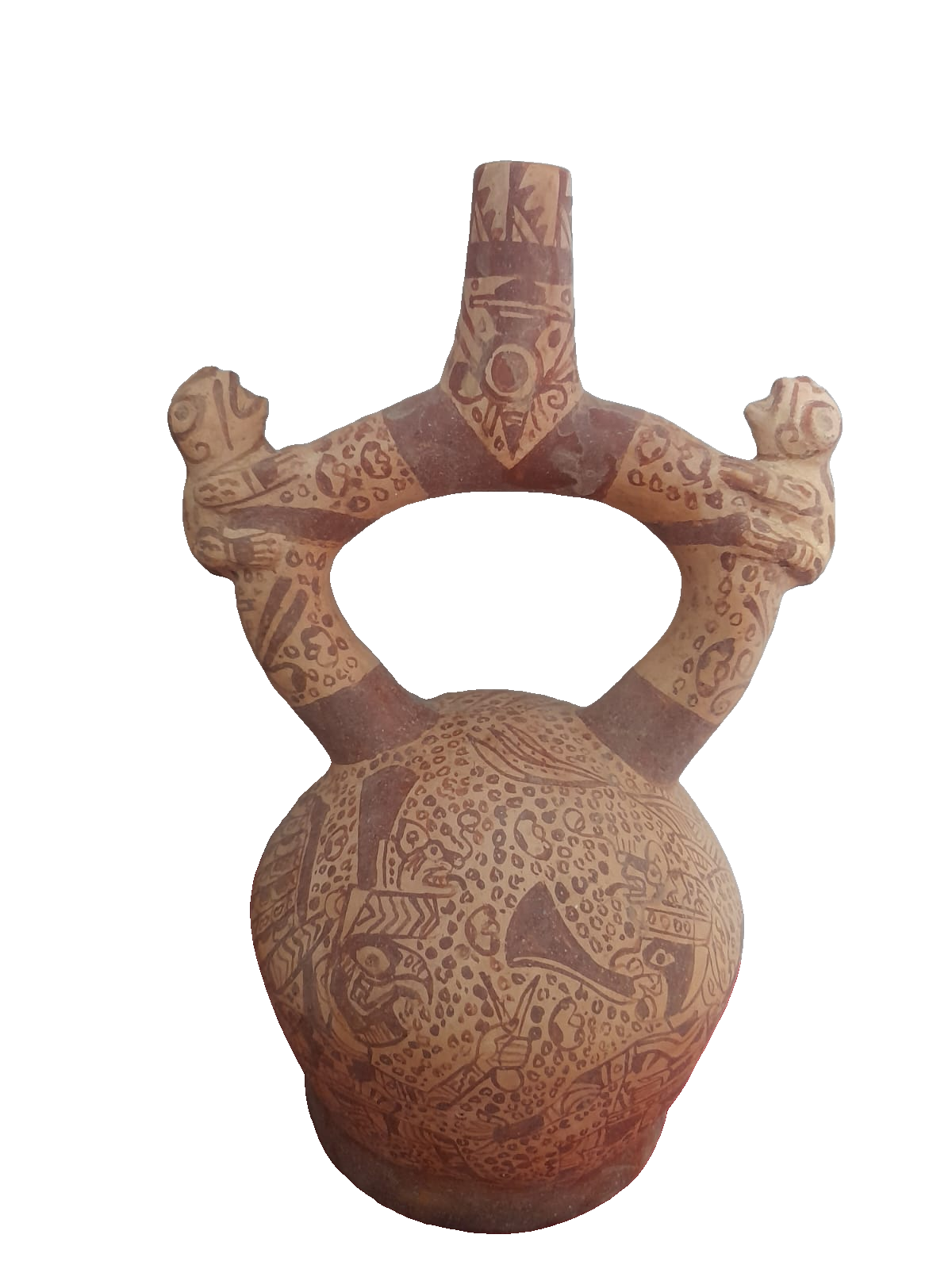 Apresenta detalhes nítidos dos animais nas alças, a representação do guerreiro Moche também está intacta, não apresenta quebras ou deterioração, a pintura permanece nítida e intacta ao longo dos séculos.