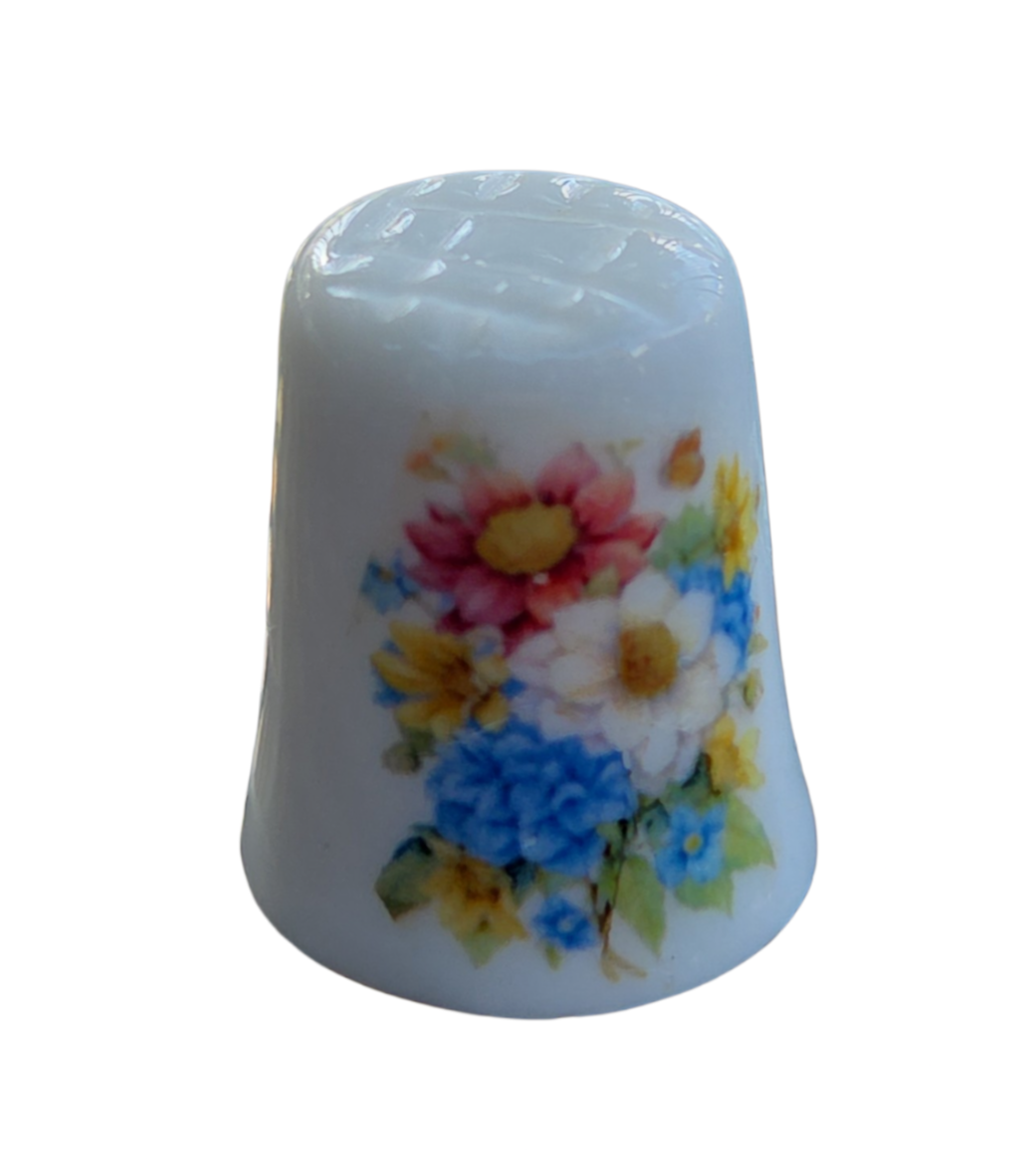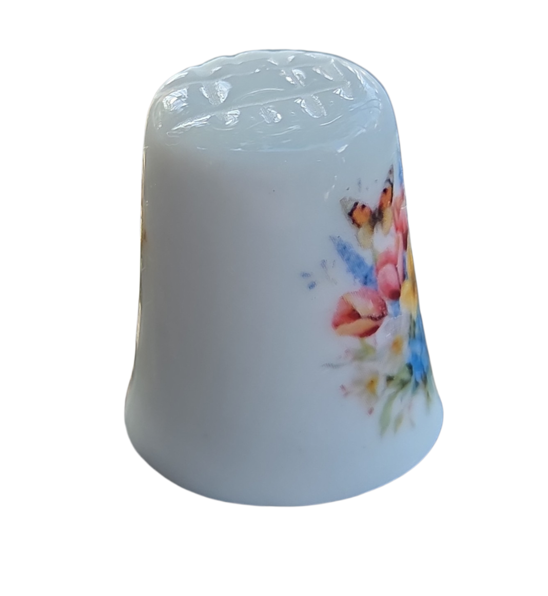 Este dedal em porcelana é uma peça clássica e vibrante, ideal para quem busca itens com temática de natureza e jardim. A ilustração central combina uma diversidade de cores e elementos, tornando-a uma peça alegre e rica em detalhes para colecionismo ou decoração.