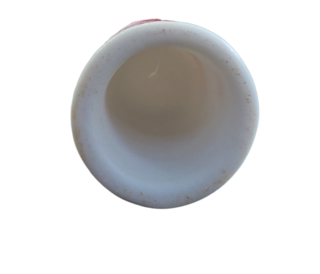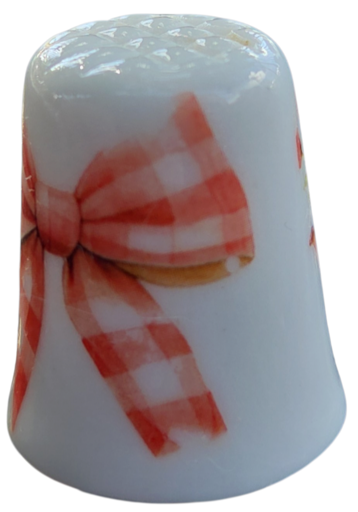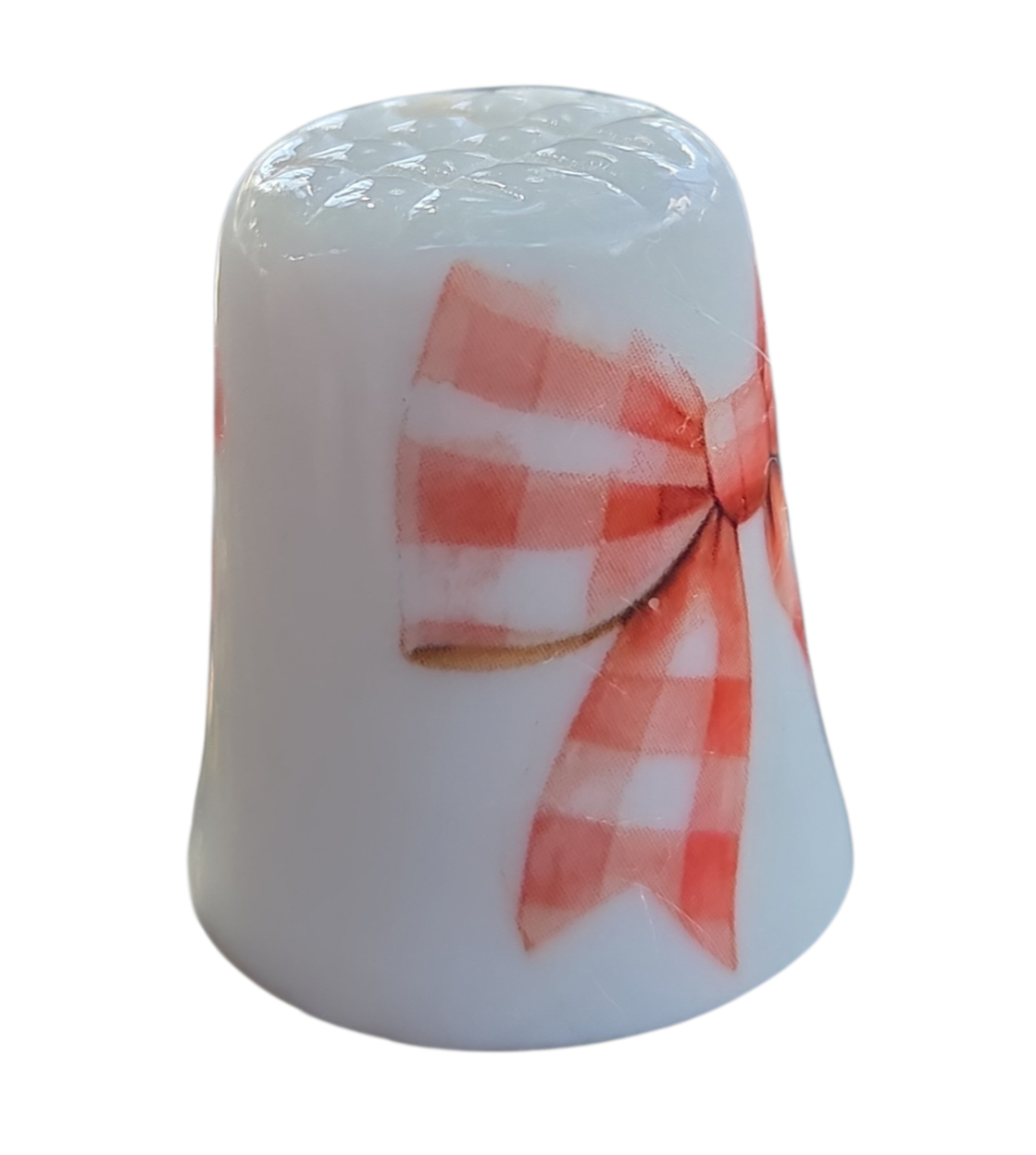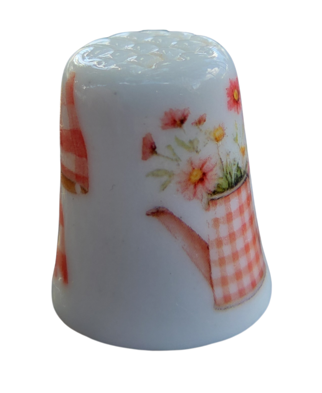 Este delicado dedal em porcelana branca destaca-se pelo seu design romântico e detalhes que remetem ao estilo shabby chic. A peça apresenta uma composição artística em duas faces de um lado, um regador vintage ornamentado com flores campestres; do outro, um laço clássico com estampa xadrez.