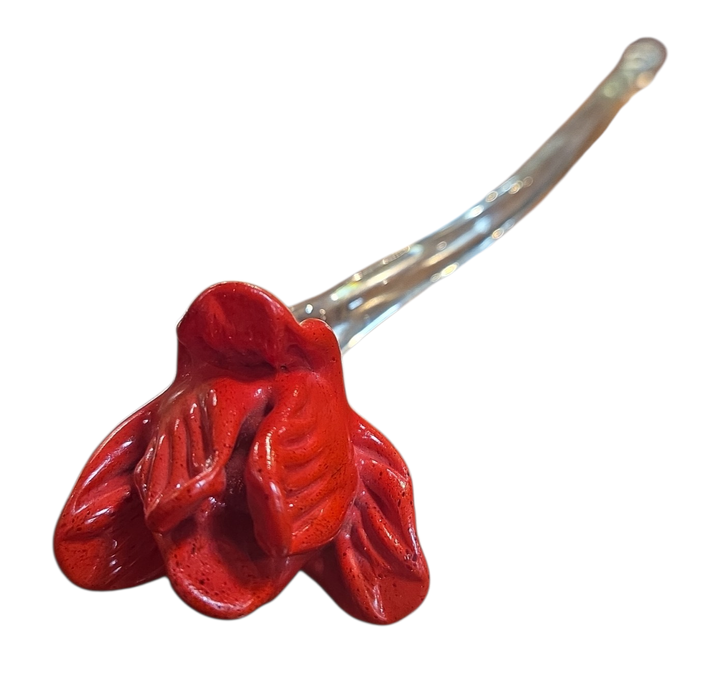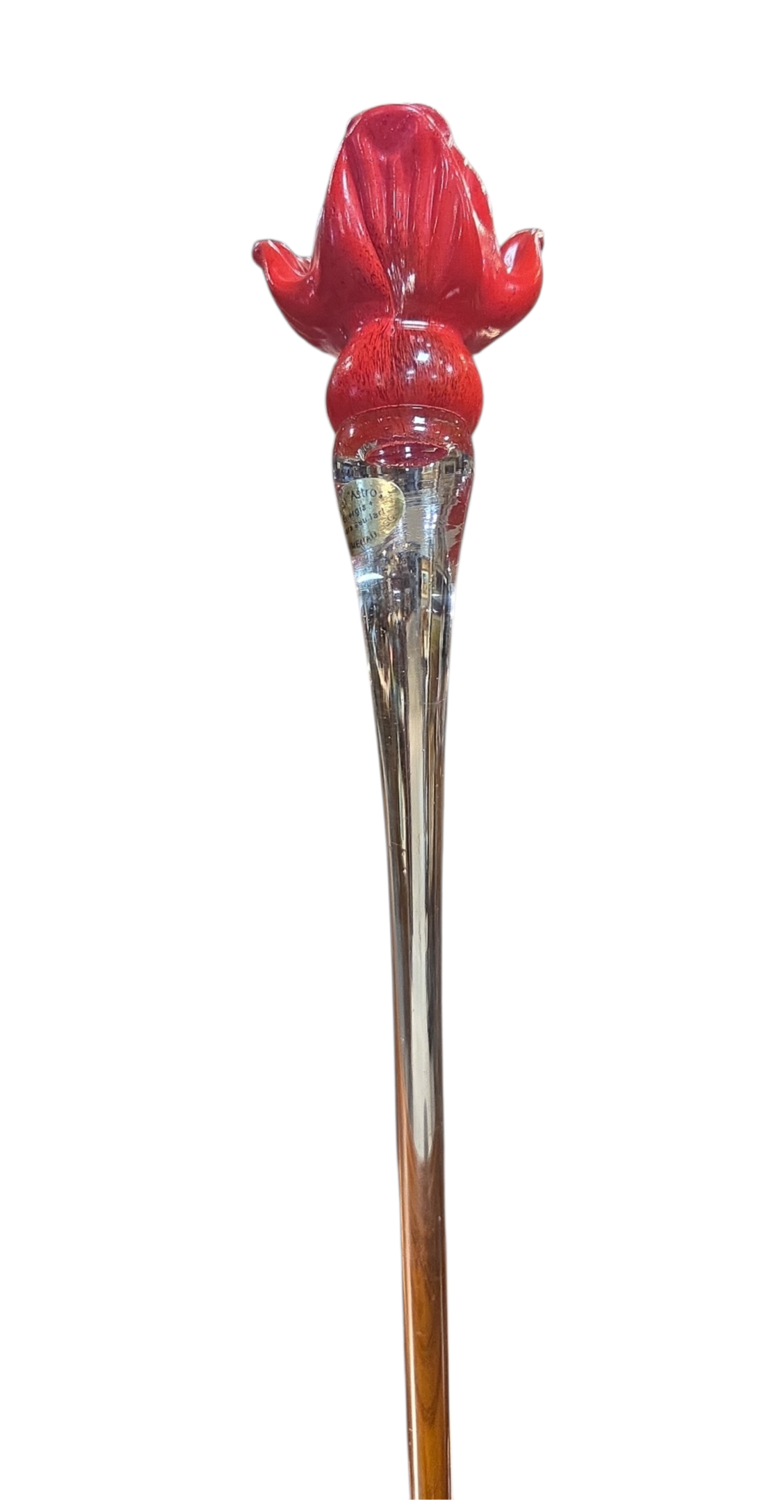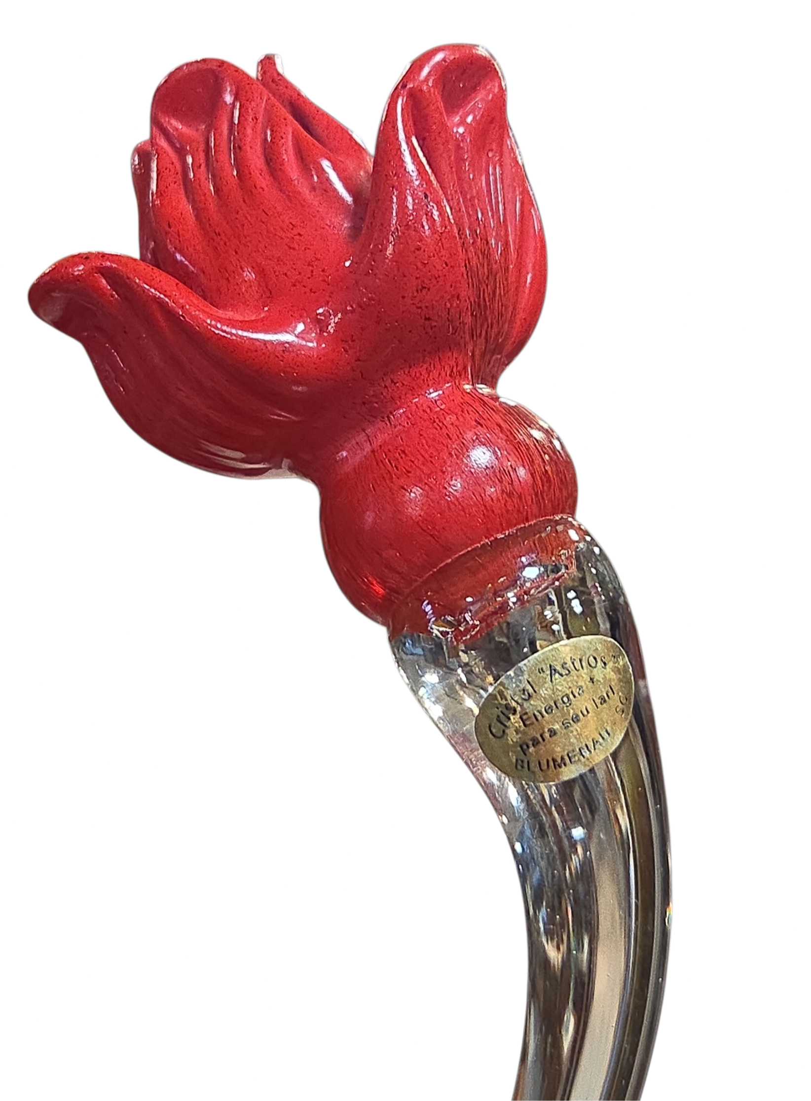 Exclusiva escultura artística em cristal tipo Murano, fabricada artesanalmente pela renomada marca brasileira "Astros", sediada em Blumenau, Santa Catarina. Uma peça vintage que preserva a etiqueta original de fábrica, atestando sua procedência e autenticidade.