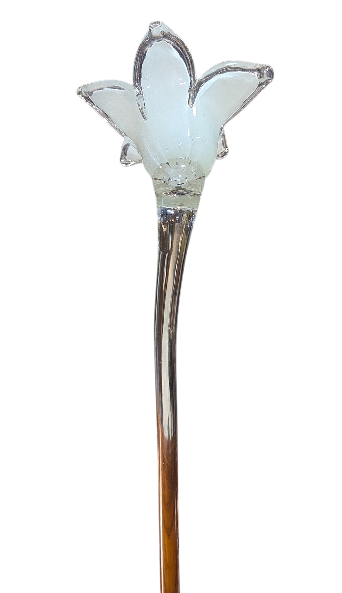 Elegante flor decorativa artesanal, modelada à mão em cristal Murano. Esta peça une o charme do design orgânico com a sofisticação da técnica vidreira, ideal para compor arranjos ou ser o destaque solitário em um vaso fino.