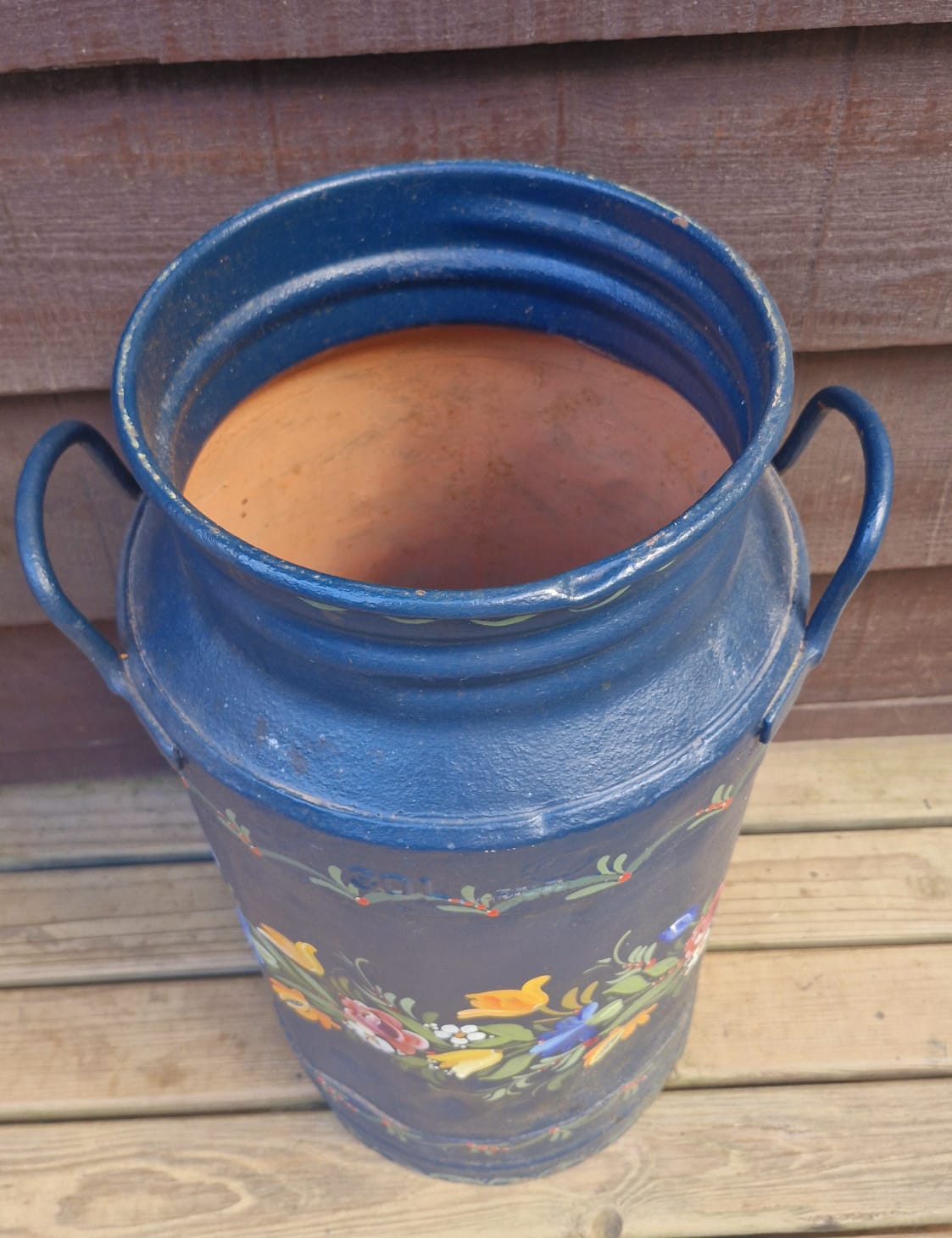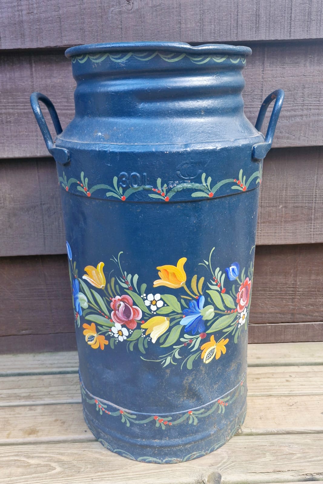 Originalmente utilizados para o transporte de leite, esses galões de metal (ferro ou alumínio) tornaram-se itens de decoração rústica muito populares. A pintura característica, de origem camponesa alemã e austríaca, frequentemente apresenta motivos de flores, pássaros e arabescos.