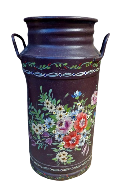 Originalmente utilizados para o transporte de leite, esses galões de metal (ferro ou alumínio) tornaram-se itens de decoração rústica muito populares. A pintura característica, de origem camponesa alemã e austríaca, frequentemente apresenta motivos de flores, pássaros e arabescos. Detalhes do Item: