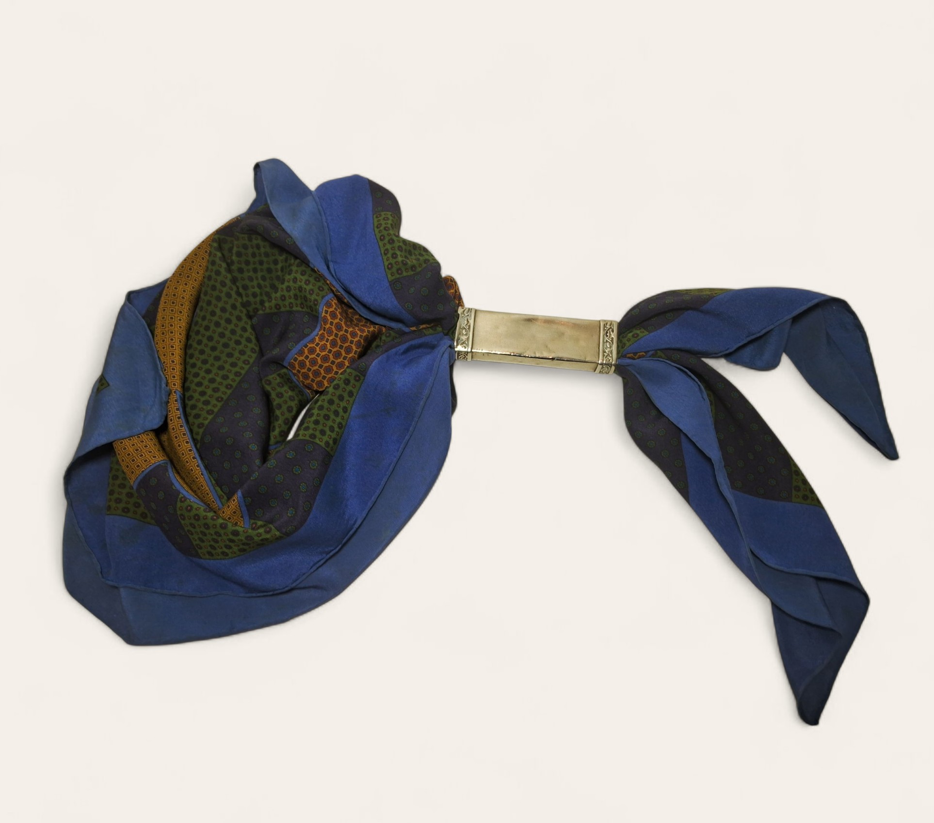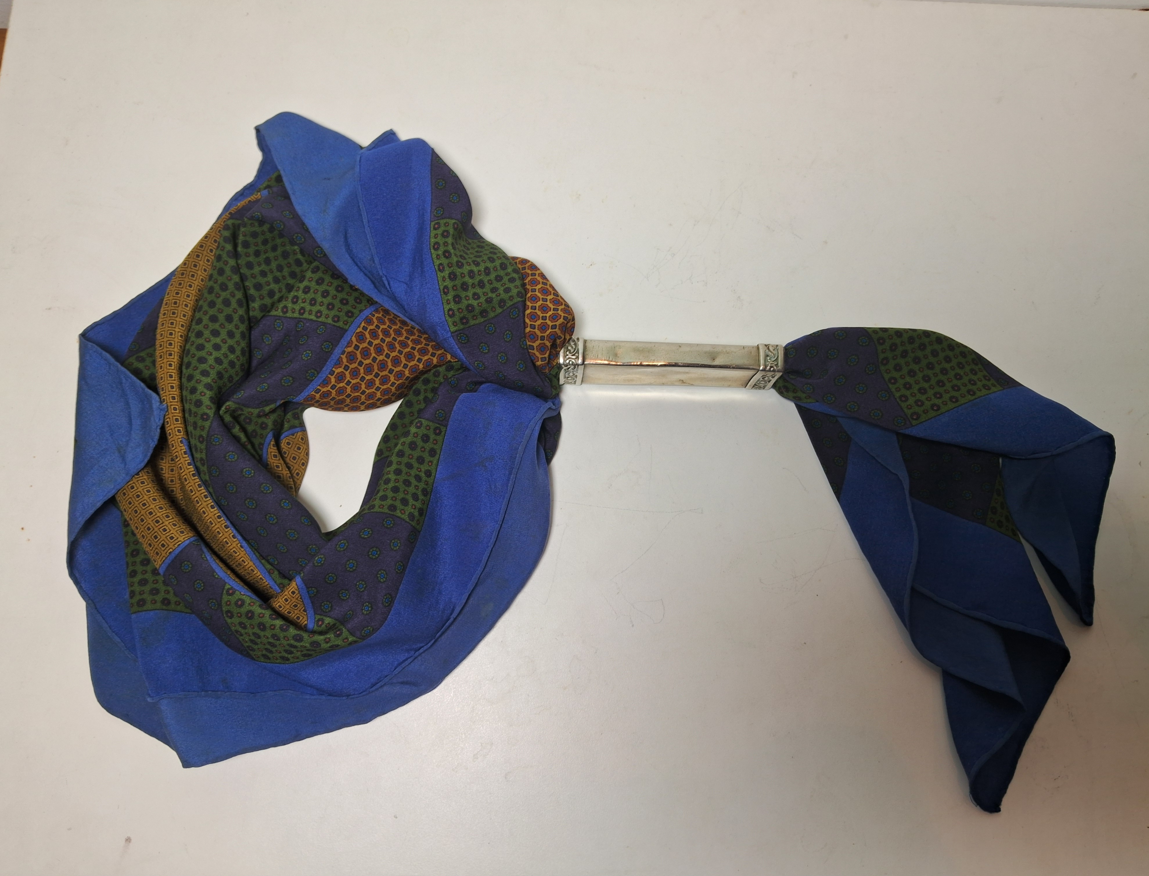 Lindo, elegante e autêntico passador de lenço, acessório originário dos habitantes dos pampas gaúchos ou de países vizinhos do Sul. Manufatura artesanal em alpaca decorada nas bordas. Fica muito bem como peça diferenciada em reuso como um broche, complementando lenços lisos ou estampados em noite ou dia, em modelos clássicos ou moderninhos. (Lenço não incluído)