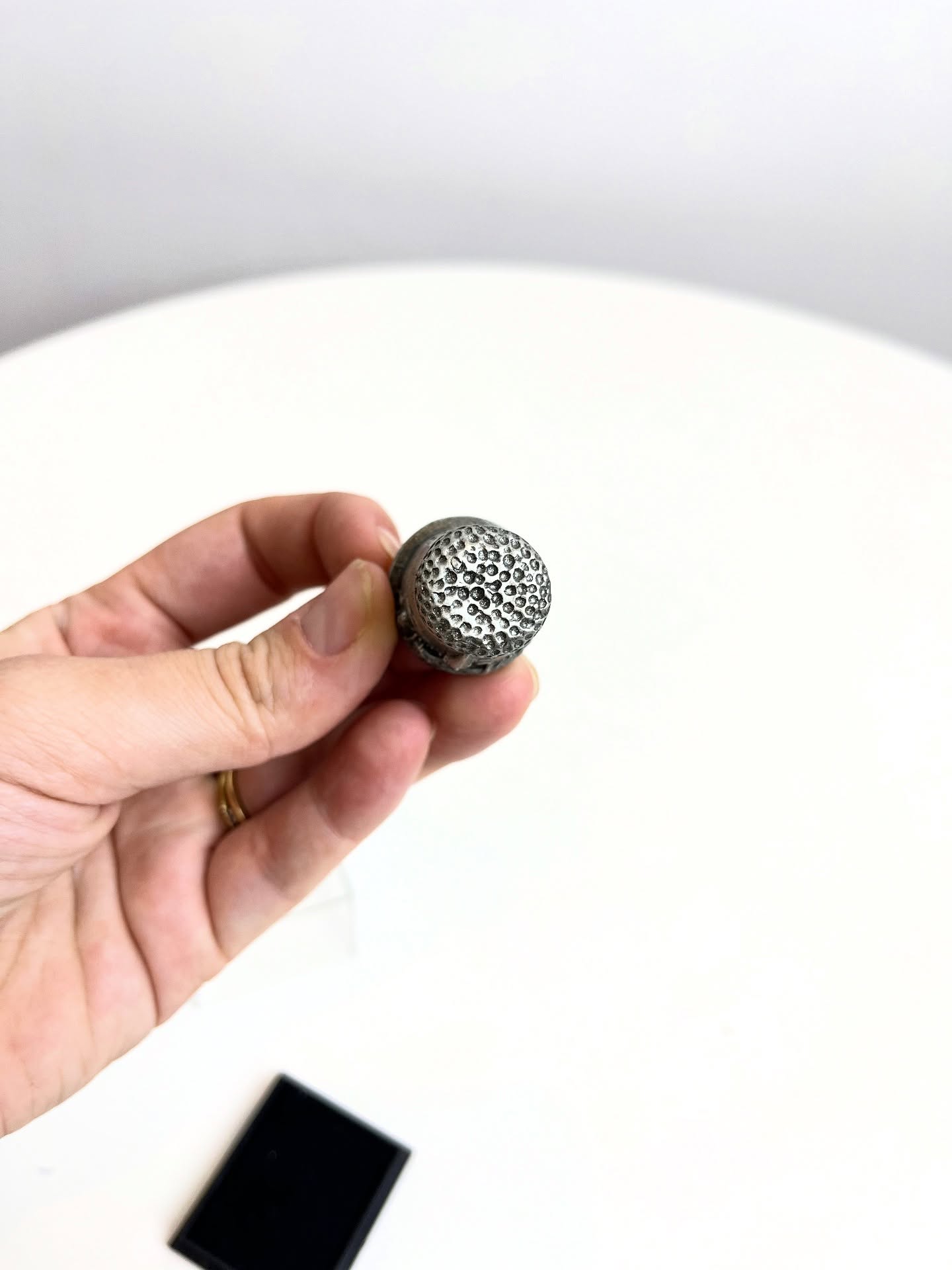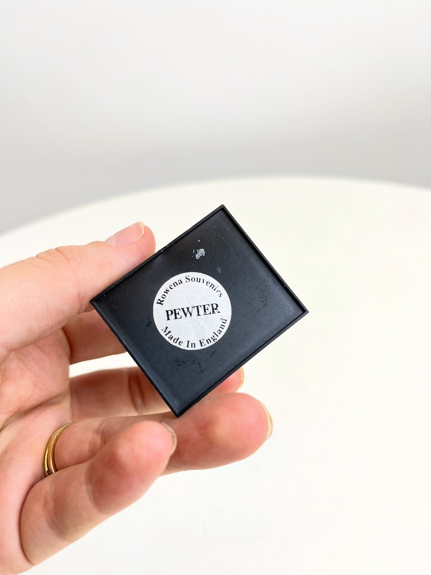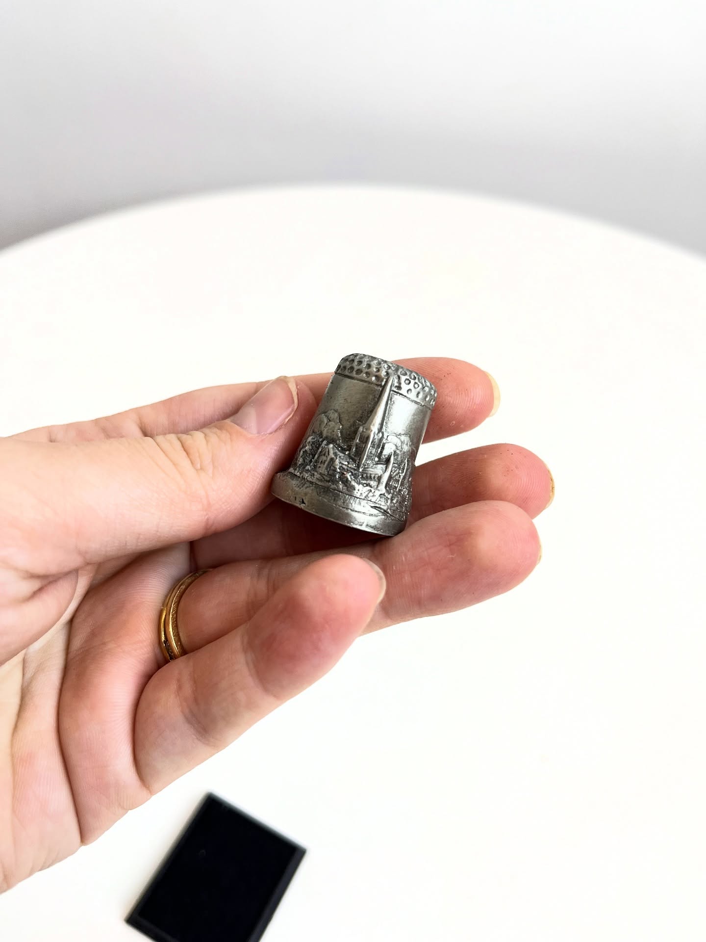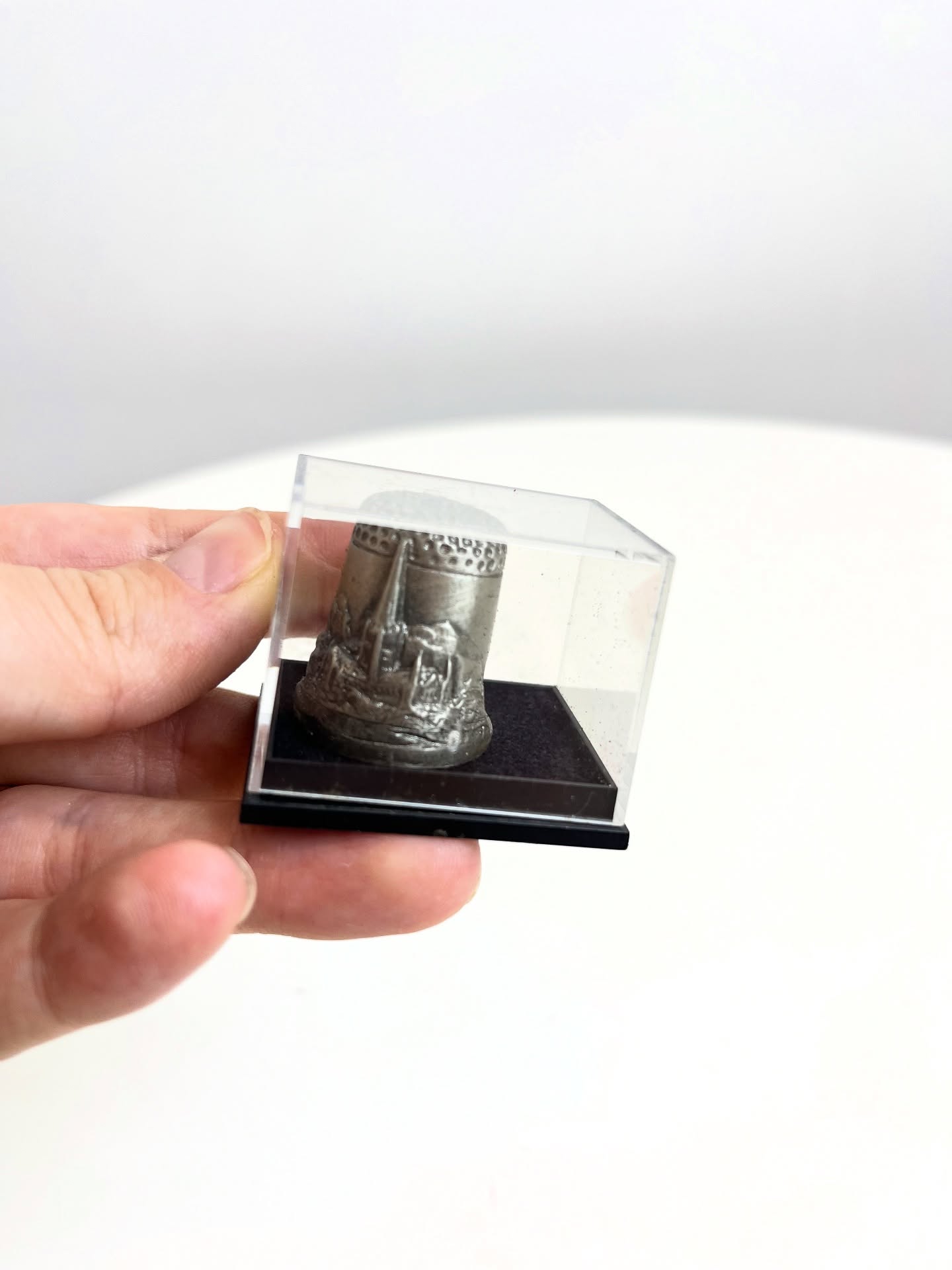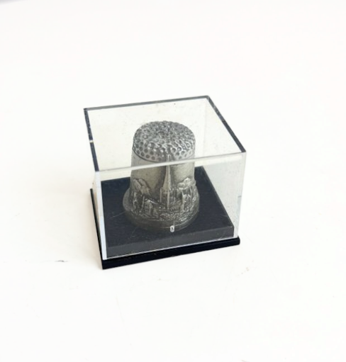 Dedal em chumbo na caixinha de acrílico. Souvenir inglês.
