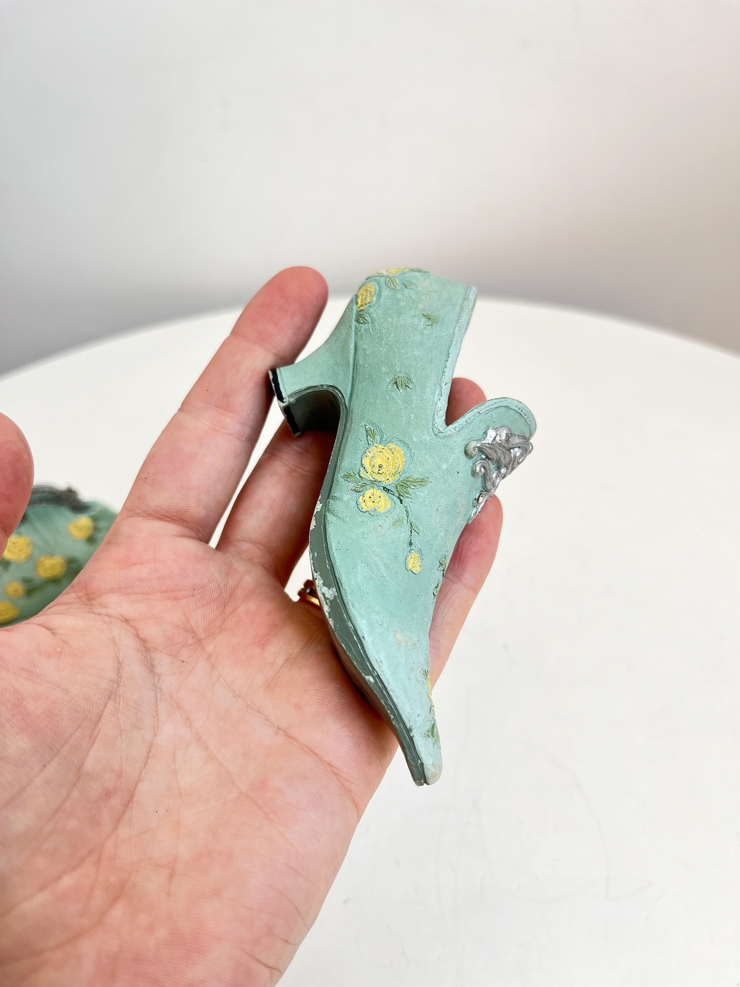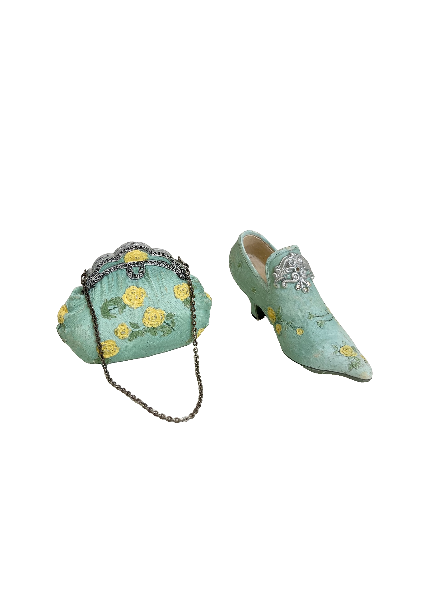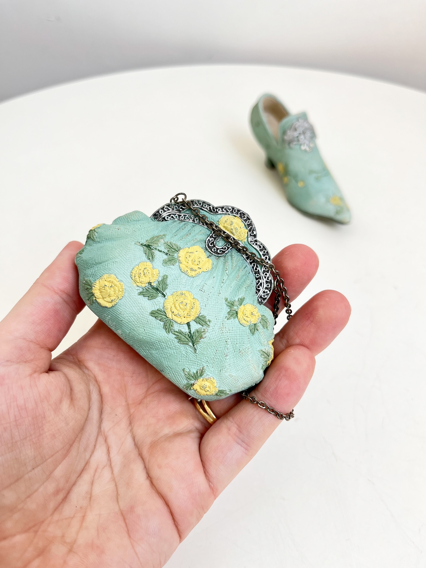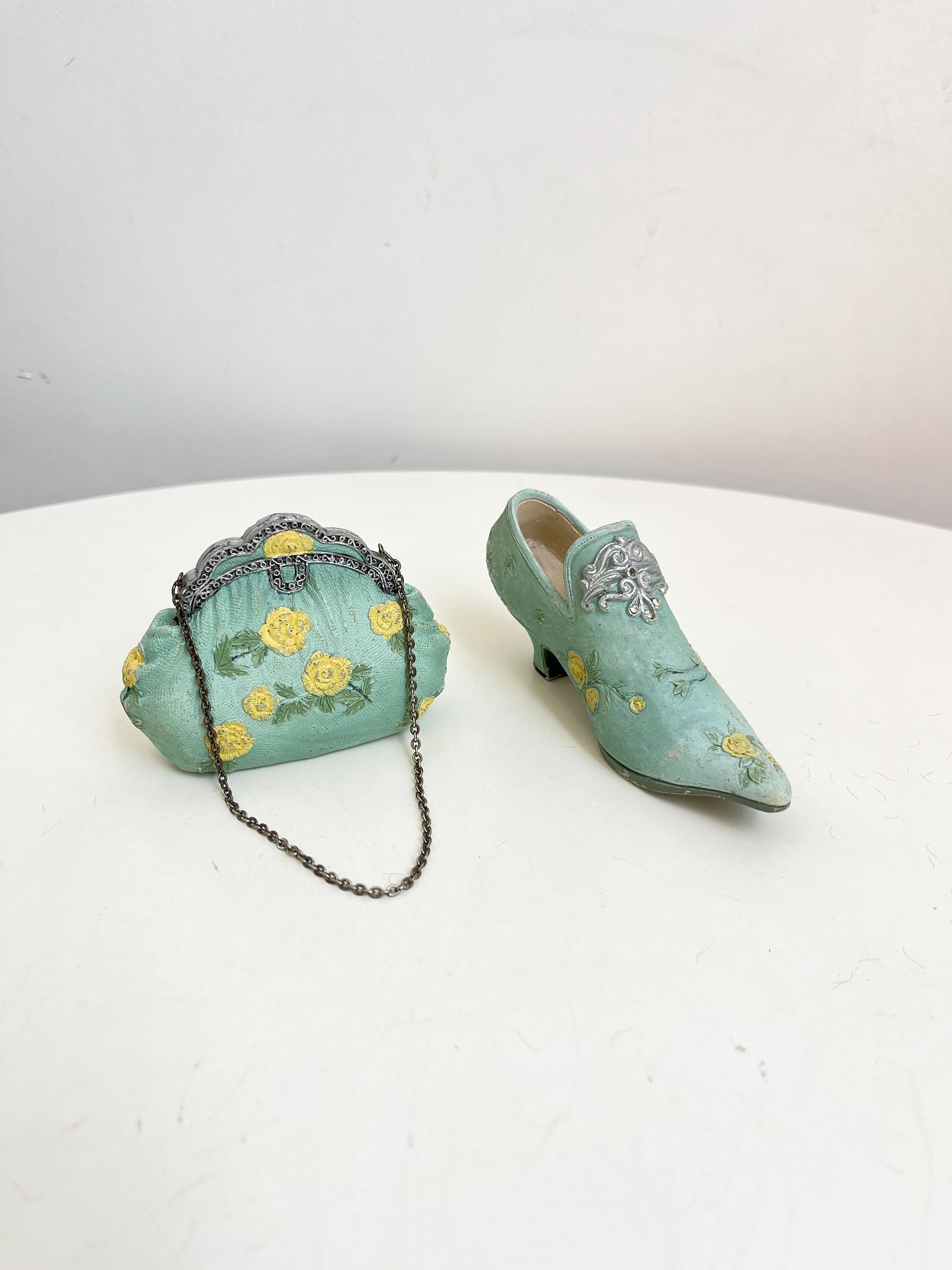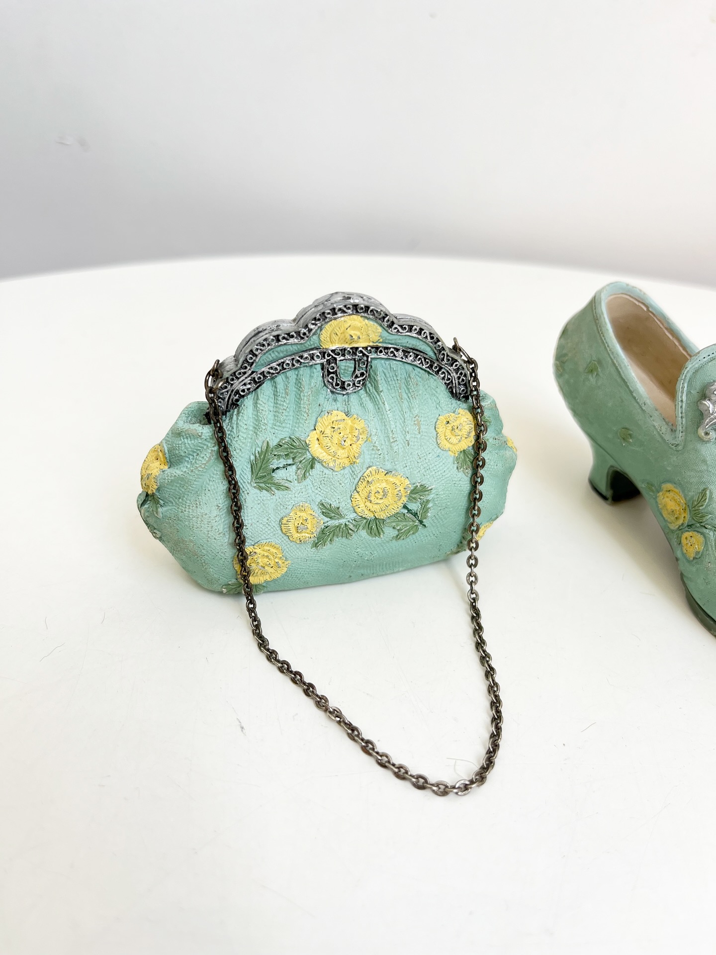 Bolsa e sapatinho colecionáveis em resina. Leves marcas do tempo e uso como mostrado nas fotos.