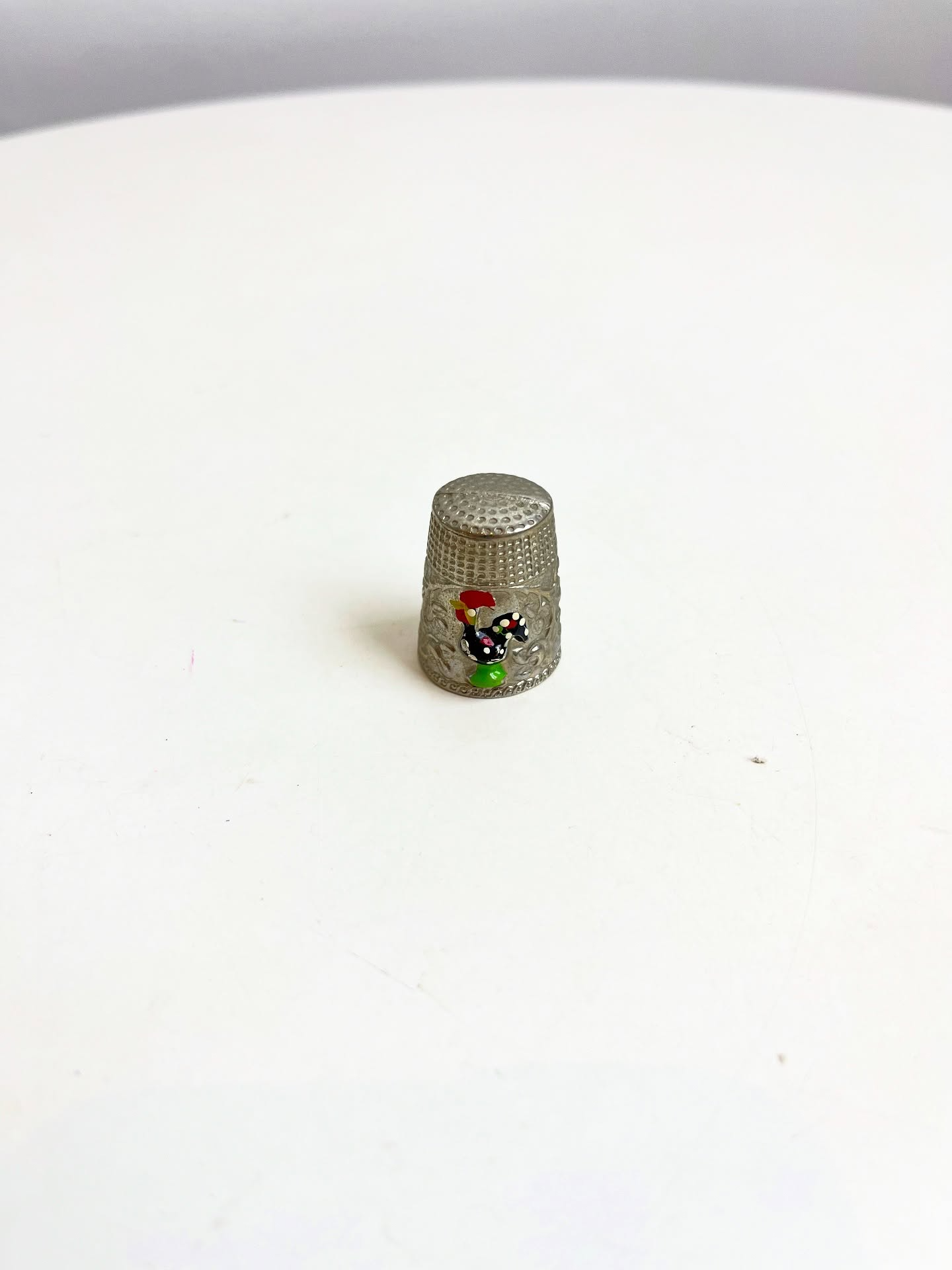 Dedal em metal com desenho de galo português. Leves marcas do tempo e uso.