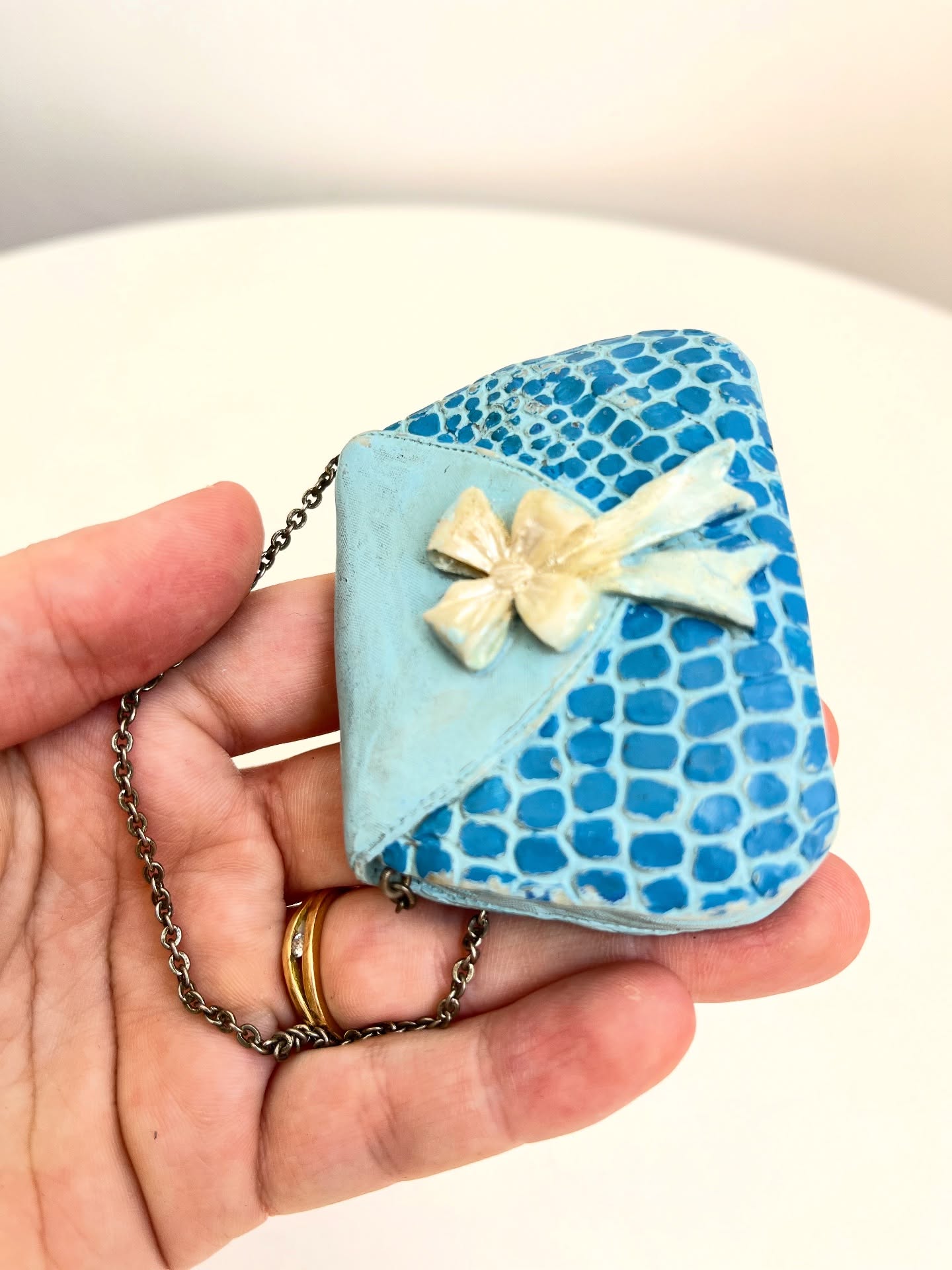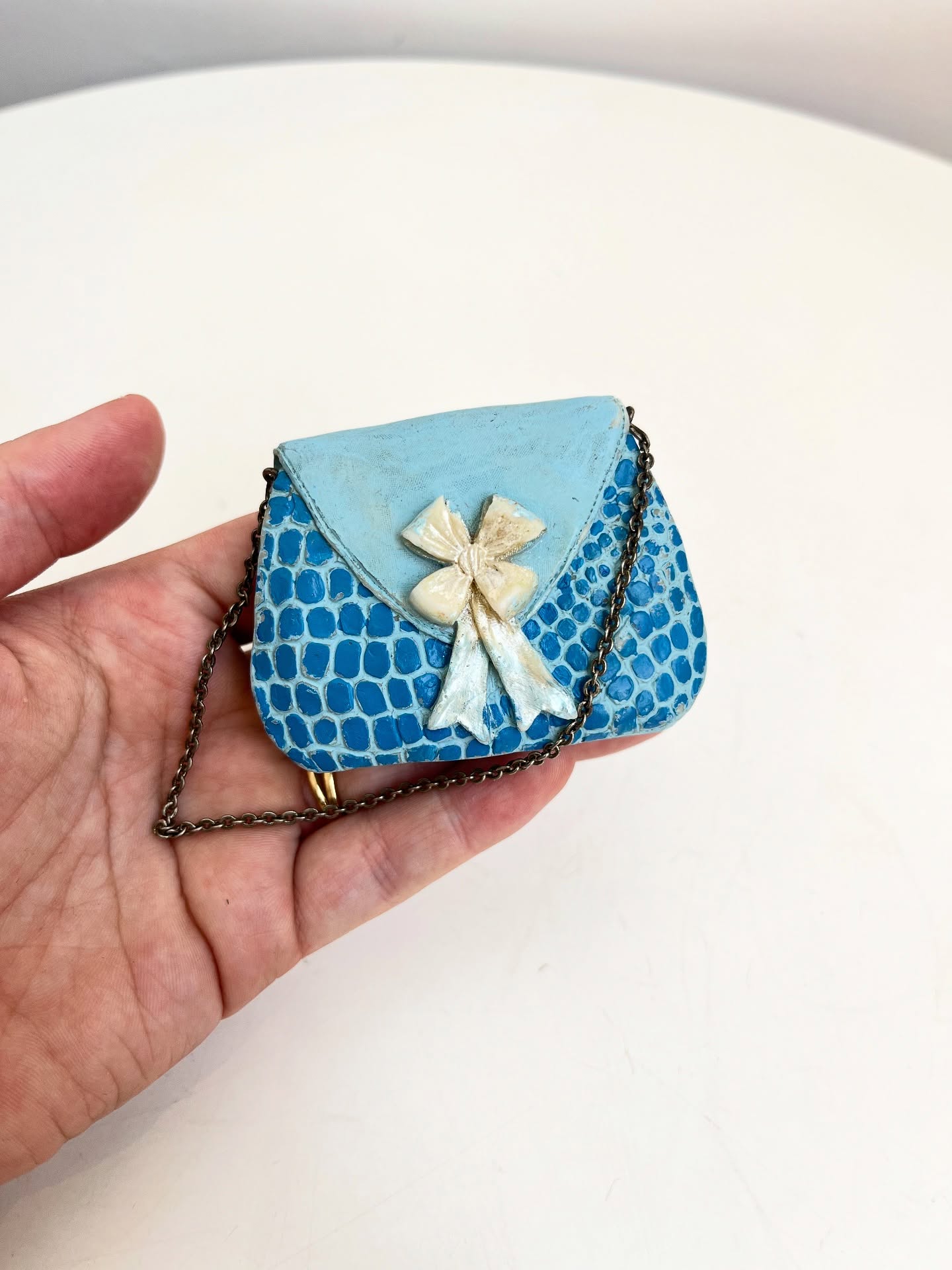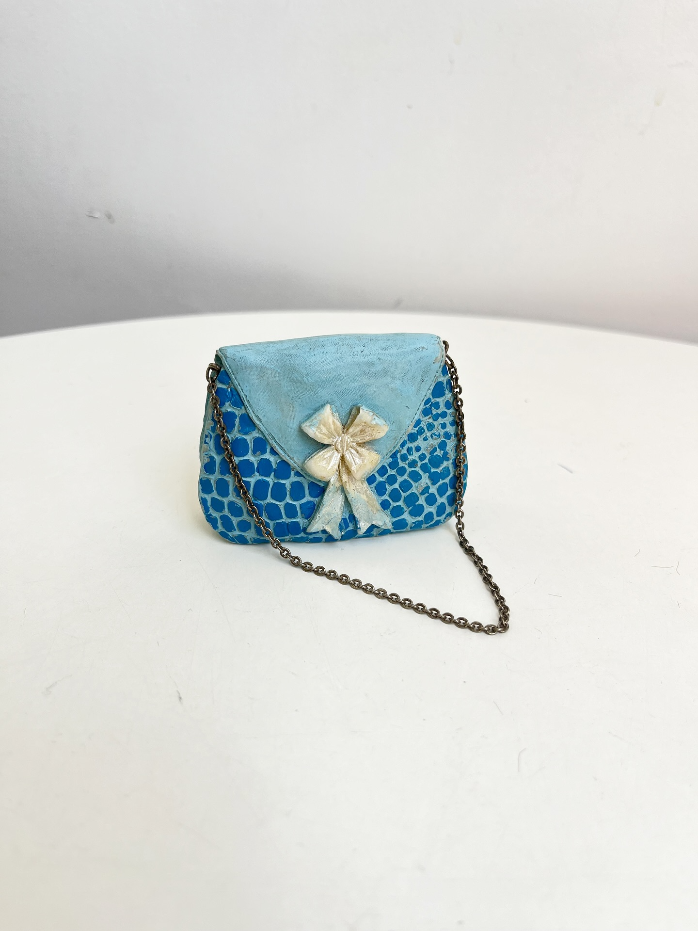 Bolsinha colecionável em resina com alça em corrente metálica. Apresenta desgastes na pintura como nas fotos.